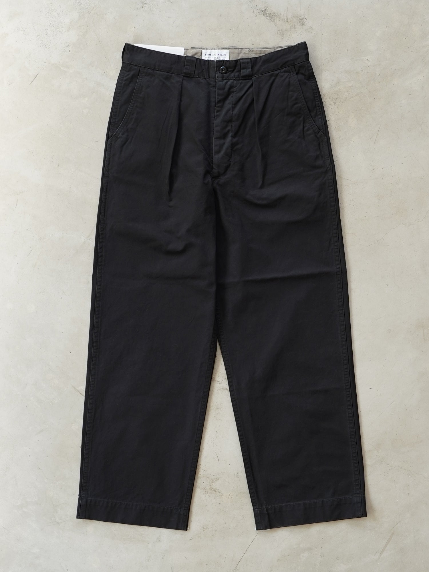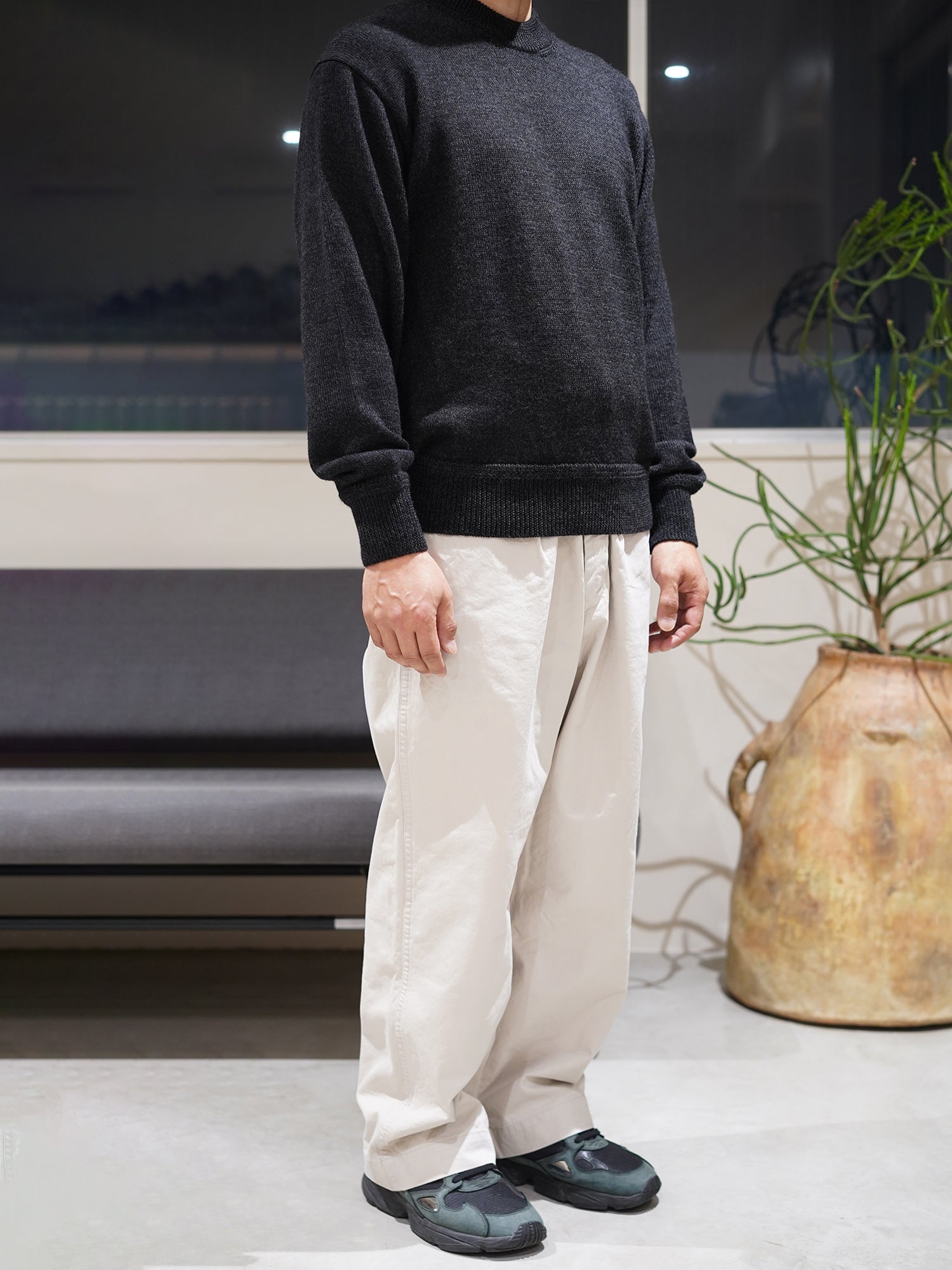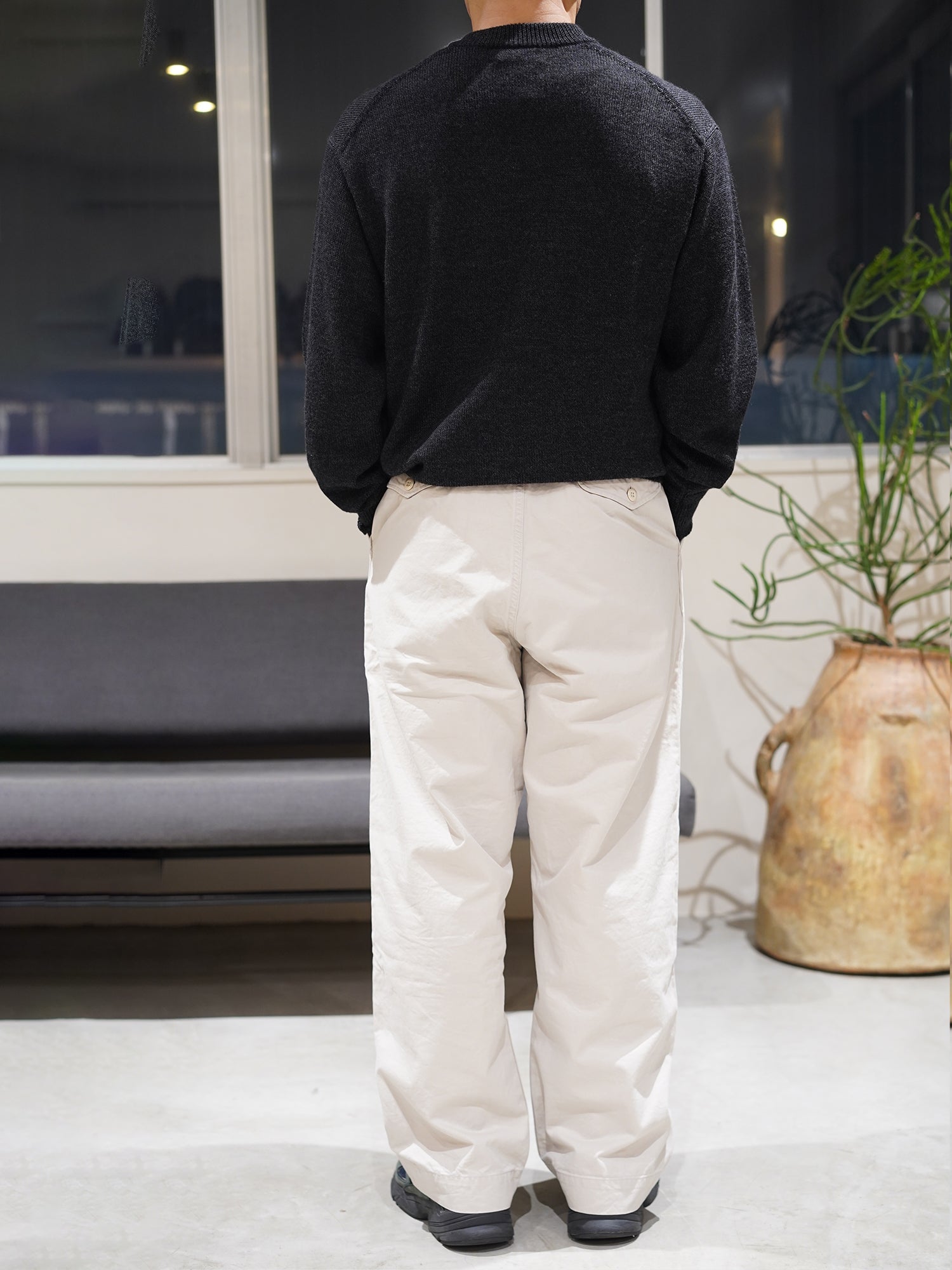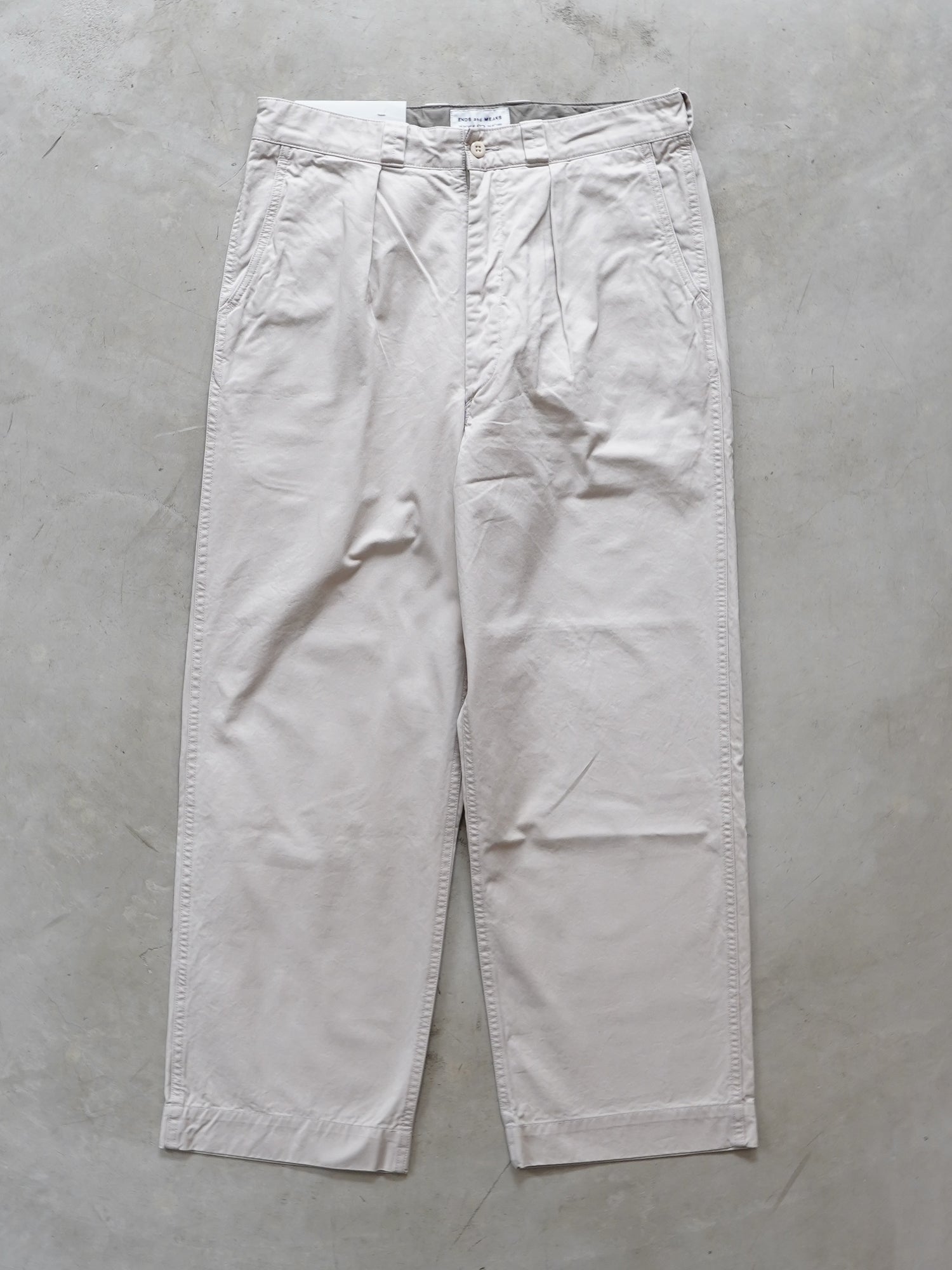 摩擦や裂けに非常に強いチノツイルを使用 。ほど良くコシがありながらもしなやかで柔らかい生地は履きこむほどに馴染み良い表情変化していきます。シルエットは少しワイドめなストレートタイプ。ワンタック仕様。