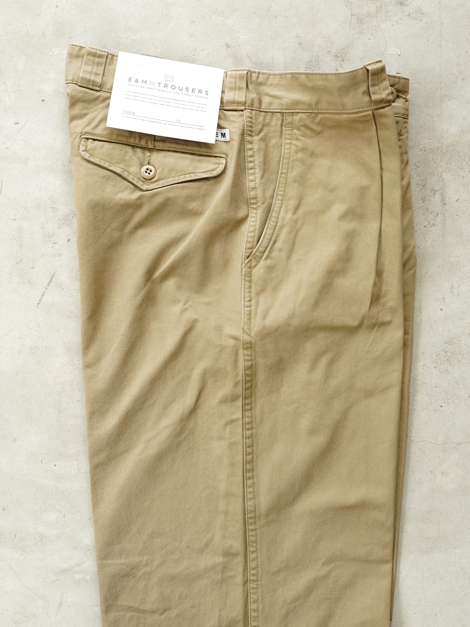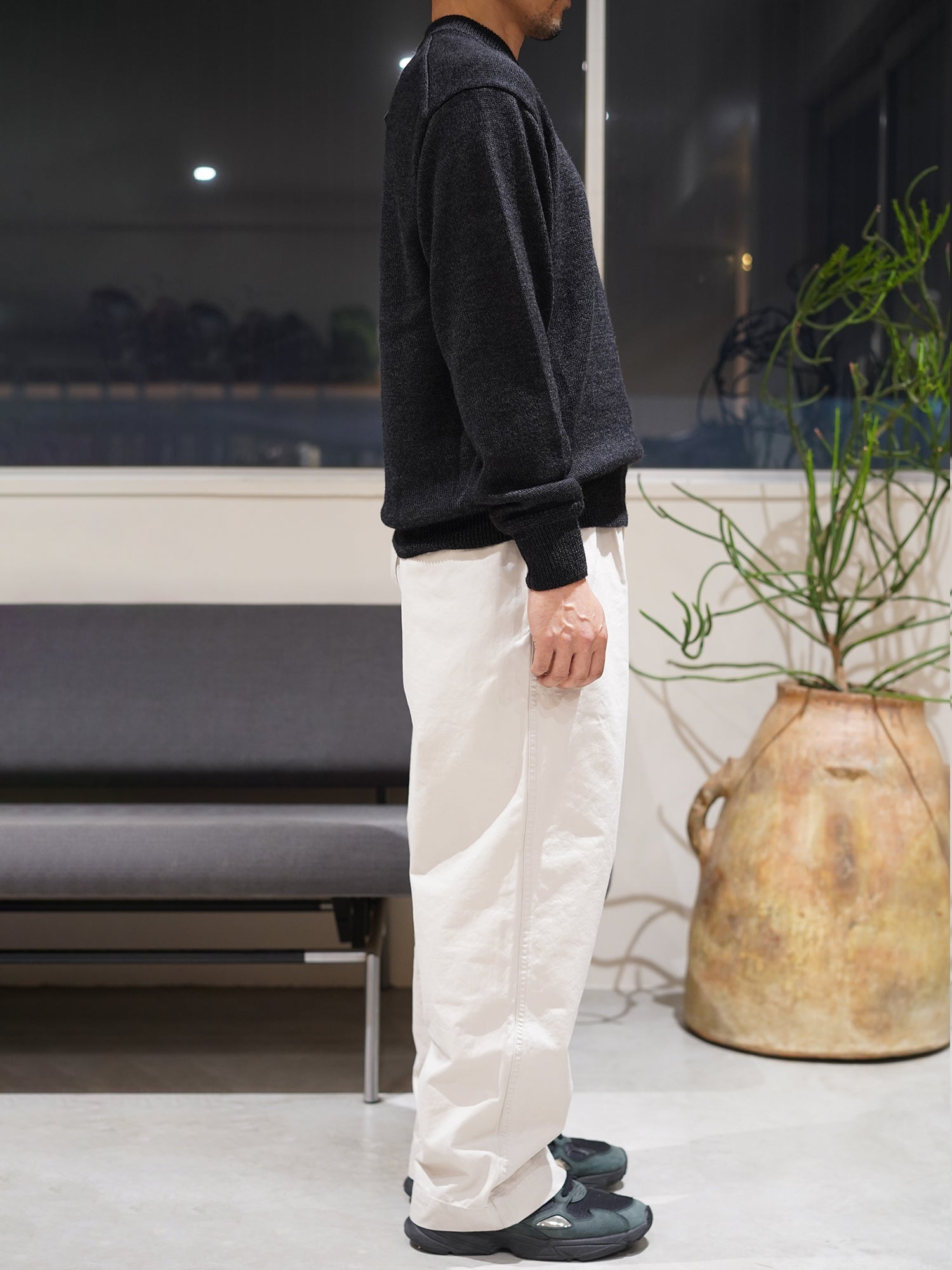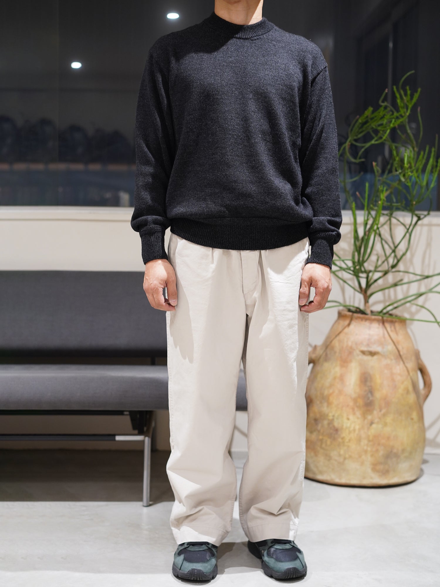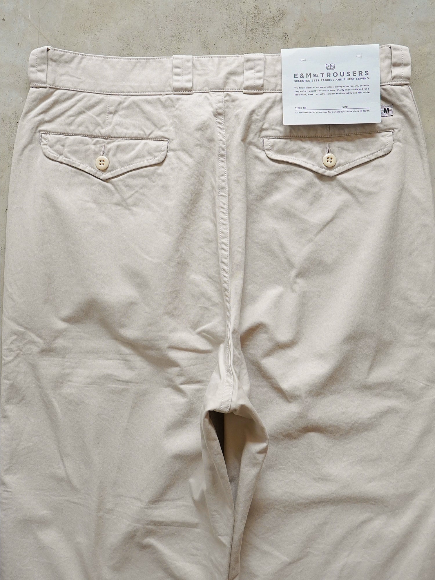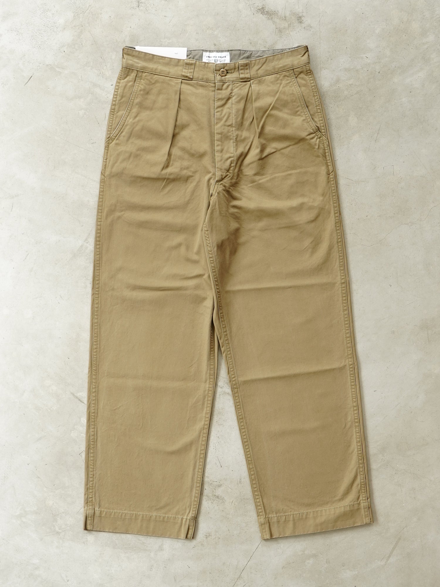 摩擦や裂けに非常に強いチノツイルを使用 。ほど良くコシがありながらもしなやかで柔らかい生地は履きこむほどに馴染み良い表情変化していきます。シルエットは少しワイドめなストレートタイプ。ワンタック仕様。