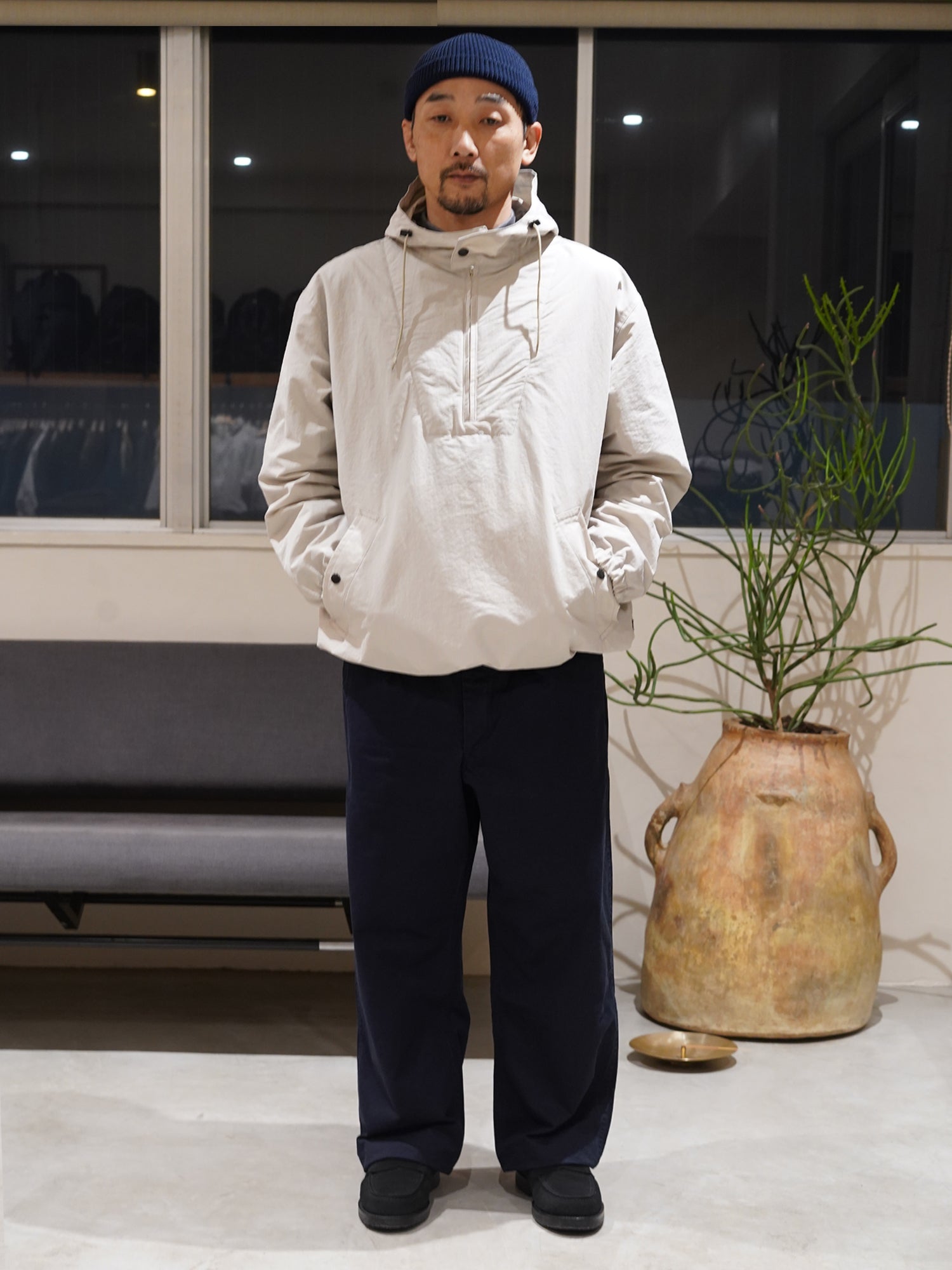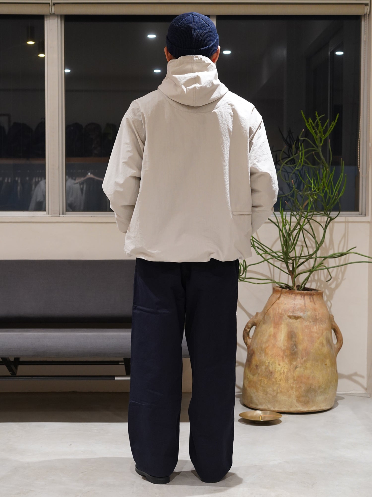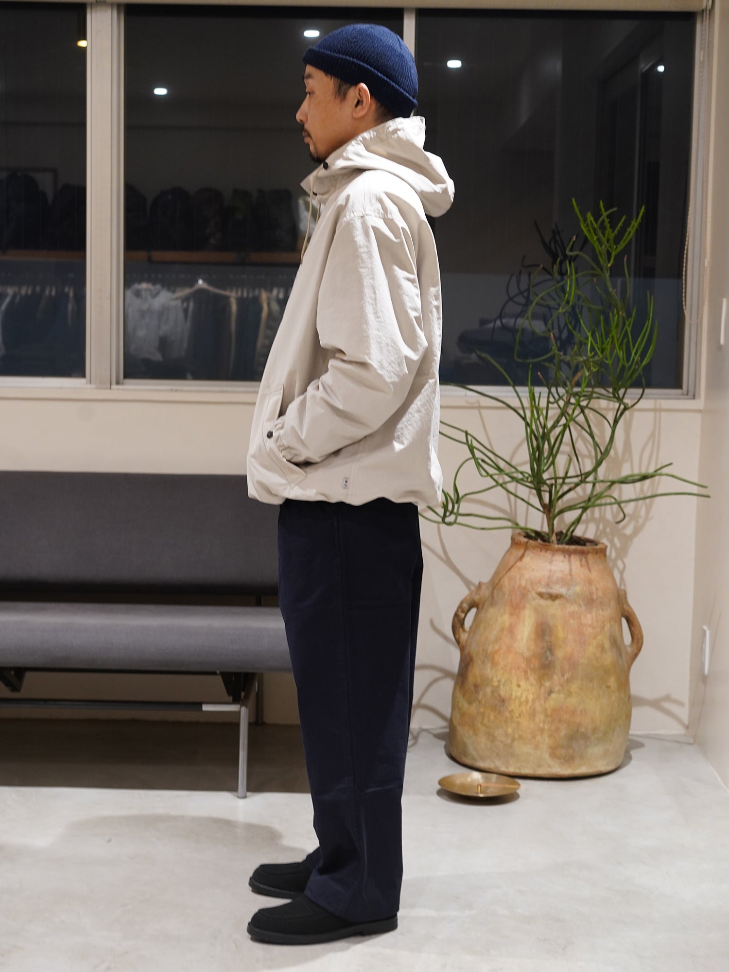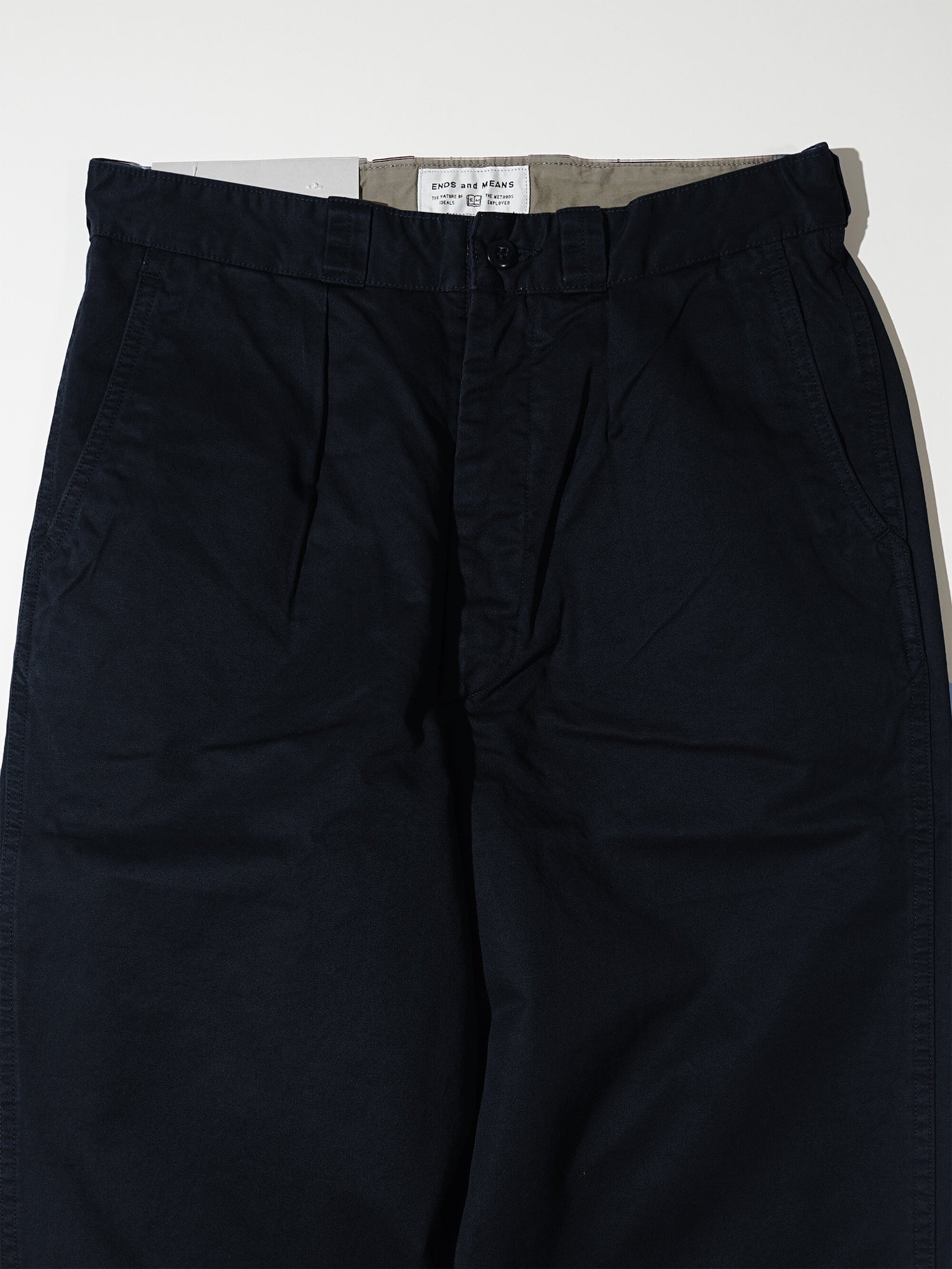 摩擦や裂けに非常に強いチノツイルを使用 。ほど良くコシがありながらもしなやかで柔らかい生地は履きこむほどに馴染み良い表情変化していきます。シルエットは少しワイドめなストレートタイプ。ワンタック仕様。