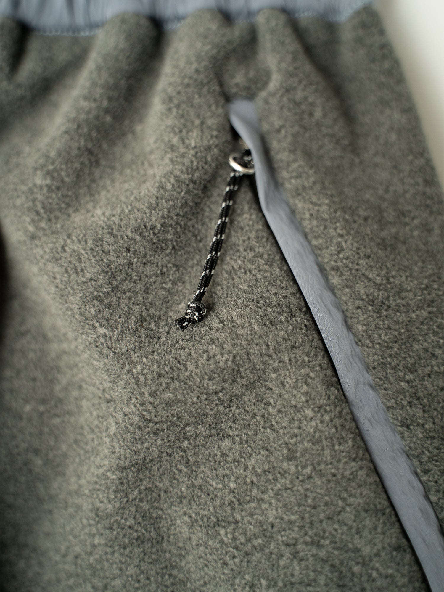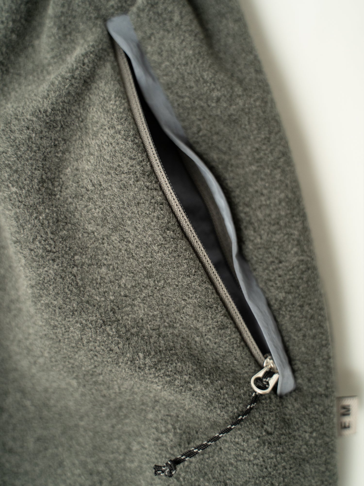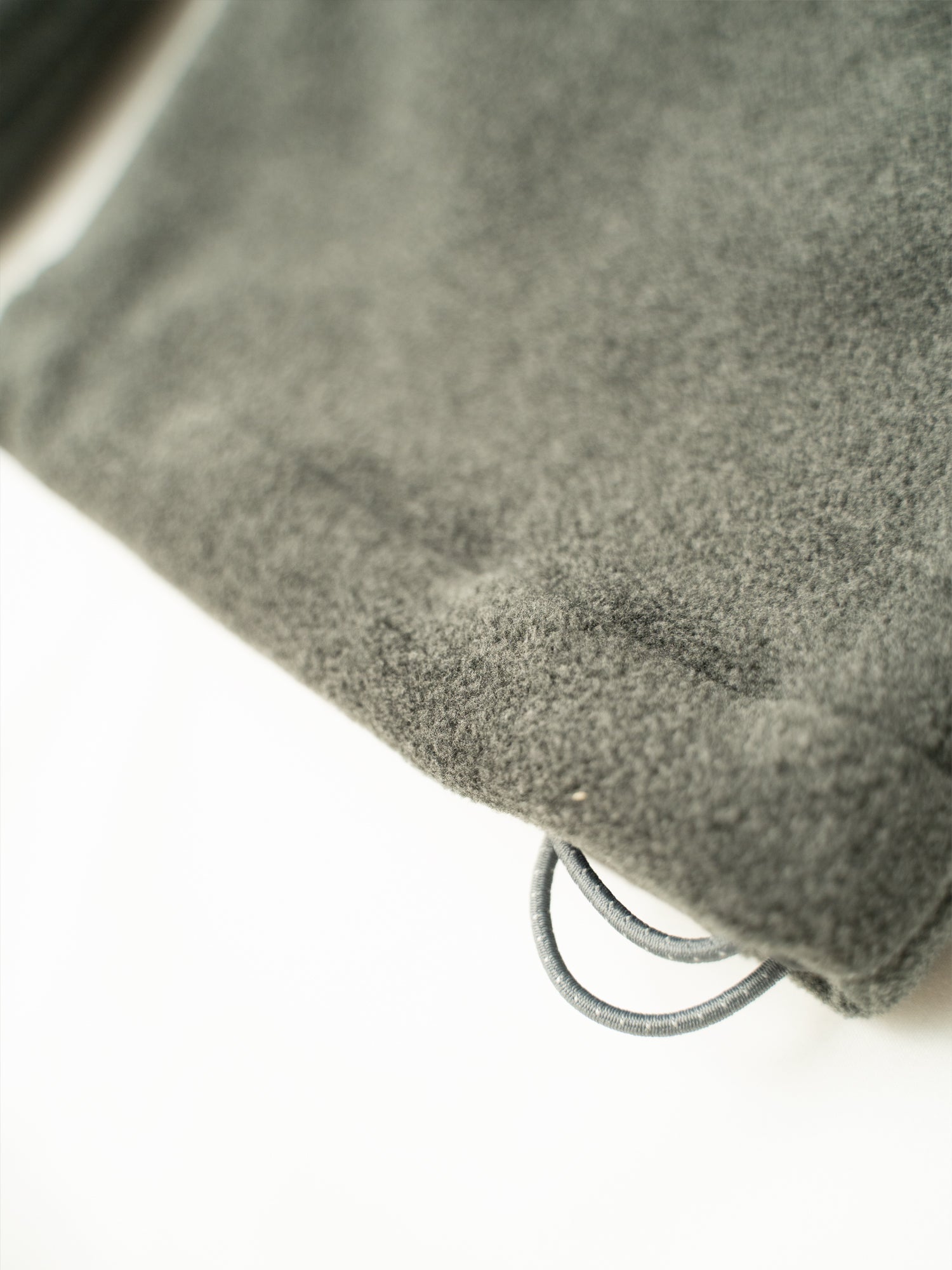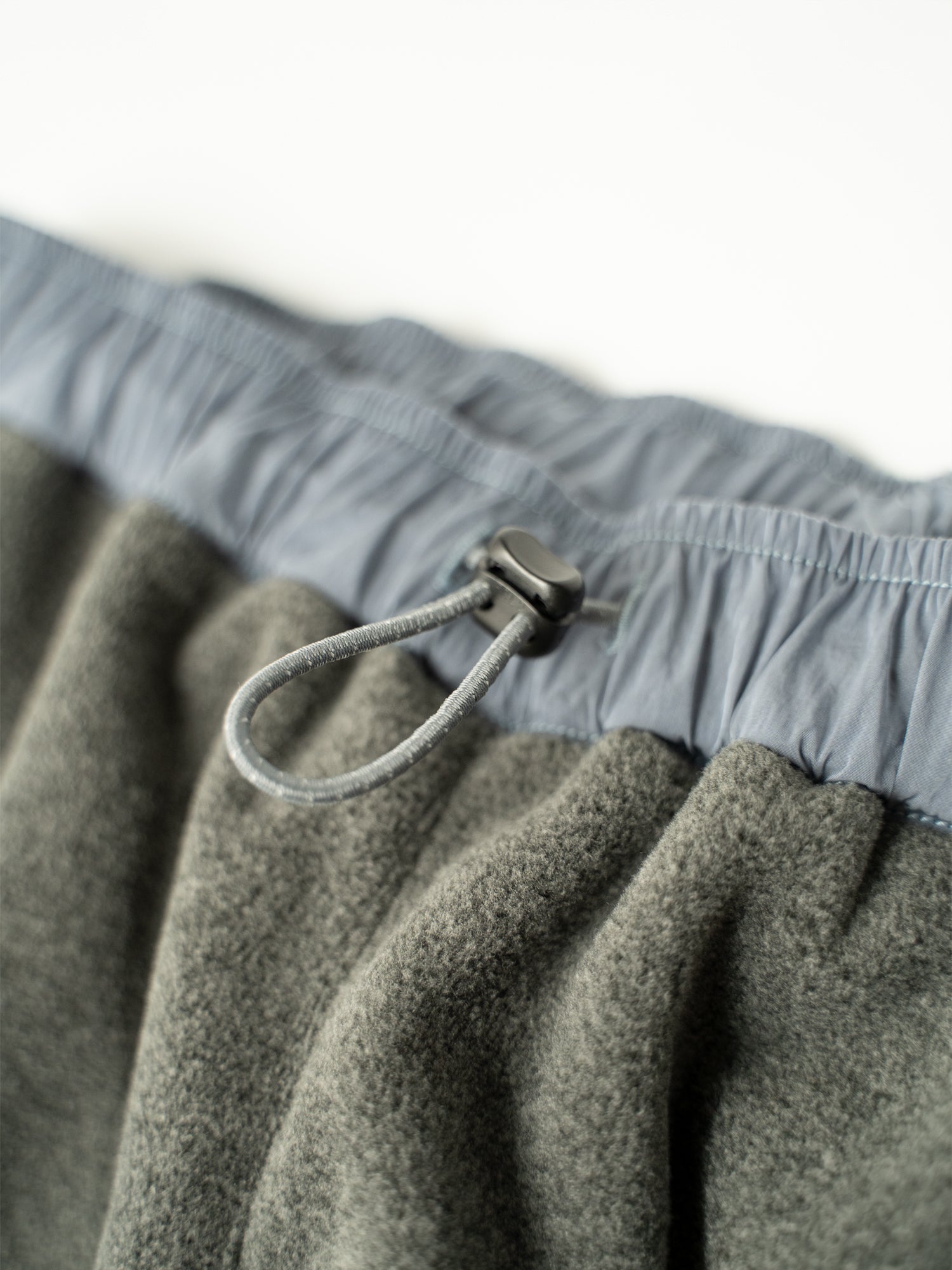 Reversible P/O Vestと同素材のPolartec®︎のフリースと縦糸に黒原着糸を使った上品な光沢があるナイロン生地を使用。裏地は総裏ポリエステルメッシュ。ウエストと裾はドローコードで調整可能。