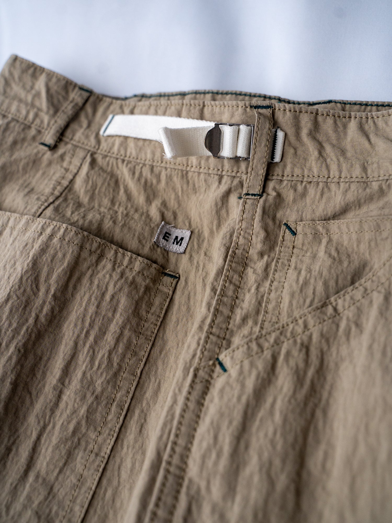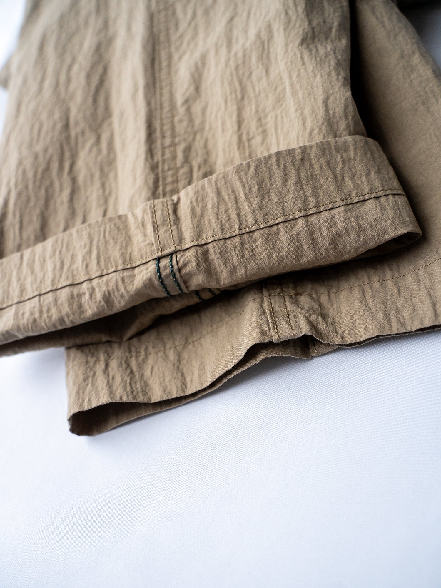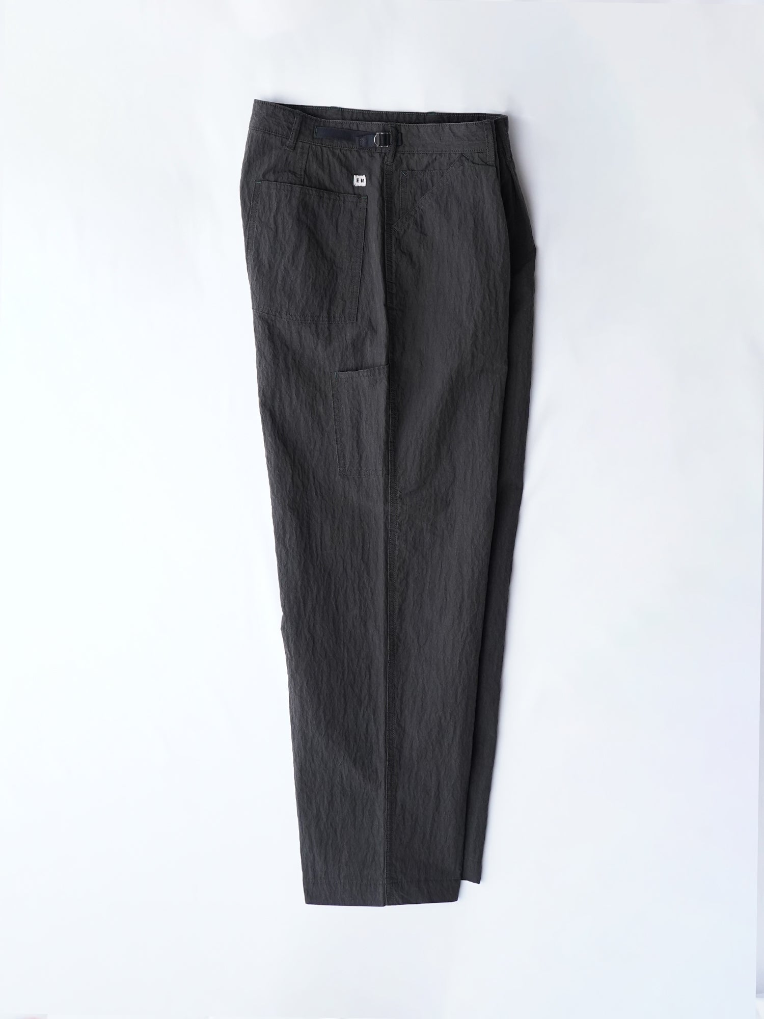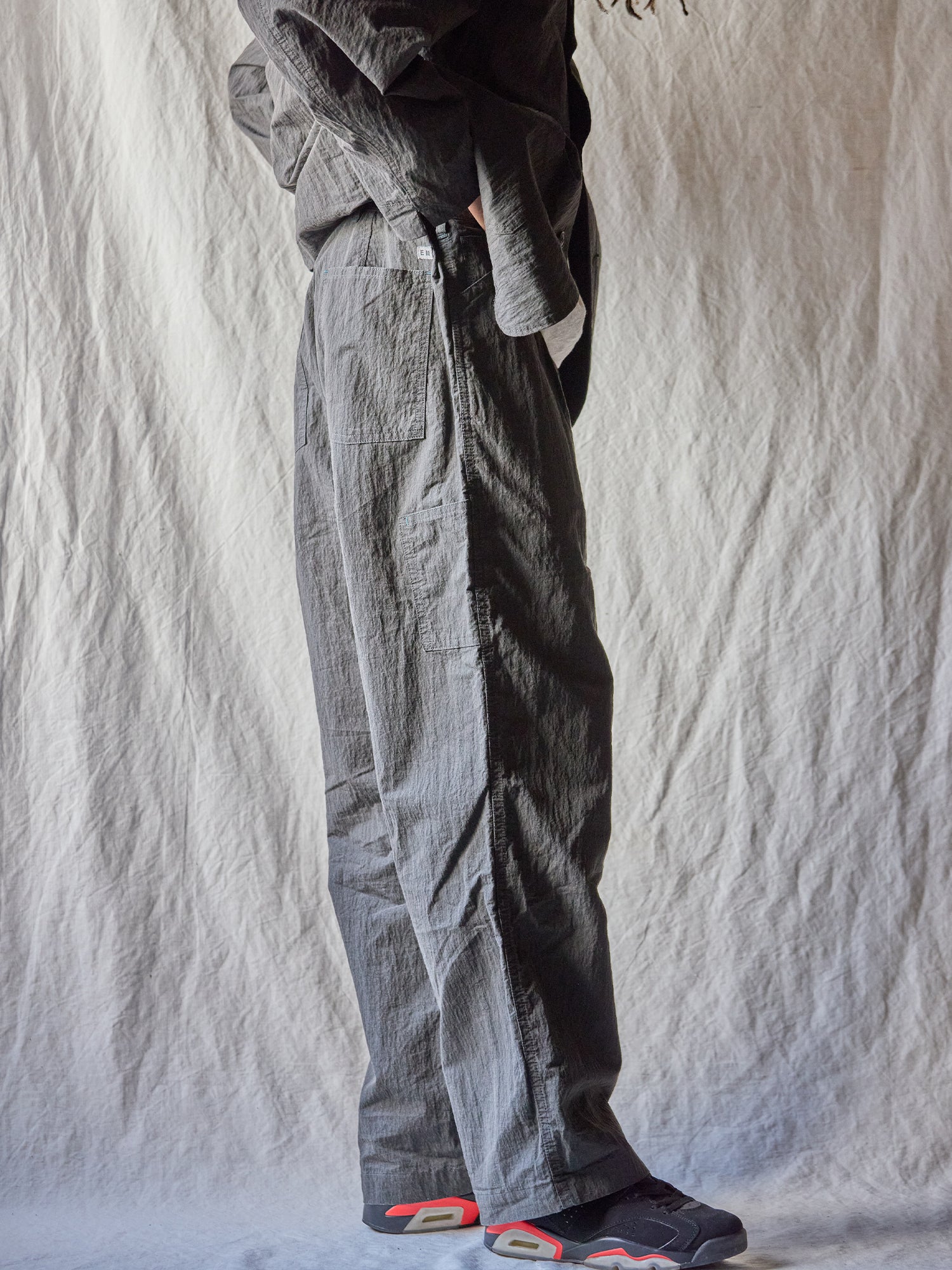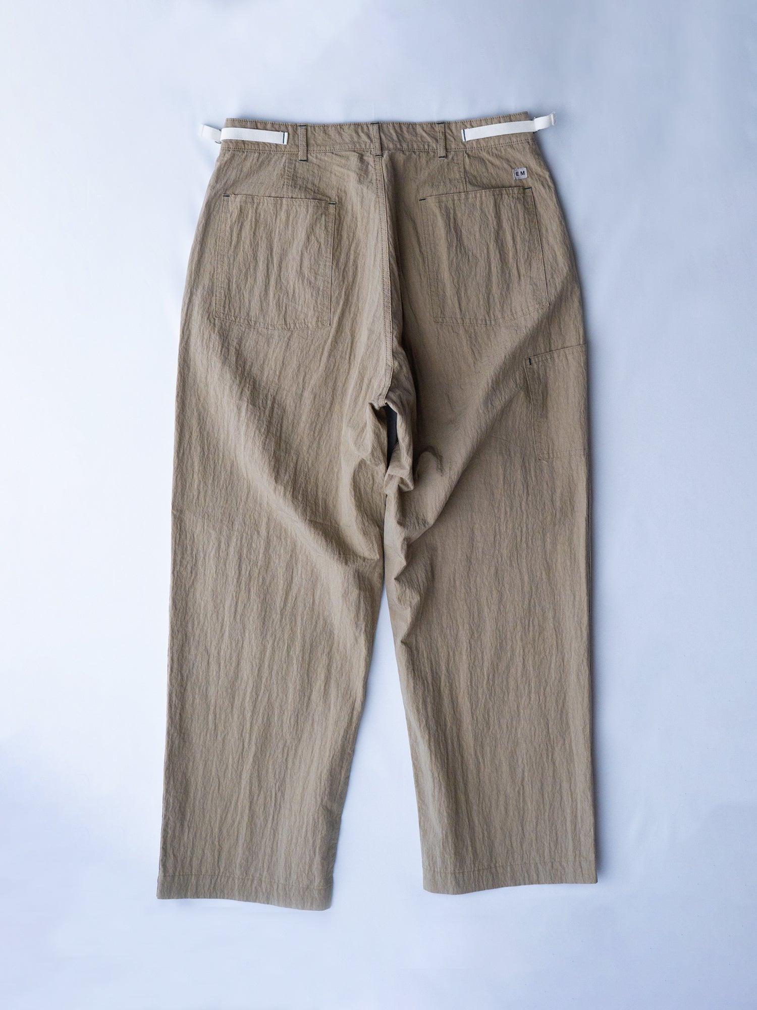 塩縮シワ加工を施したコットンナイロン生地を使用。表情のあるシワ感はカジュアルながらもマチュアな雰囲気。程よく太めのパンツは腰にアジャスターが付いているのでベルトレスでの着用可、スニーカー、革靴にも合わせやすい形です。