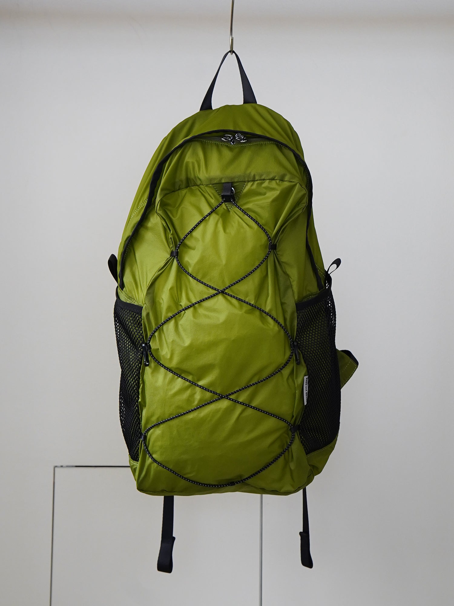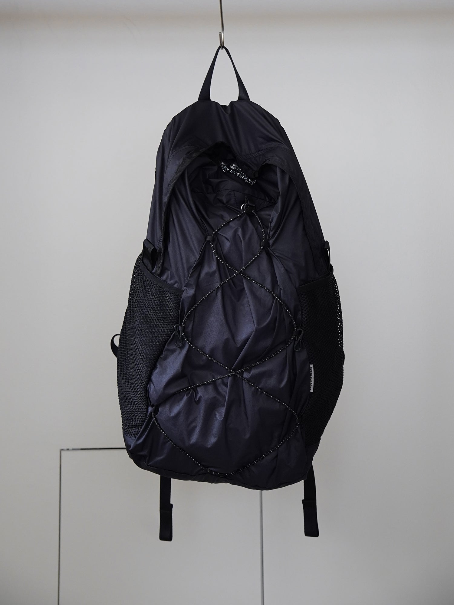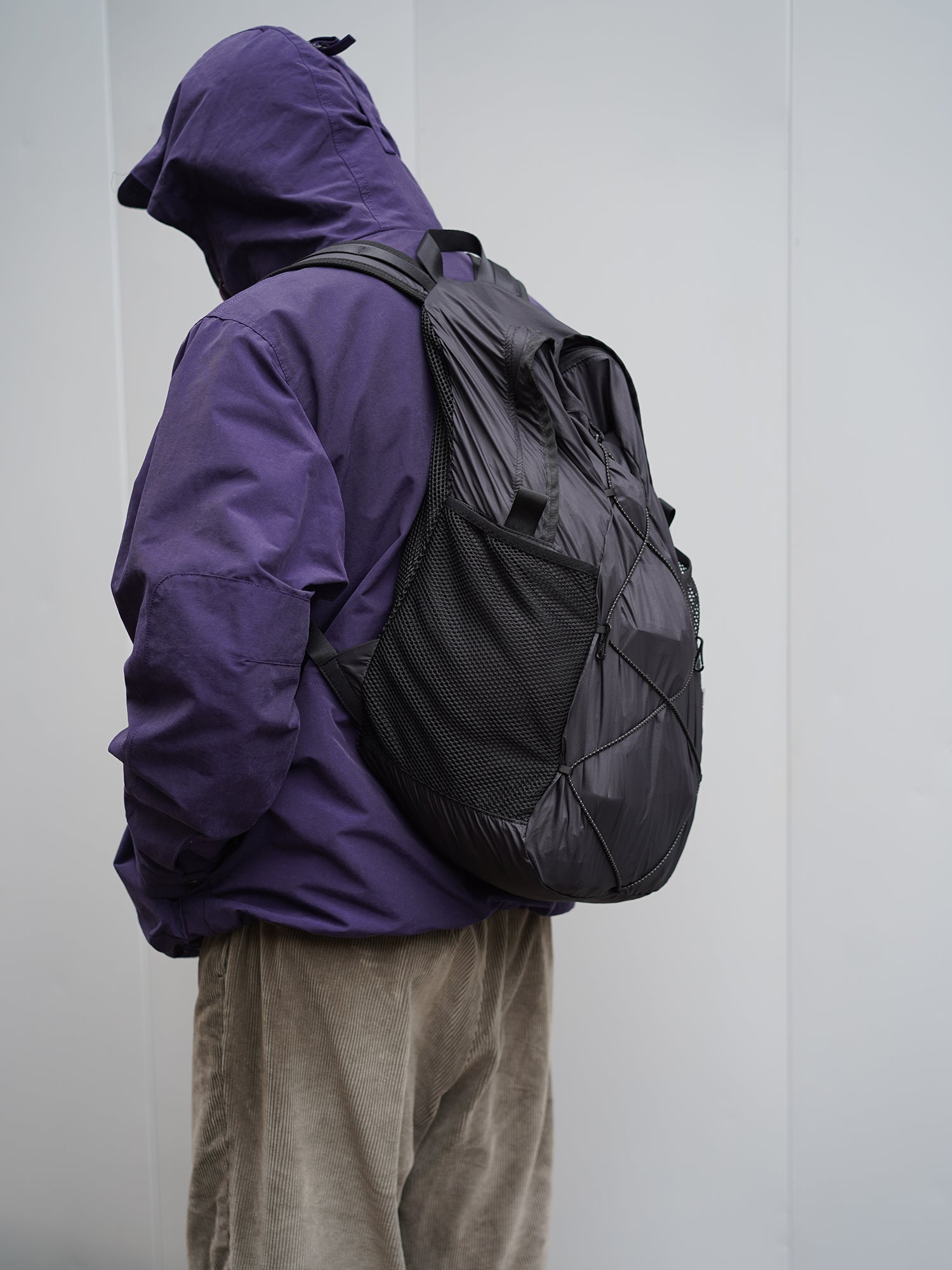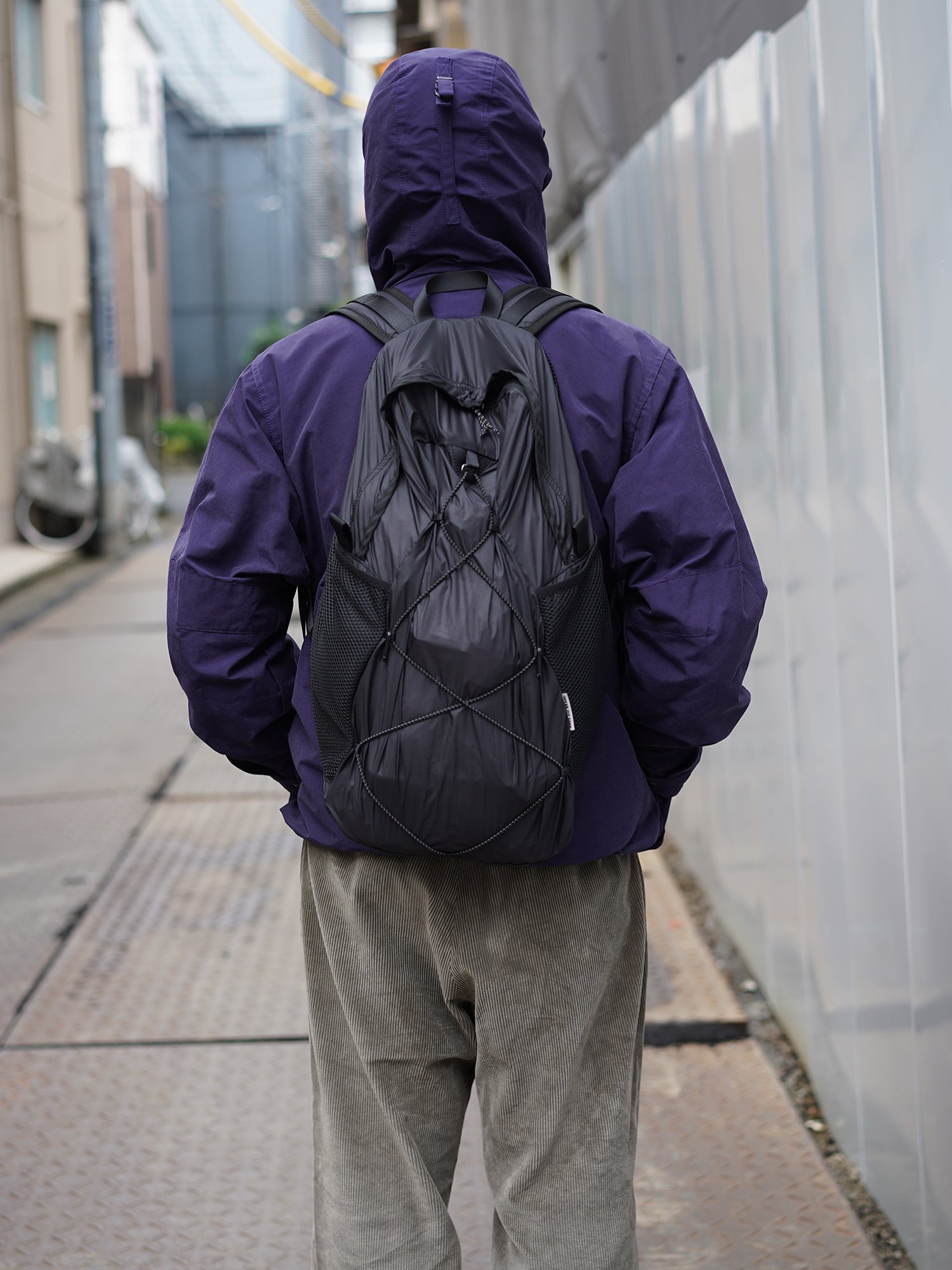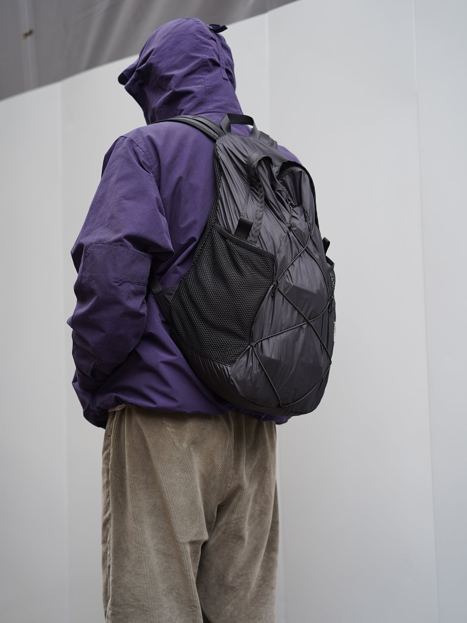 通常より薄手のマイクロリップストップナイロンとメッシュナイロンを使用したパッカブル仕様の軽量ナイロンバックパック。タウンユースを想定した必要最低限の機能を搭載。背面がメッシュなので夏場の蒸れが軽減、丸ゴムバンジーコードはリフレクター入りなので暗闇でも安心、絞れば上着などを挟んでおけます。旅行のサブバックとしてもオススメ。90’sアウトドアとULのハイブリッドスタイルがテーマ。
