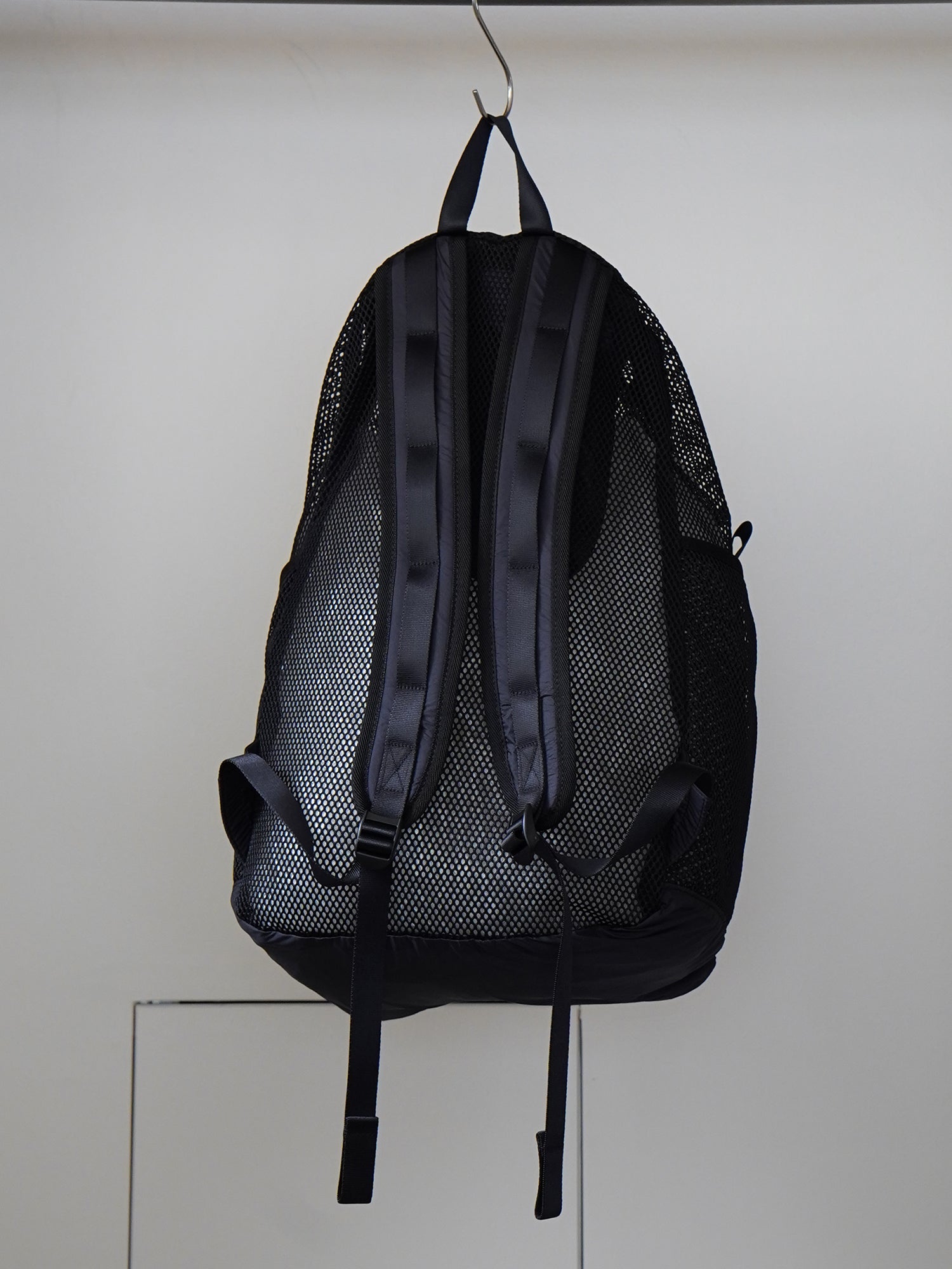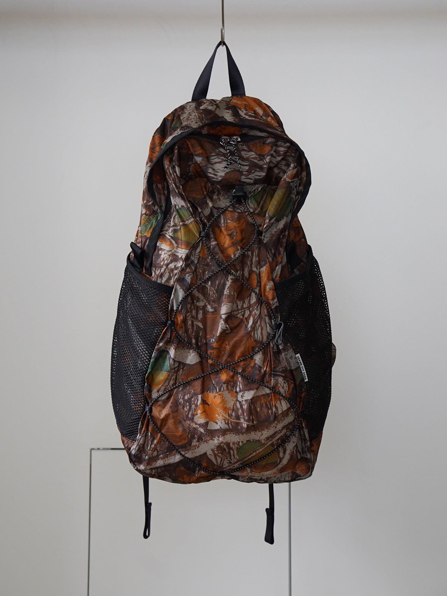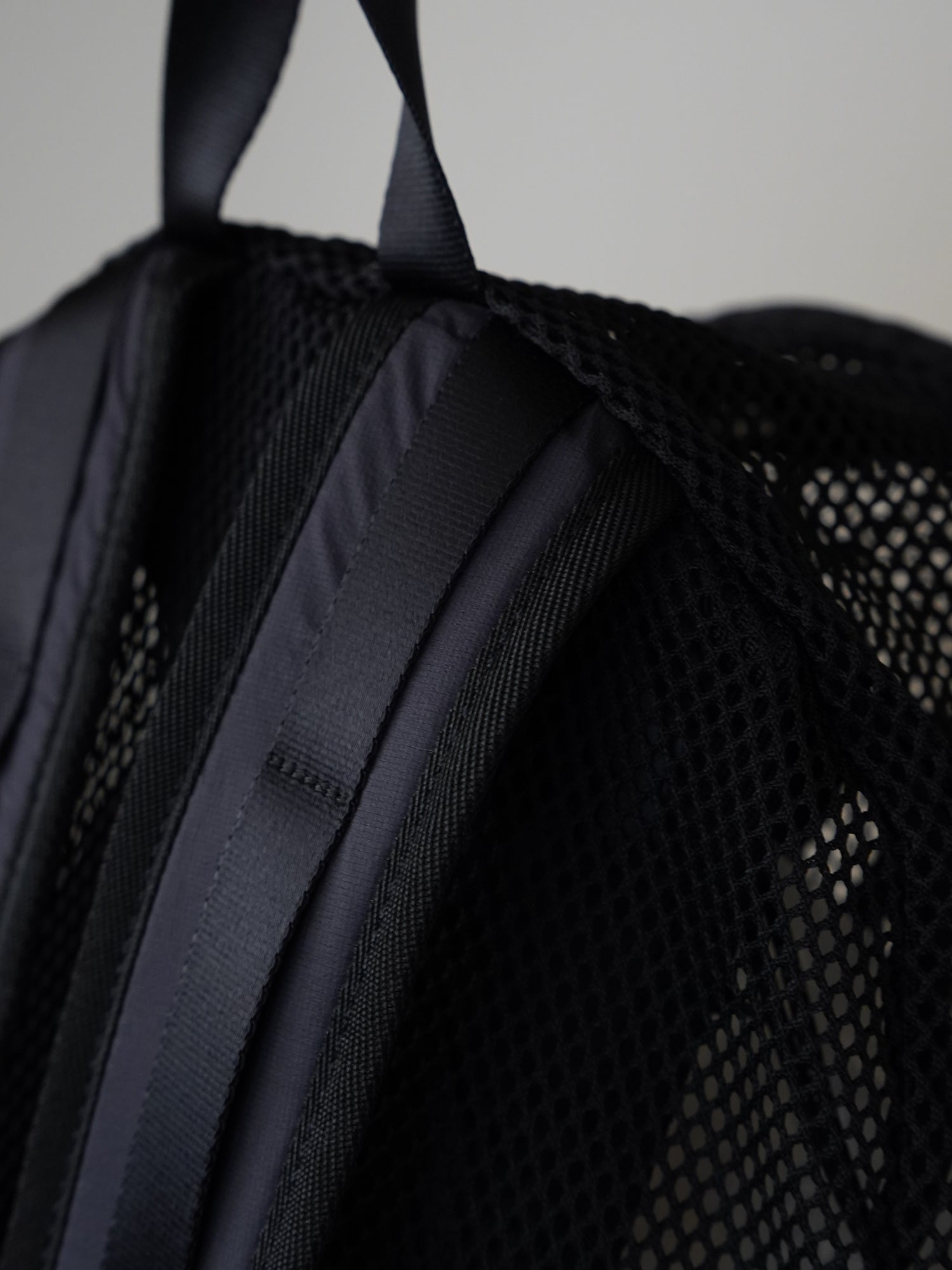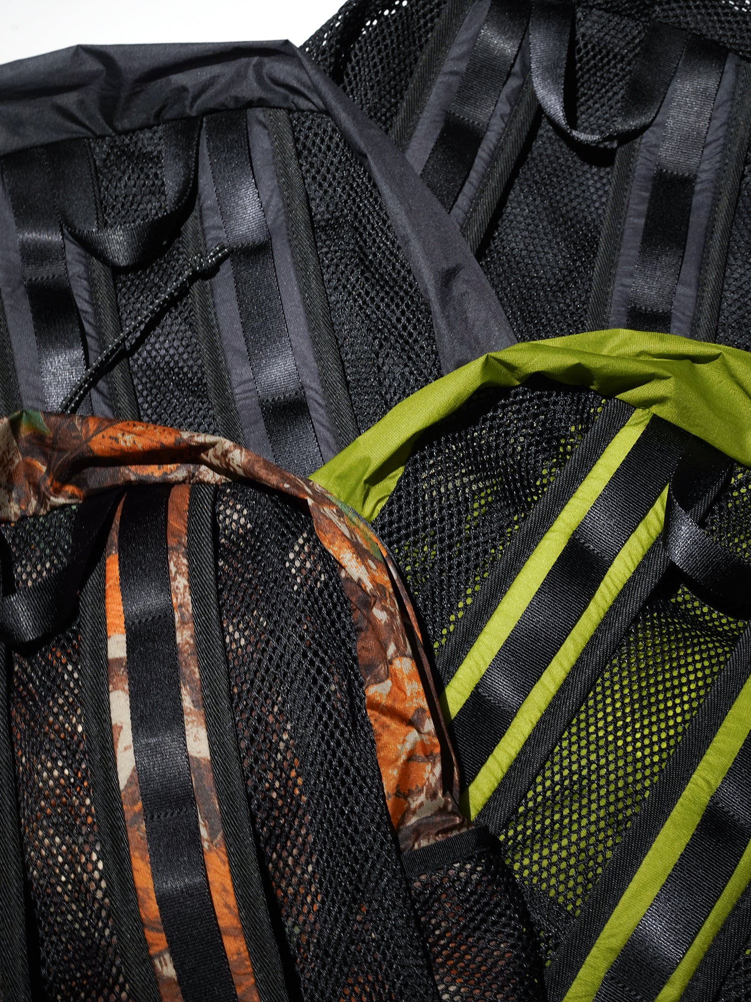 通常より薄手のマイクロリップストップナイロンとメッシュナイロンを使用したパッカブル仕様の軽量ナイロンバックパック。タウンユースを想定した必要最低限の機能を搭載。背面がメッシュなので夏場の蒸れが軽減、丸ゴムバンジーコードはリフレクター入りなので暗闇でも安心、絞れば上着などを挟んでおけます。旅行のサブバックとしてもオススメ。90’sアウトドアとULのハイブリッドスタイルがテーマ。