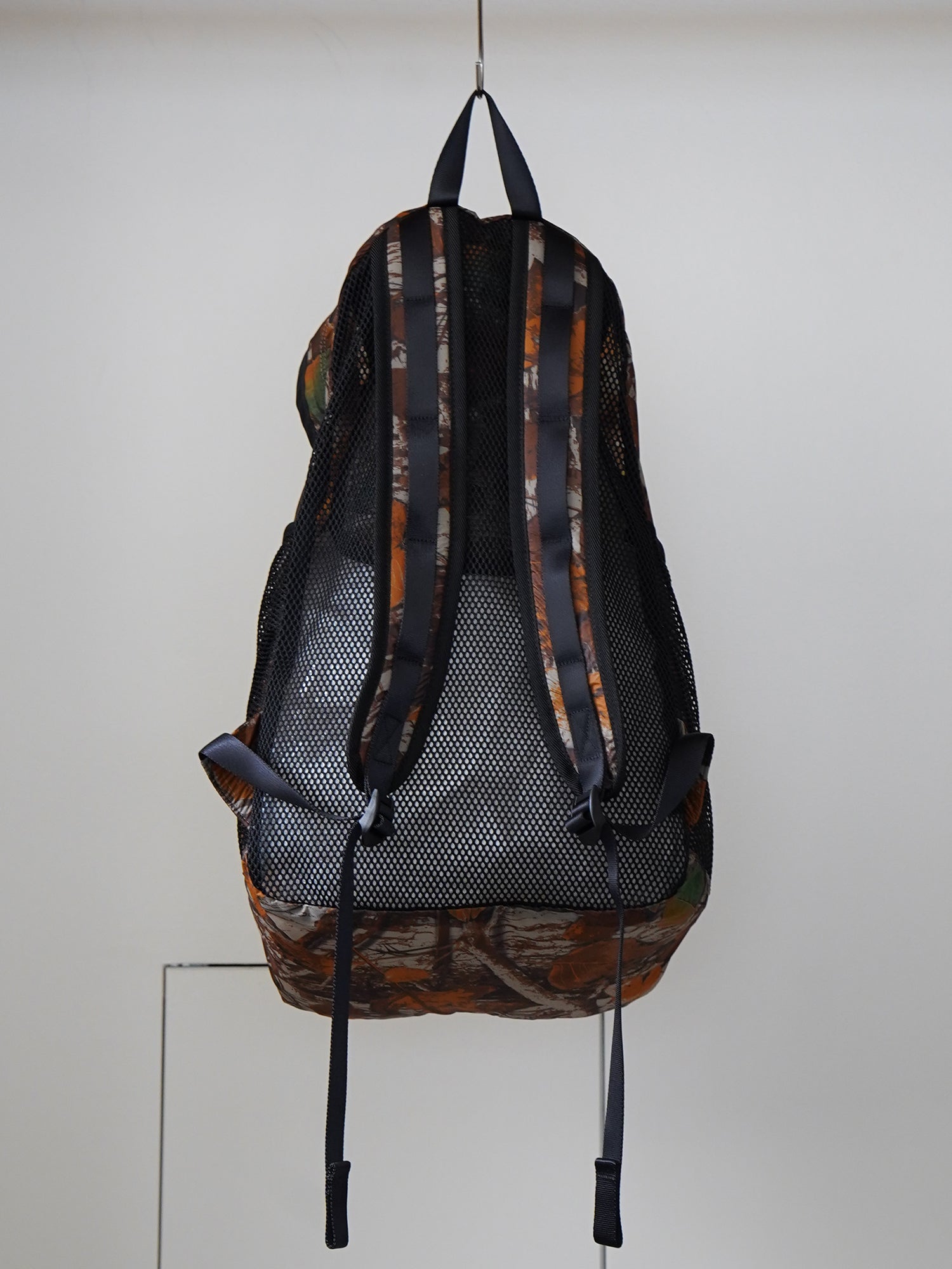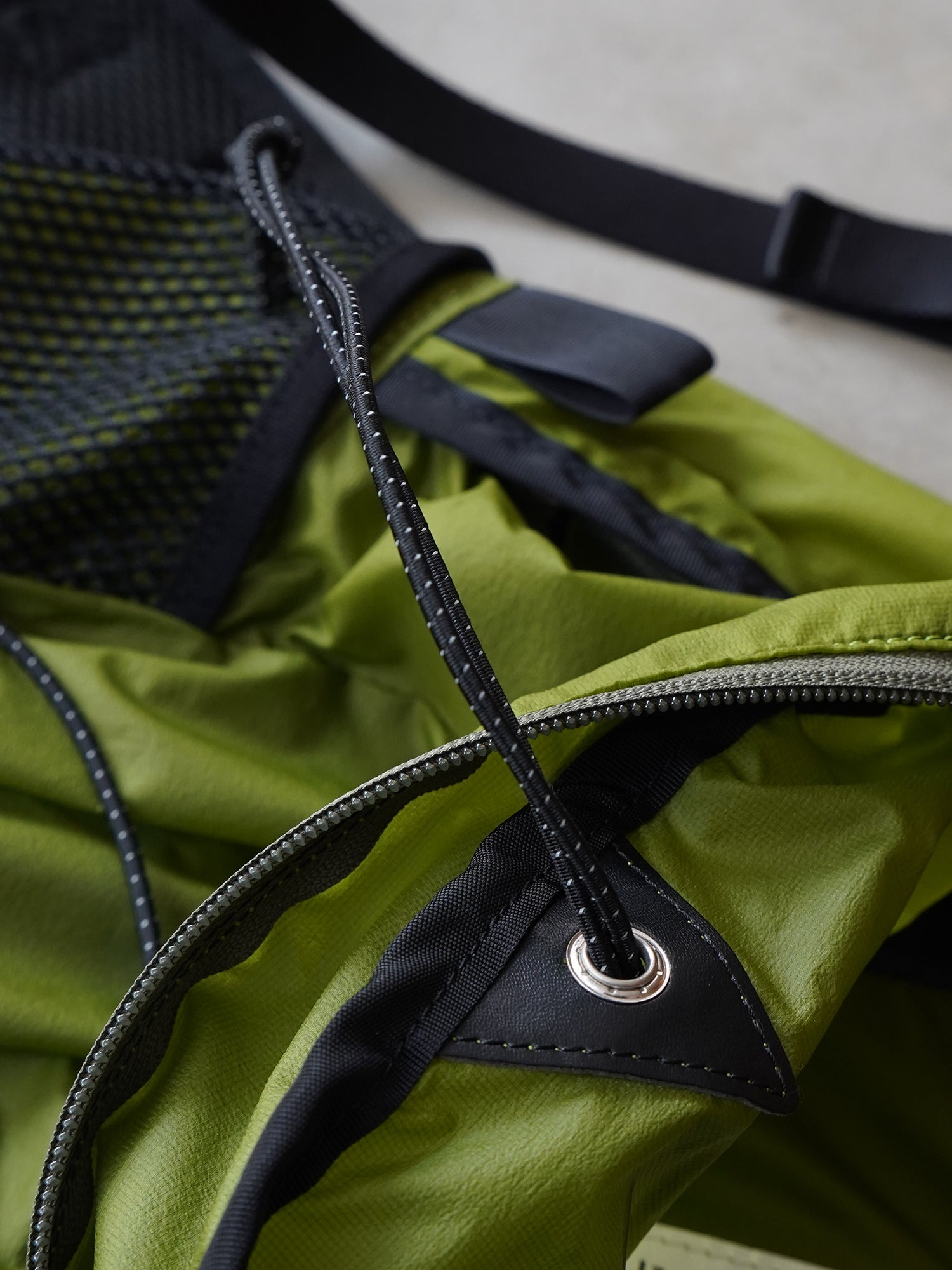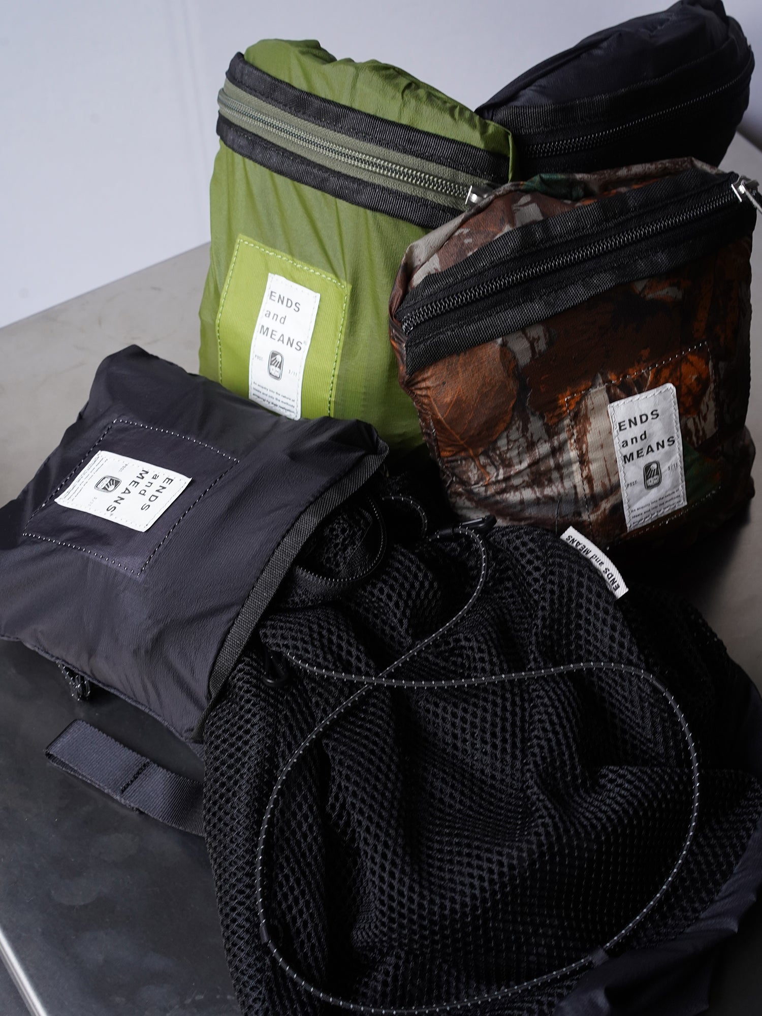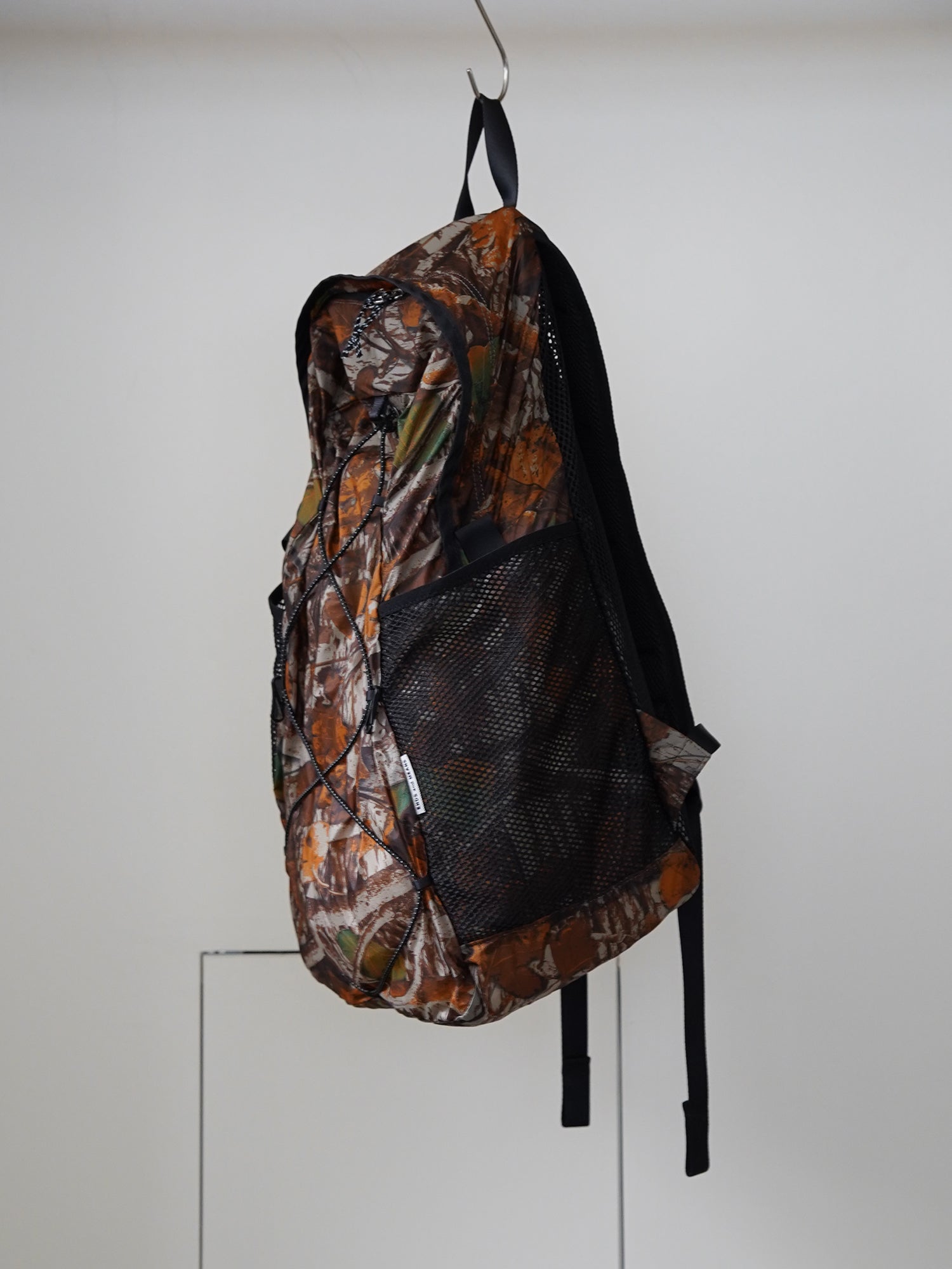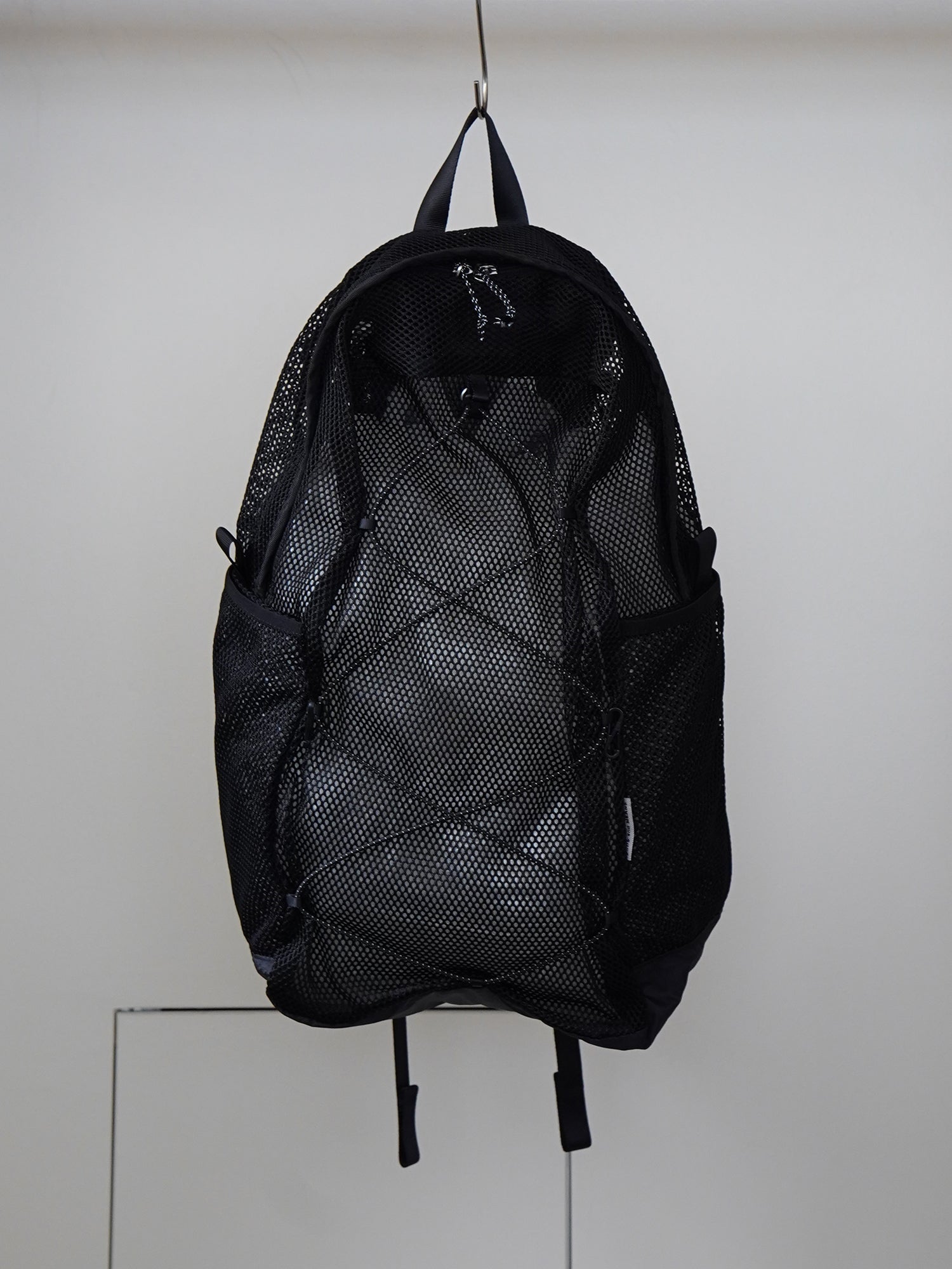通常より薄手のマイクロリップストップナイロンとメッシュナイロンを使用したパッカブル仕様の軽量ナイロンバックパック。タウンユースを想定した必要最低限の機能を搭載。背面がメッシュなので夏場の蒸れが軽減、丸ゴムバンジーコードはリフレクター入りなので暗闇でも安心、絞れば上着などを挟んでおけます。旅行のサブバックとしてもオススメ。90’sアウトドアとULのハイブリッドスタイルがテーマ。