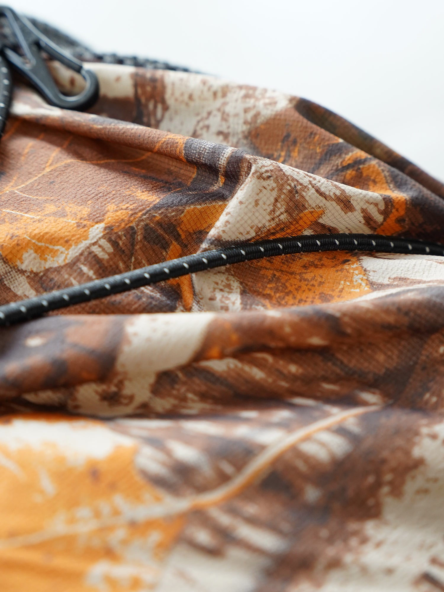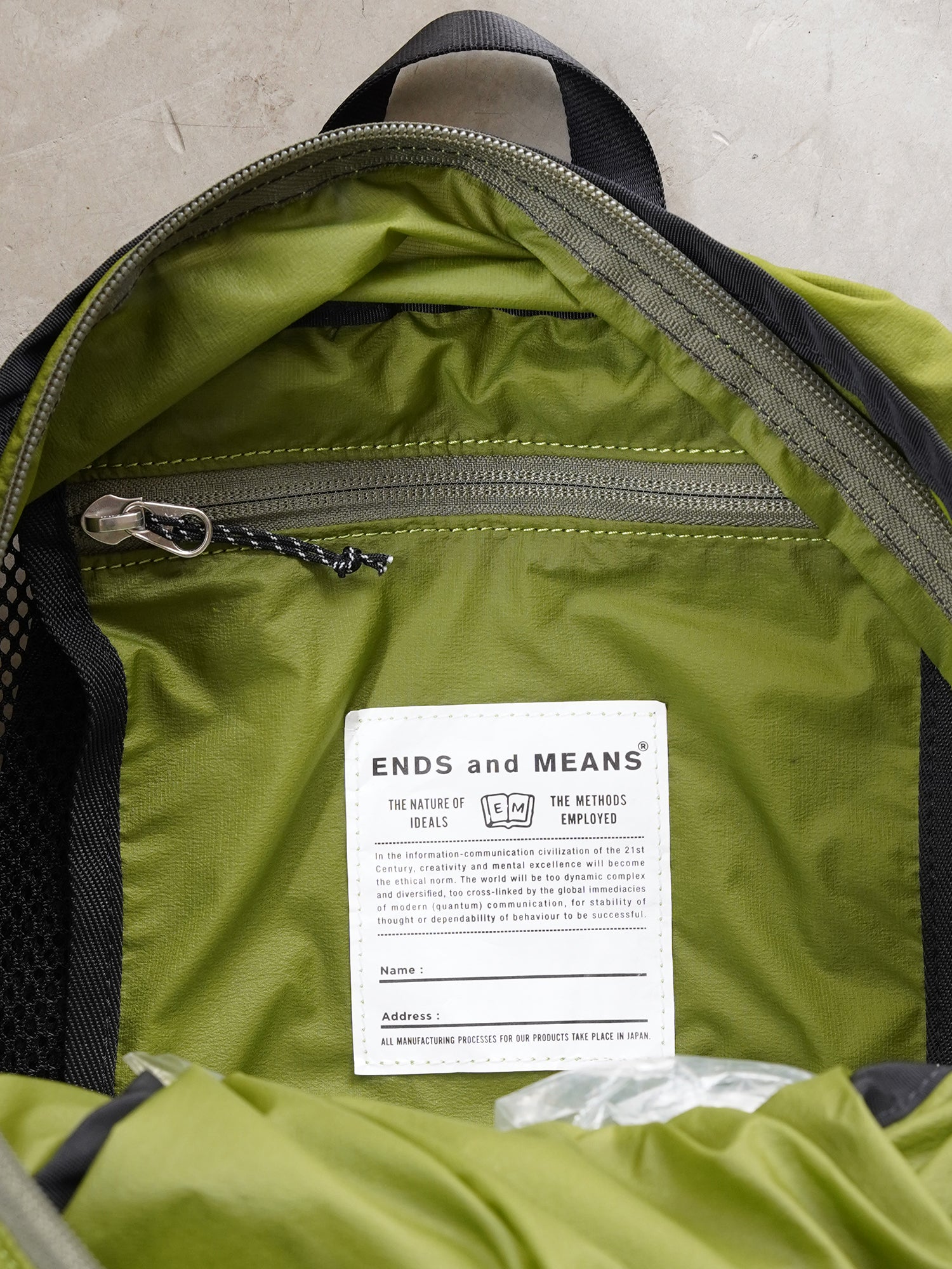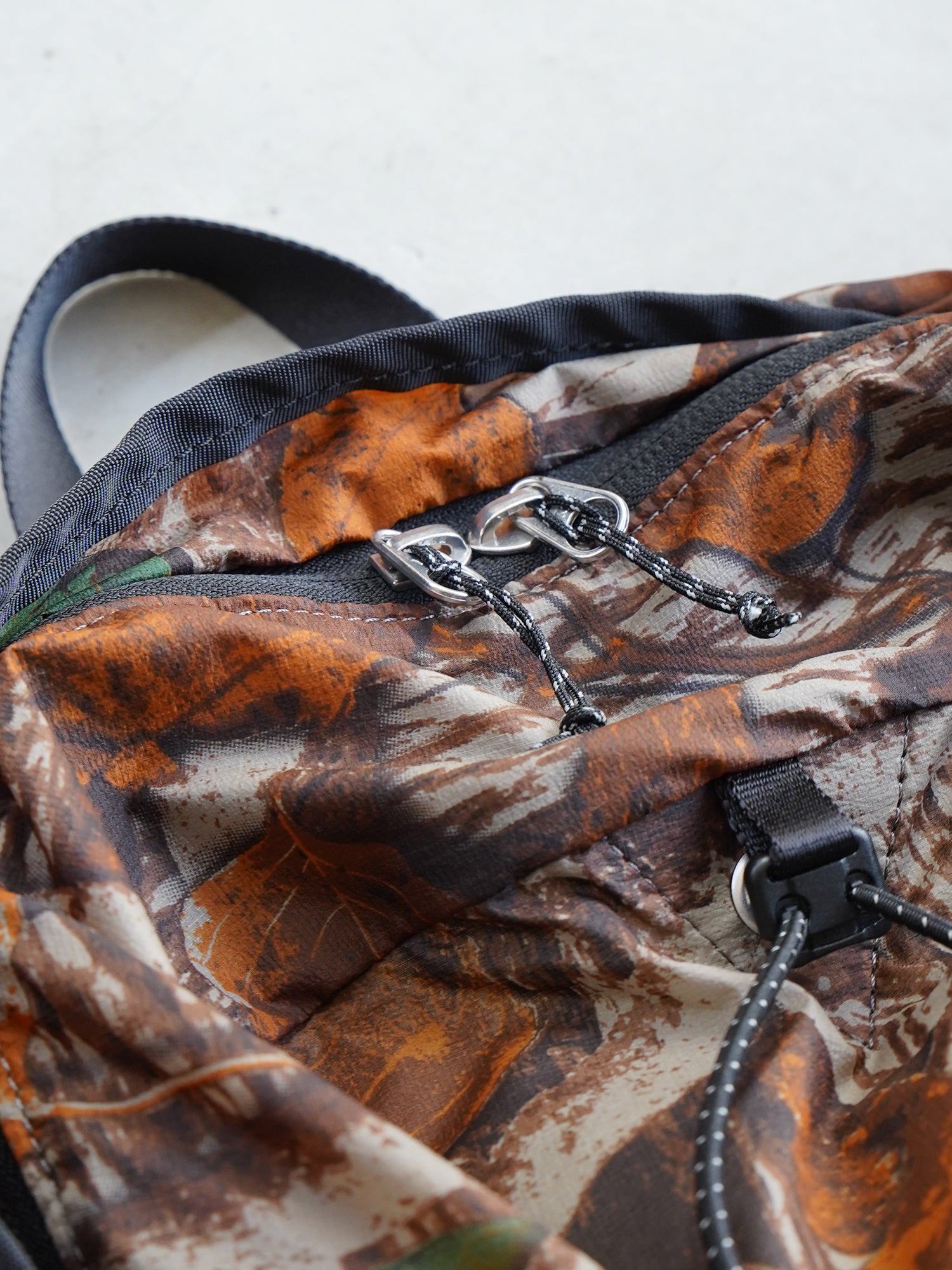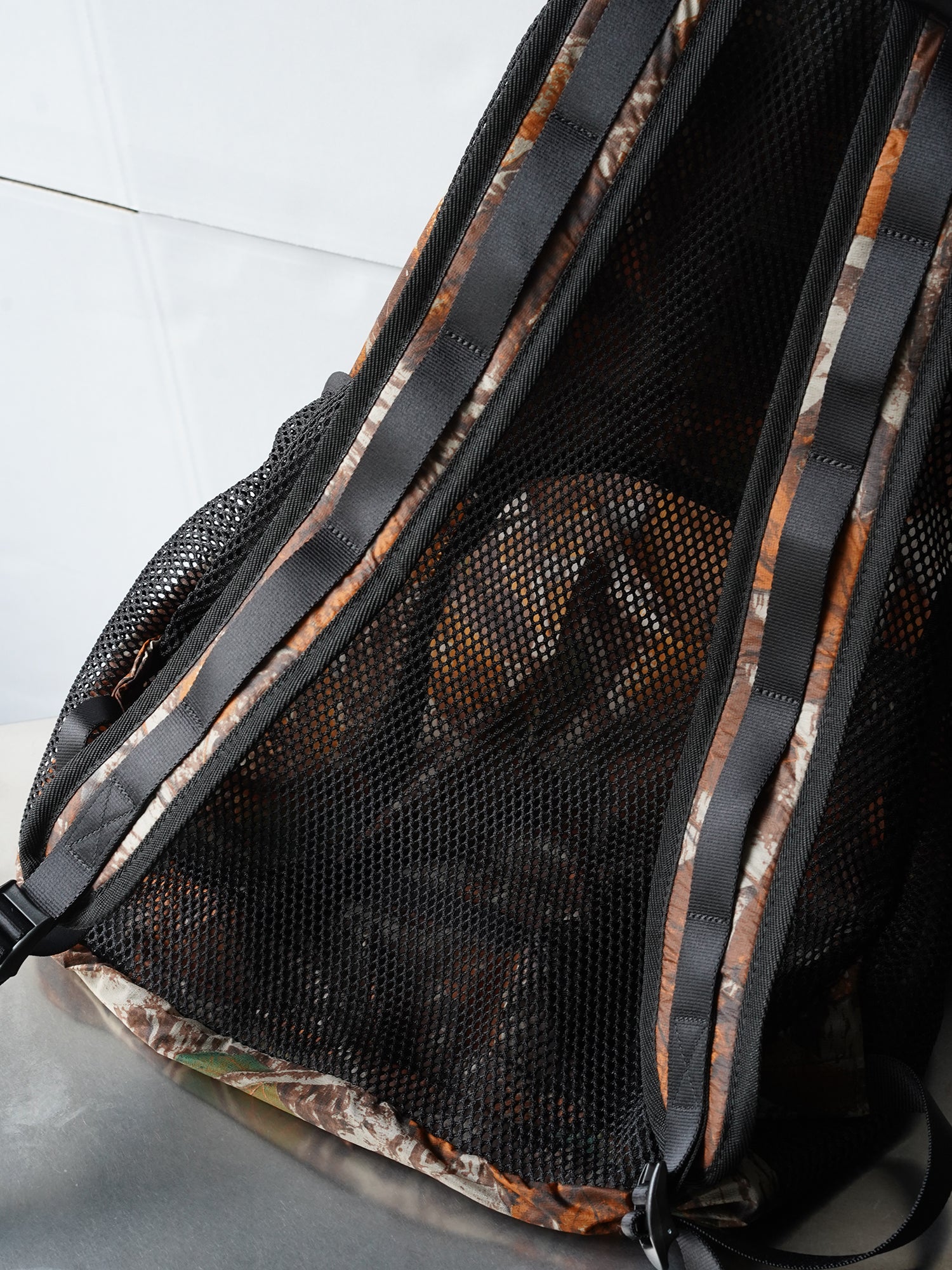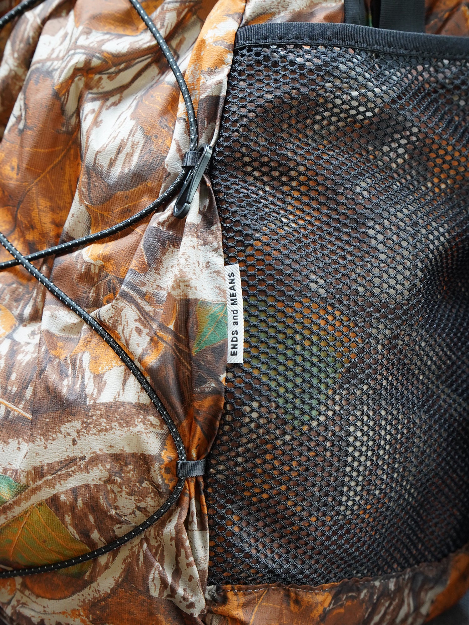 通常より薄手のマイクロリップストップナイロンとメッシュナイロンを使用したパッカブル仕様の軽量ナイロンバックパック。タウンユースを想定した必要最低限の機能を搭載。背面がメッシュなので夏場の蒸れが軽減、丸ゴムバンジーコードはリフレクター入りなので暗闇でも安心、絞れば上着などを挟んでおけます。旅行のサブバックとしてもオススメ。90’sアウトドアとULのハイブリッドスタイルがテーマ。