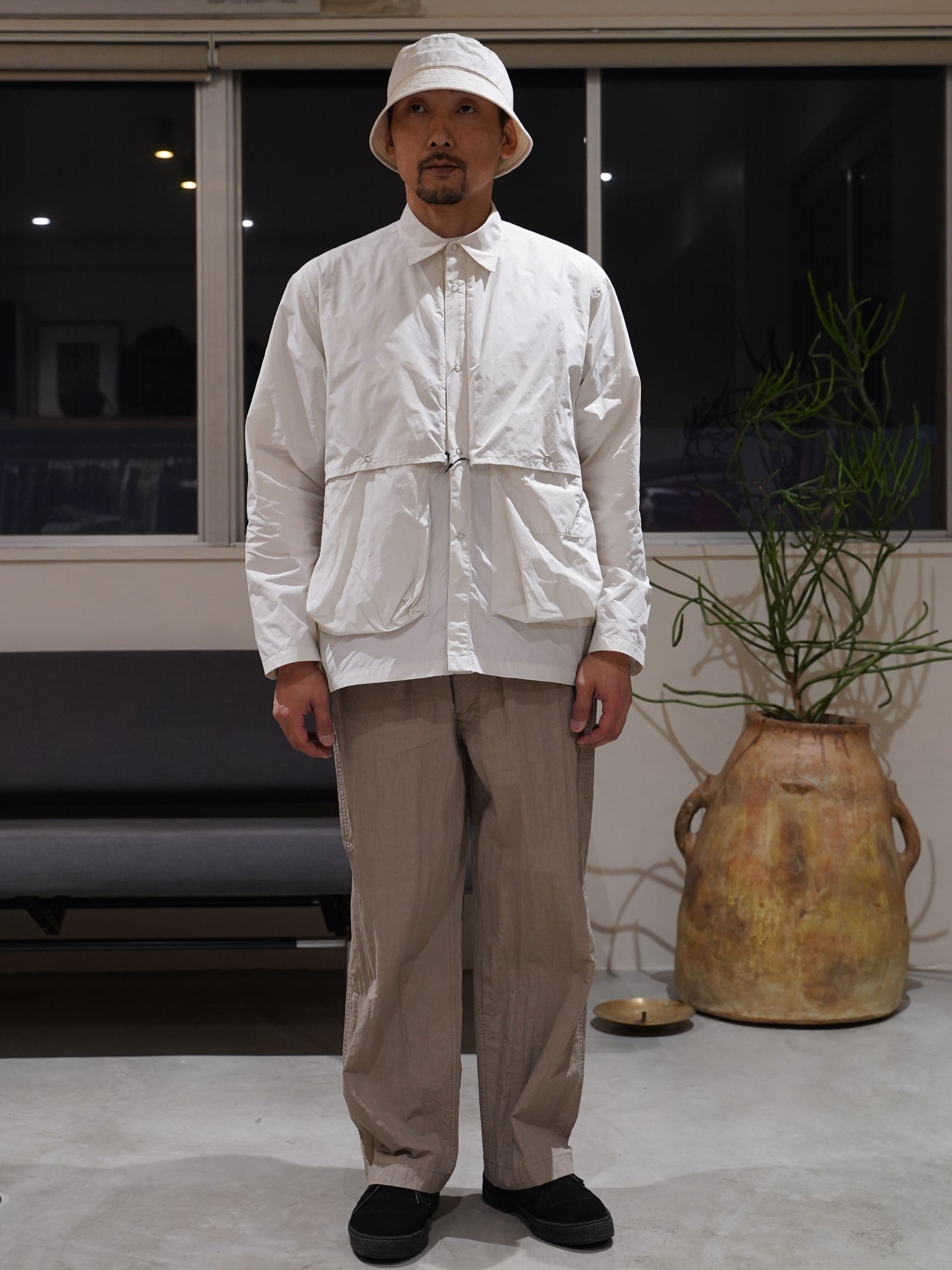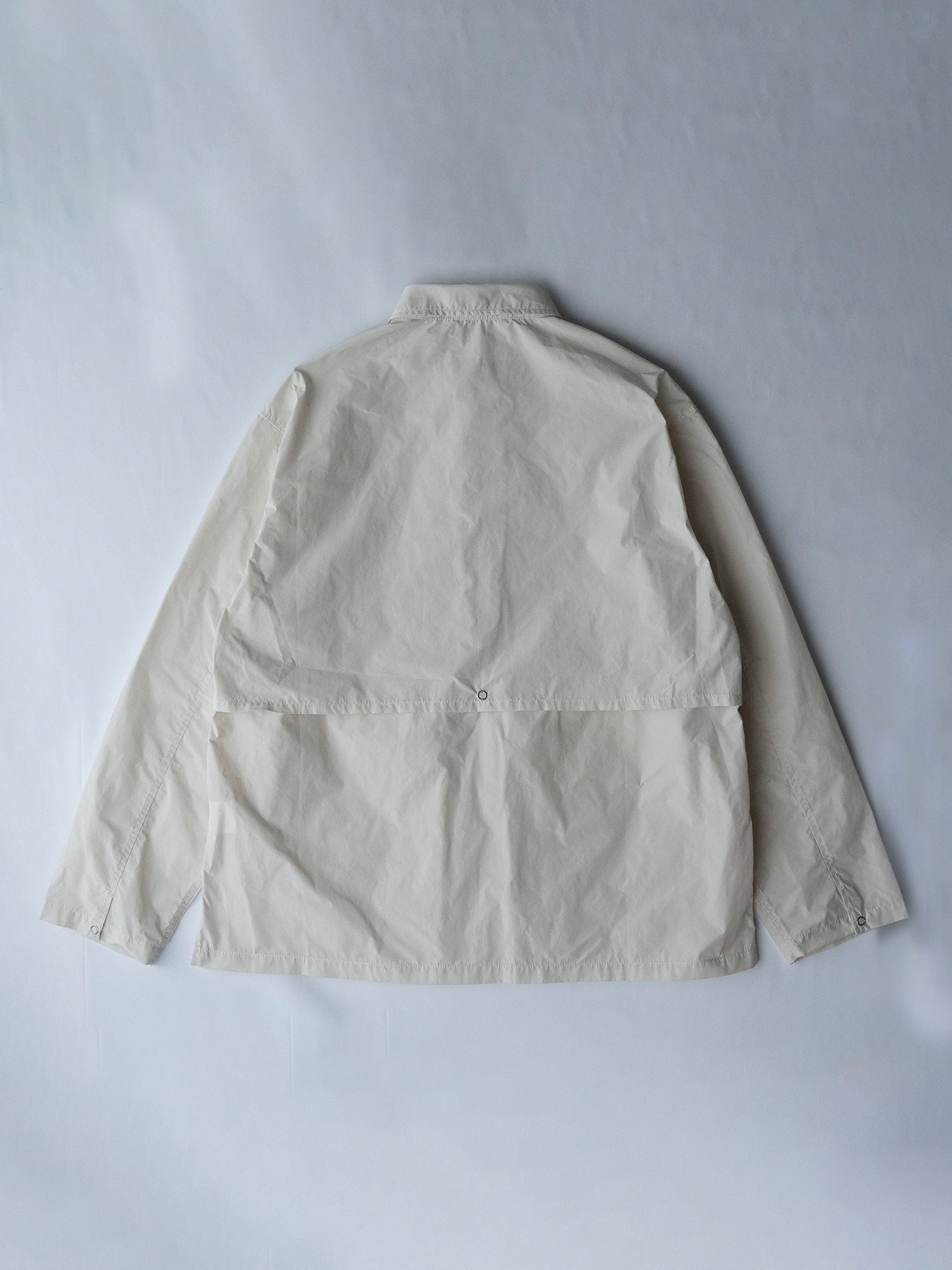 新型のUtility Light Shirts JacketのCUXTON HOUSE 限定カラーのMilk。胸部はコンシールジップにより開閉することができ、ベンチレーションと内側にステルスポケットを完備。