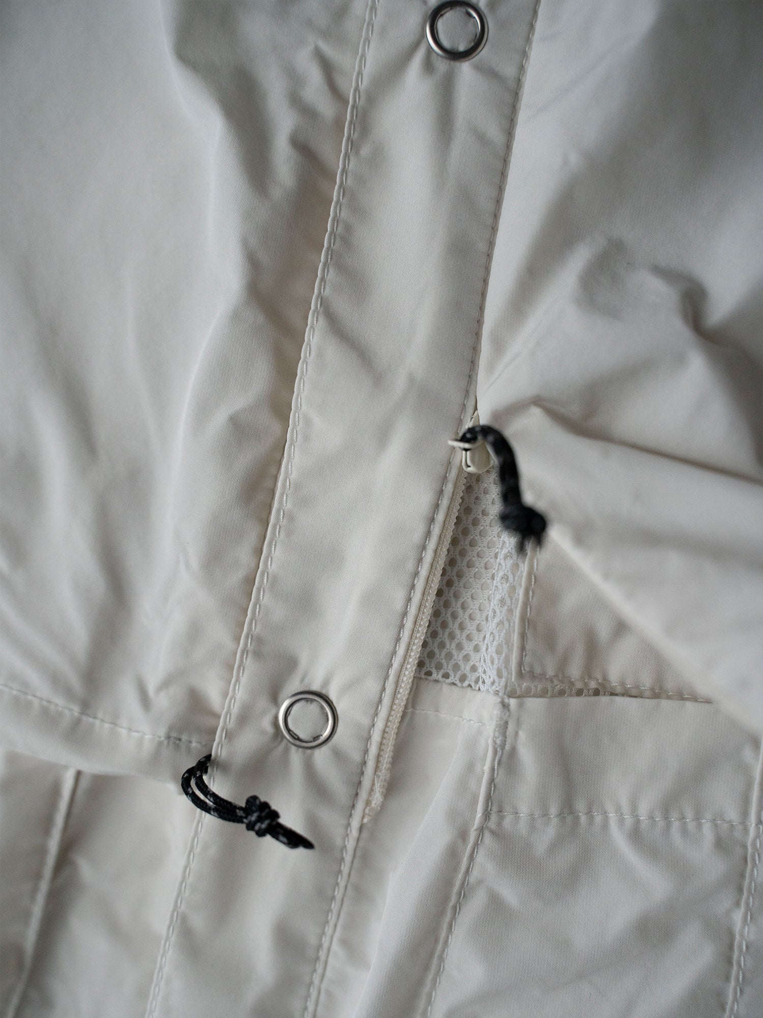 衣服内の湿気や籠もった熱を調整できるよう。背面も同様にヨーク裏がベンチレーション仕様。サイドがハンドウォーマーになっている大きめの立体ポケットを完備し、Tシャツの上から軽く羽織れ、畳むと小さくなるので定番のライトシャツジャケットと同様に旅行時や日常使いにとても便利なアイテム。