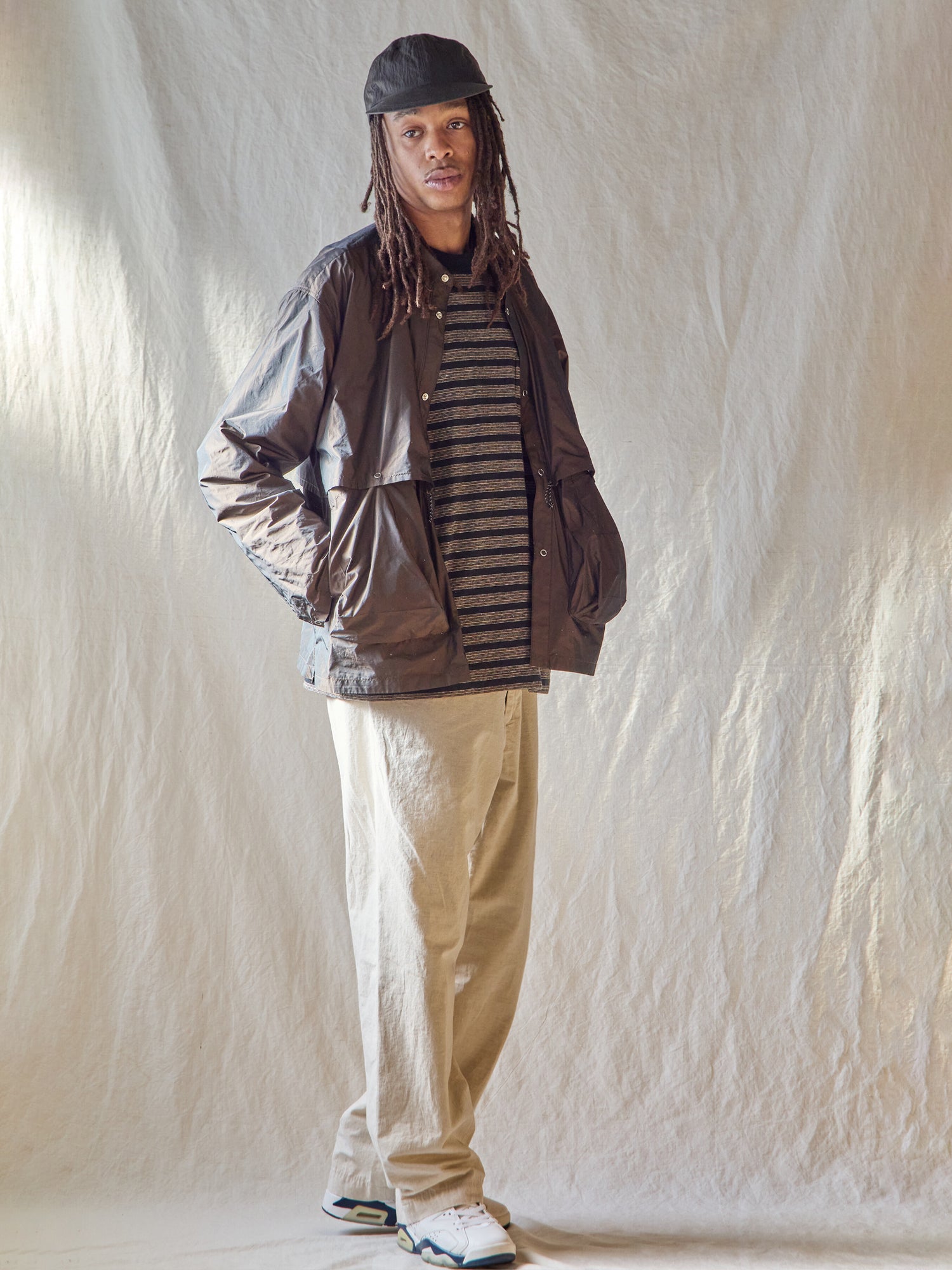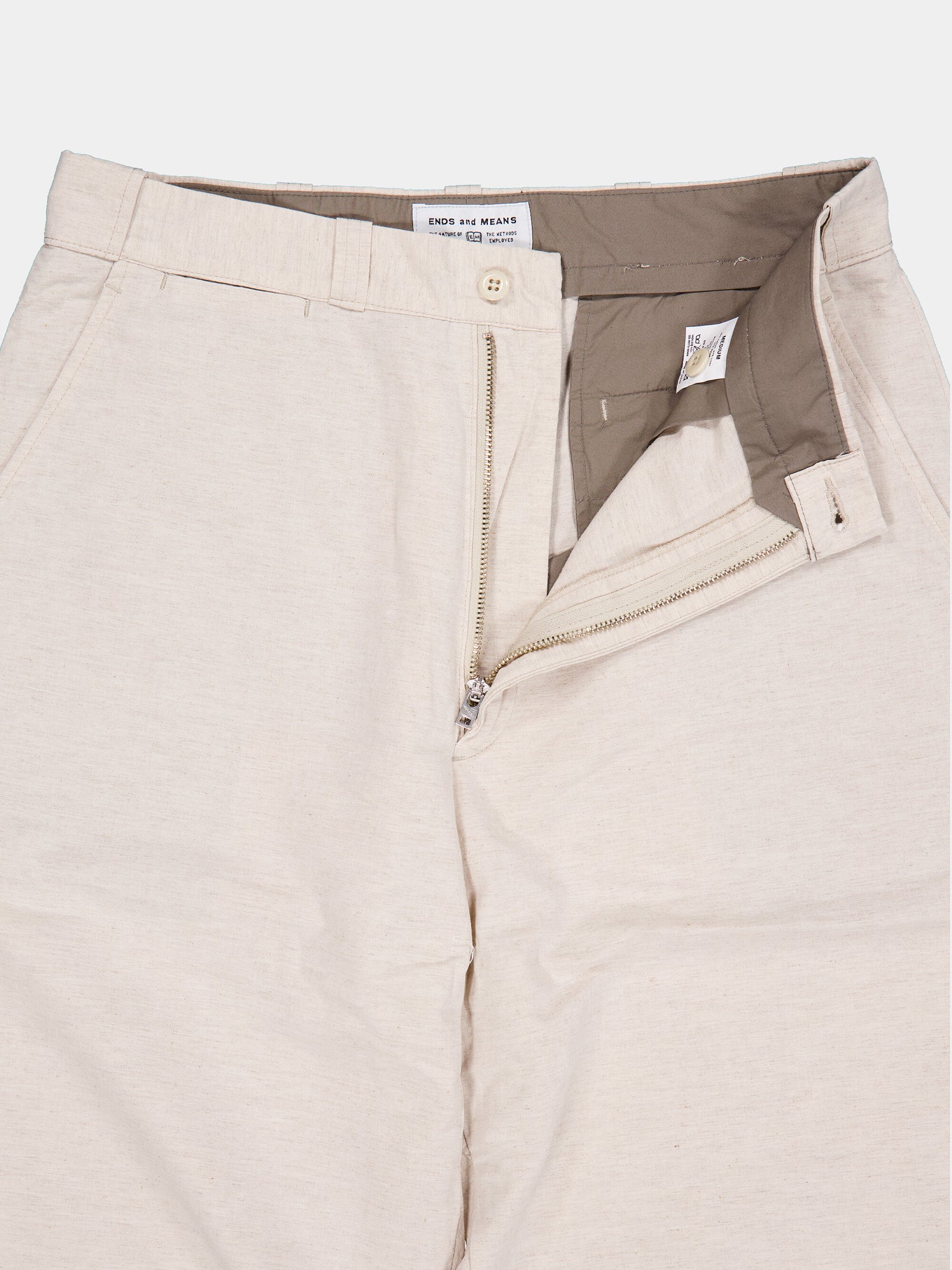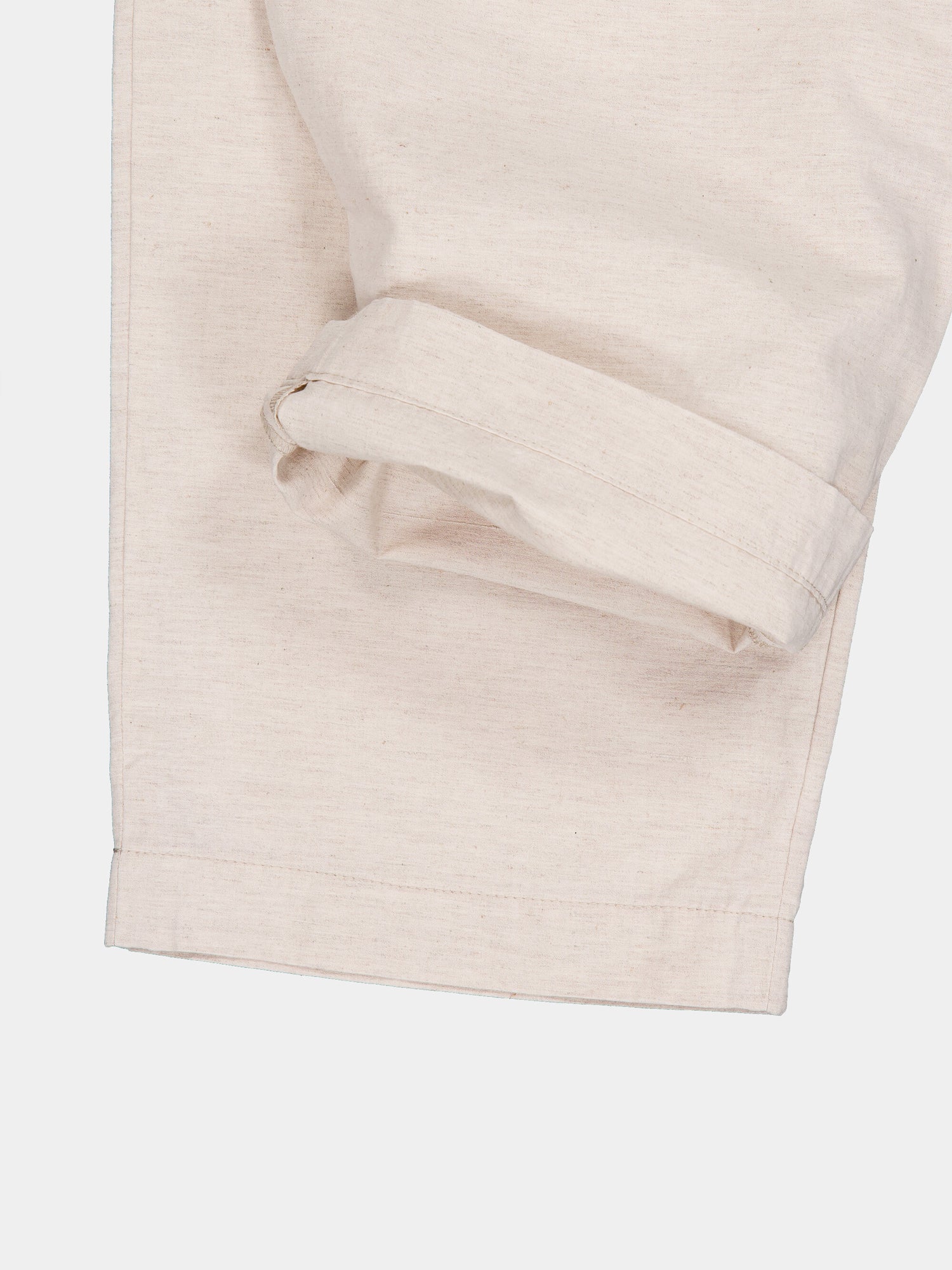 肌触りの良い平織コットンナイロンリネン生地を使った春夏に丁度良い素材感。裾に向かって程よくテーパードが効いており、スタイリングし易いシルエット。