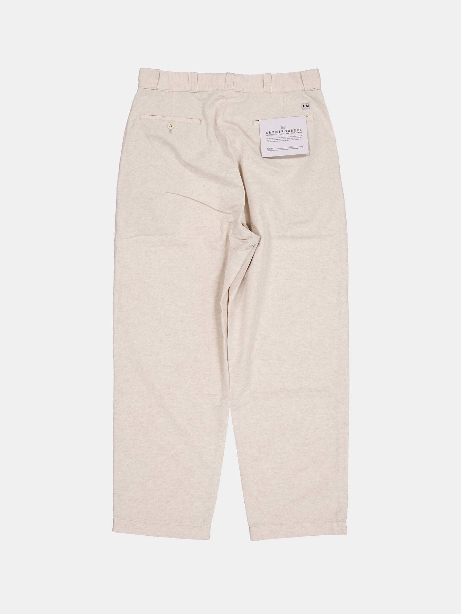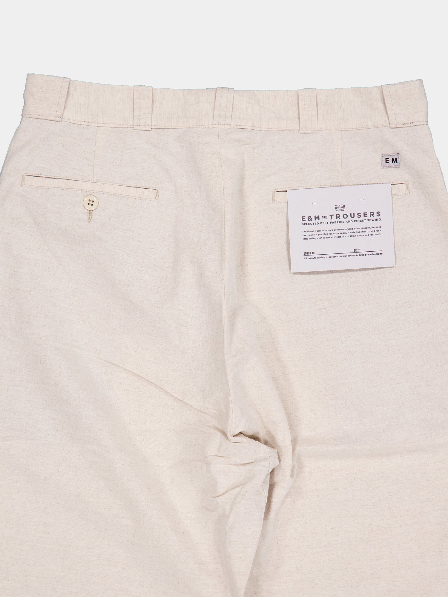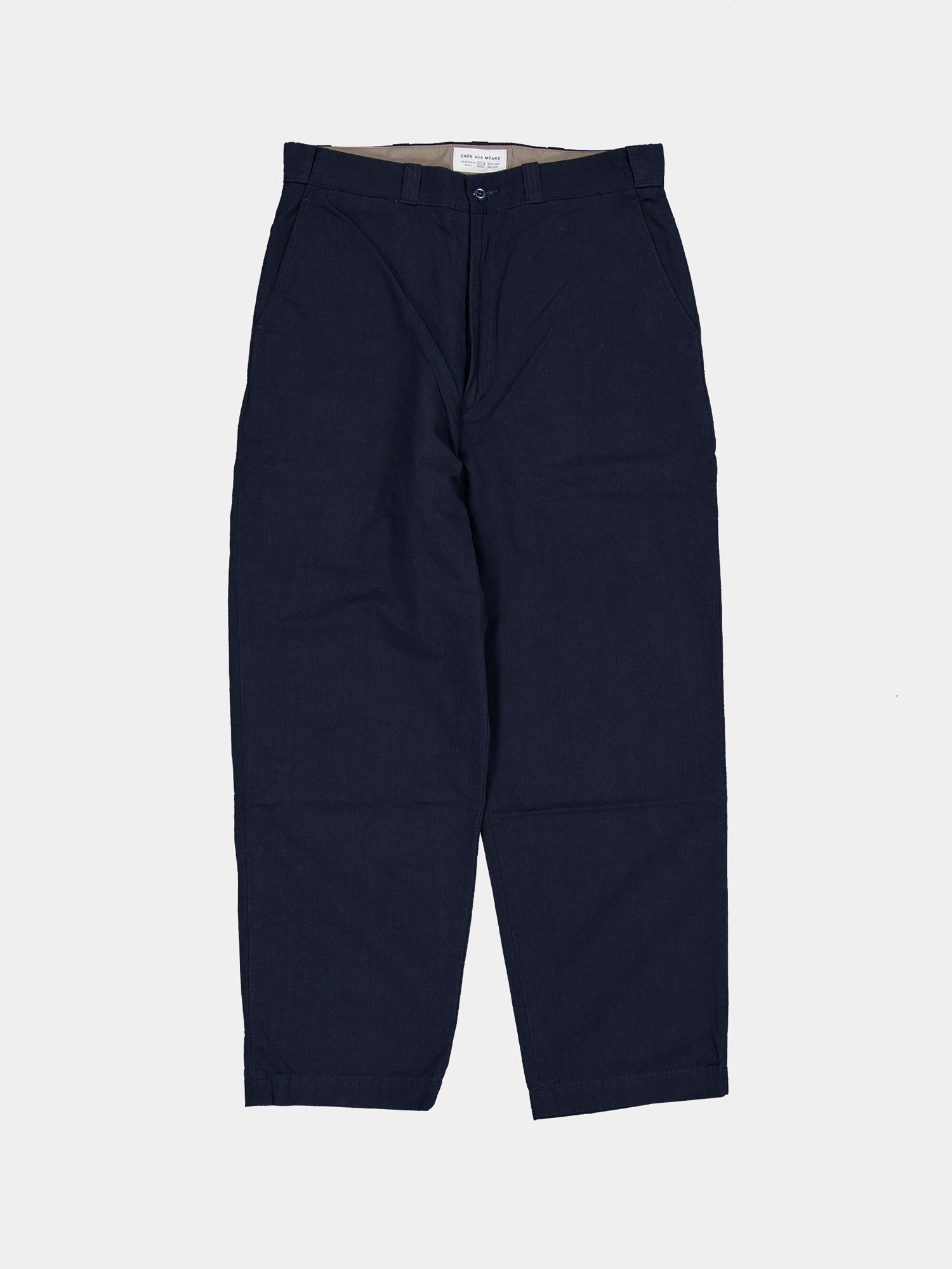肌触りの良い平織コットンナイロンリネン生地を使った春夏に丁度良い素材感。裾に向かって程よくテーパードが効いており、スタイリングし易いシルエット。
