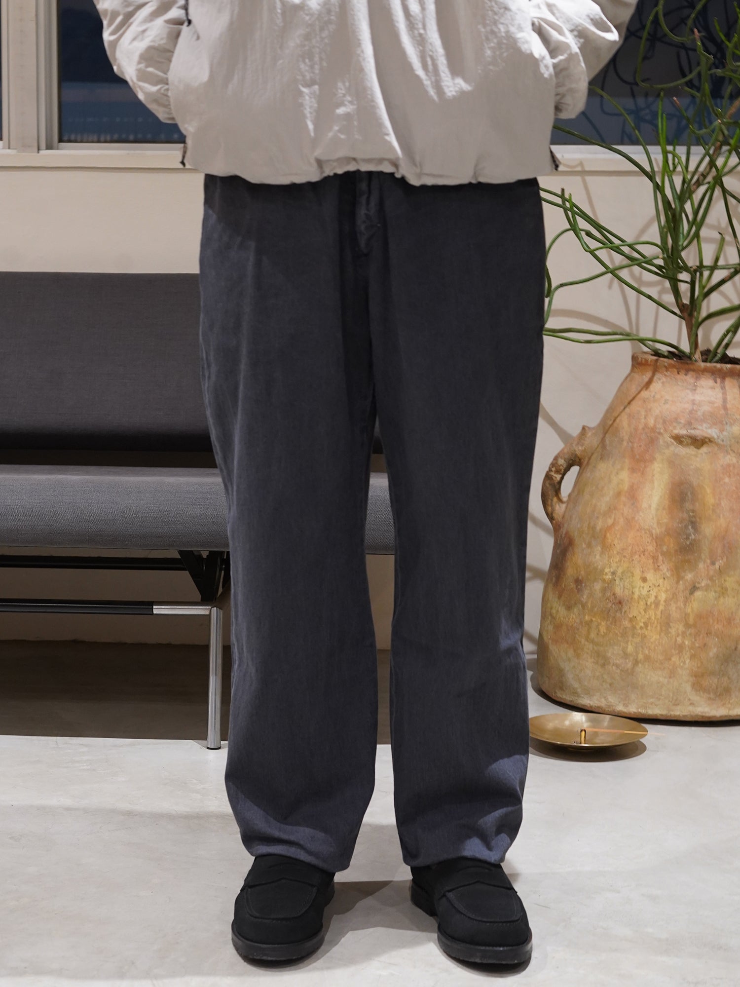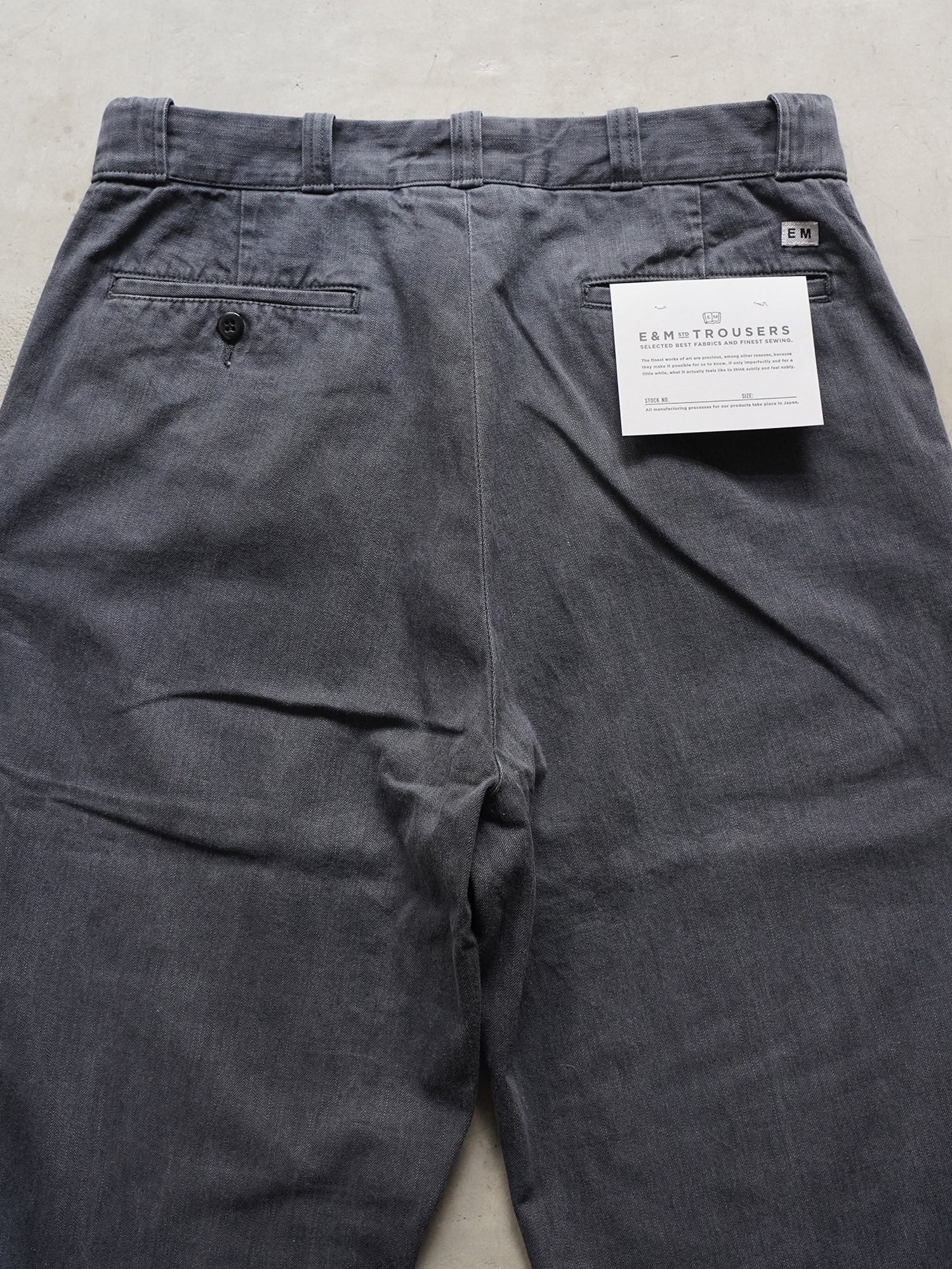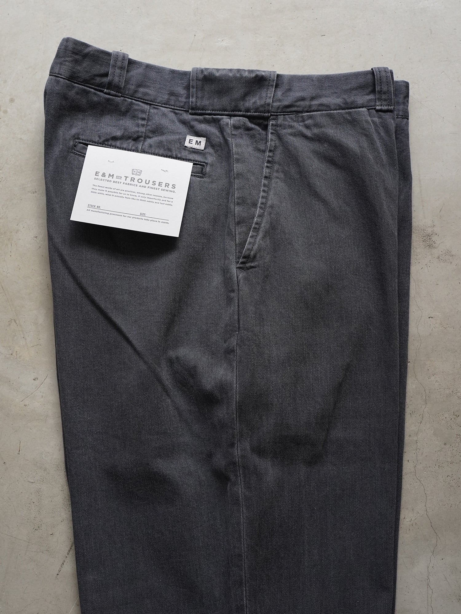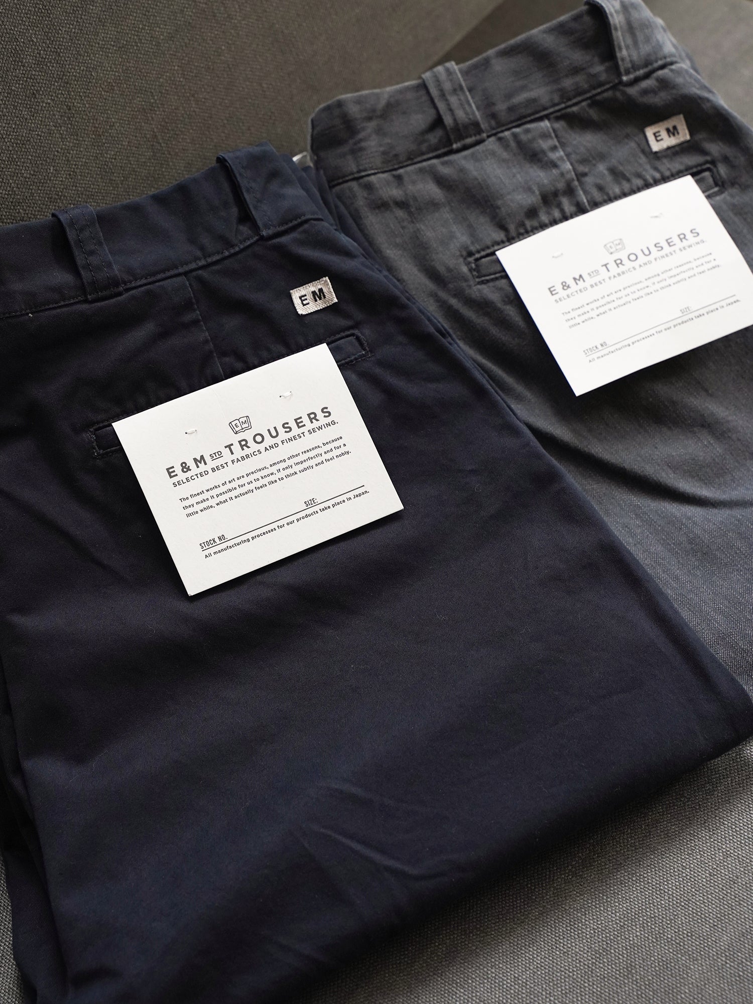 摩擦や裂けに非常に強いチノツイルを使用 。ほど良くコシがありながらもしなやかで柔らかい生地は履きこむほどに馴染み良い表情変化していきます。シルエットはEMの中で1番スタンダードな誰にでも履きやすいタイプ。
