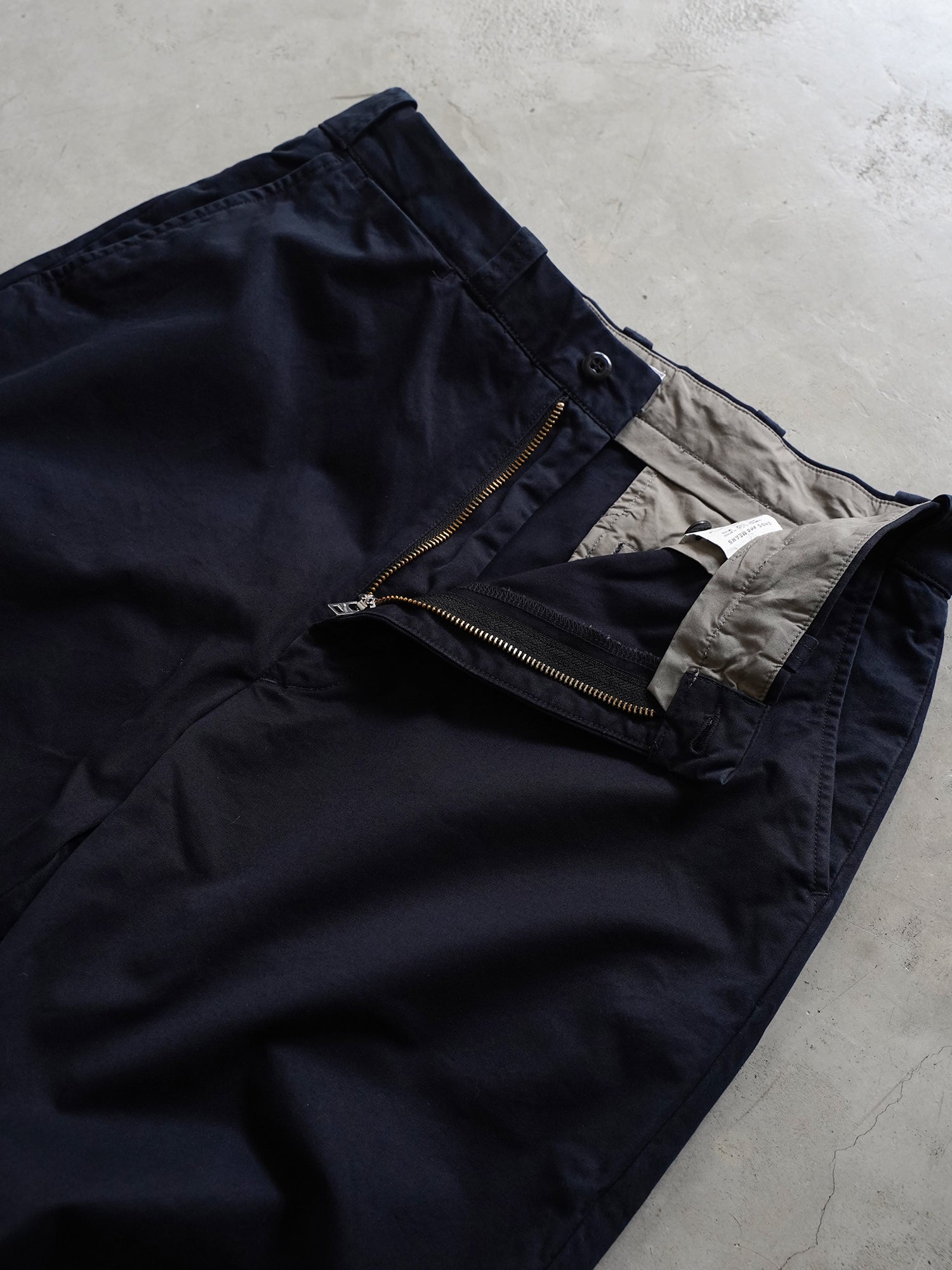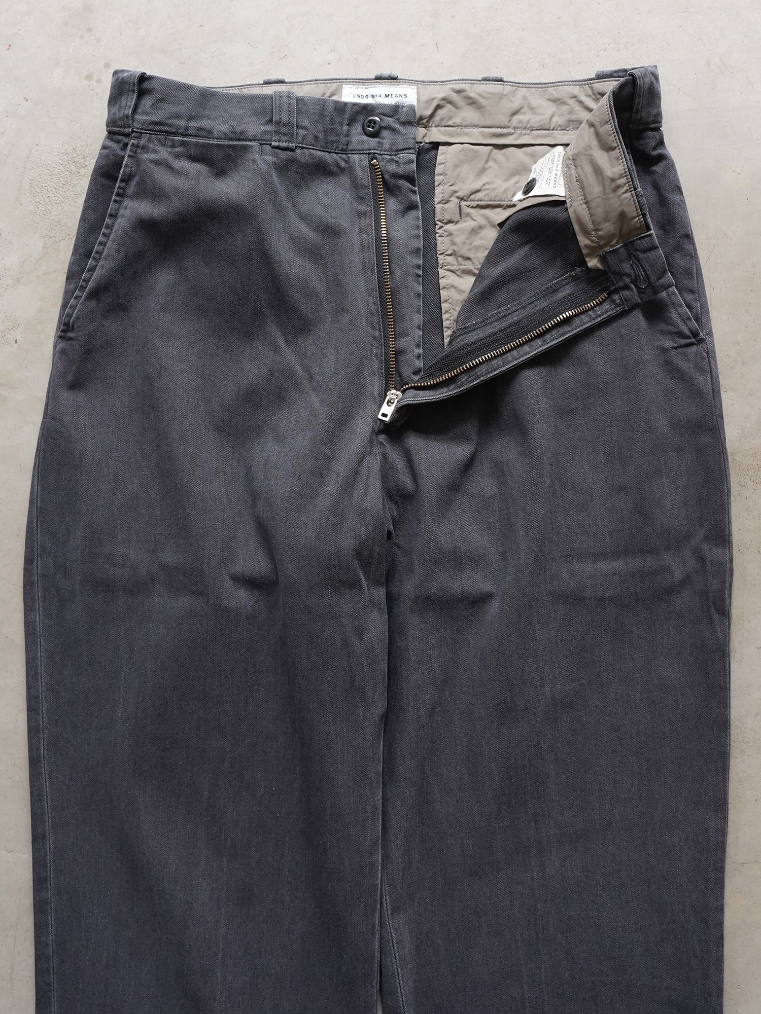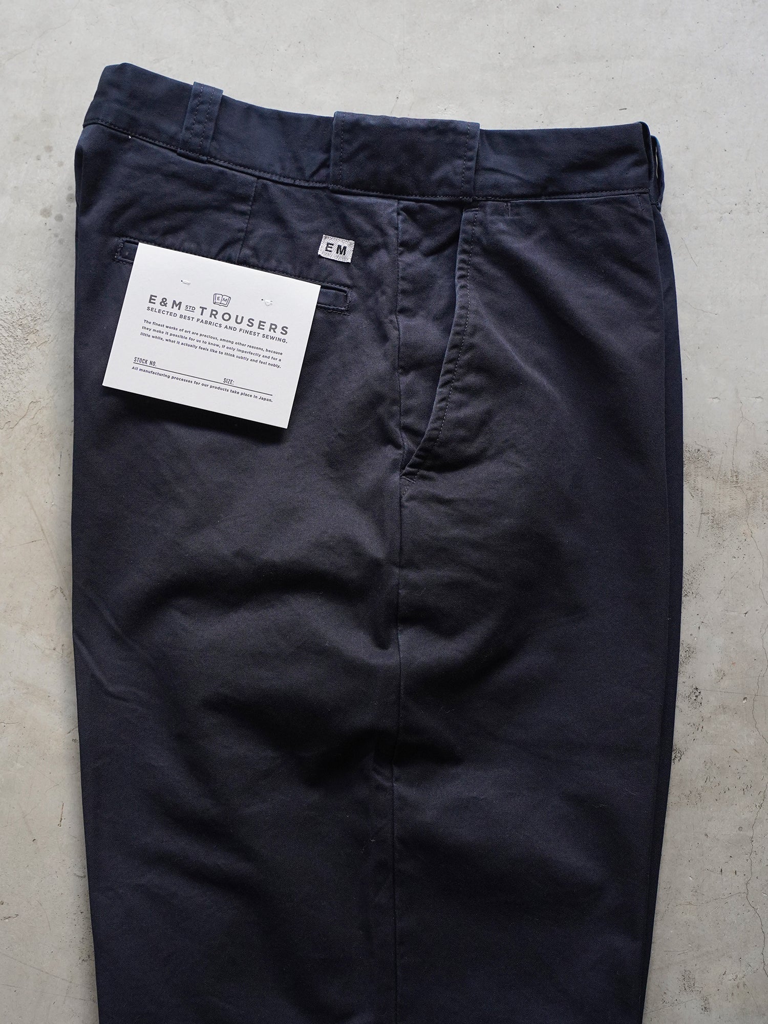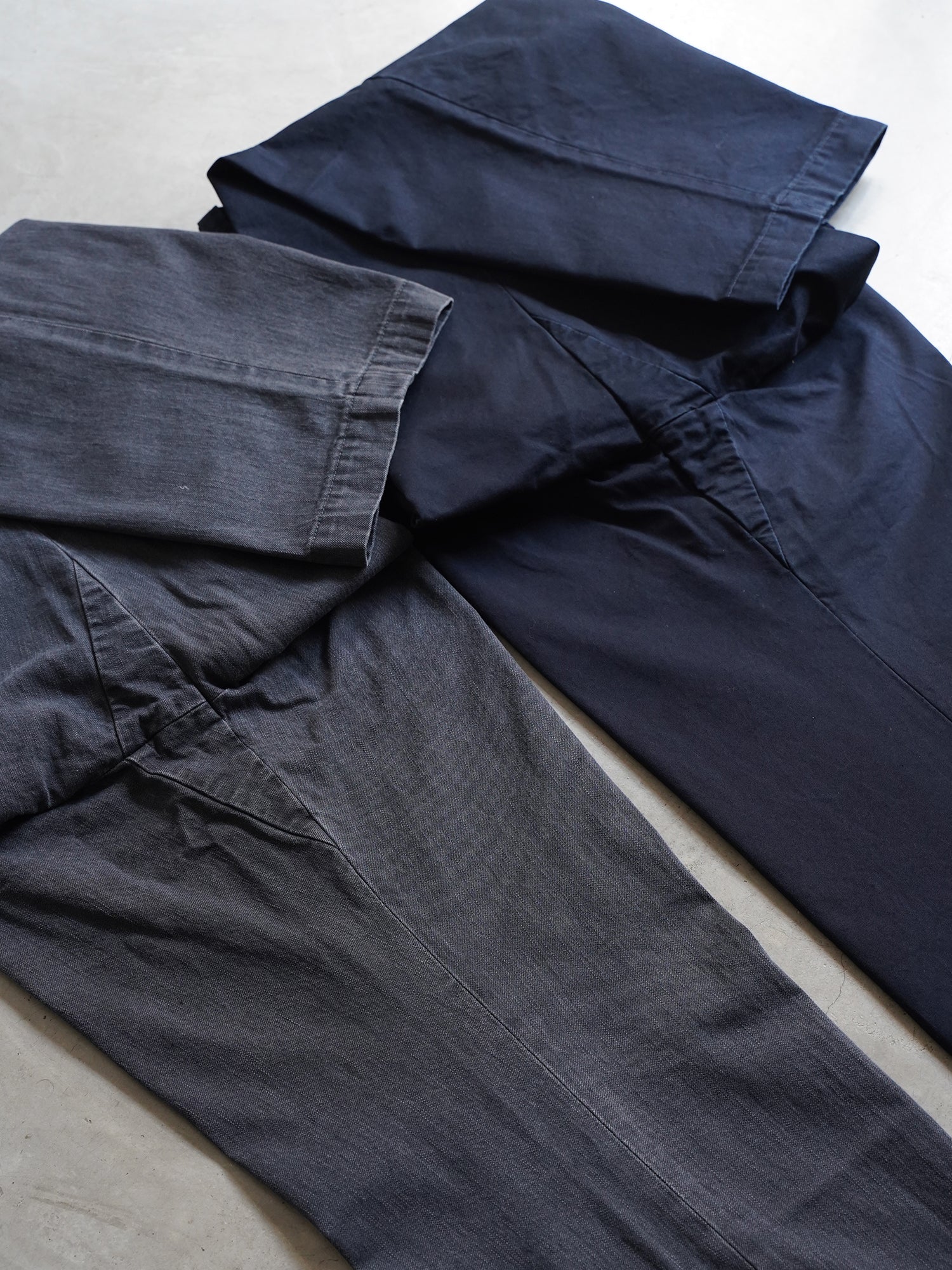摩擦や裂けに非常に強いチノツイルを使用 。ほど良くコシがありながらもしなやかで柔らかい生地は履きこむほどに馴染み良い表情変化していきます。シルエットはEMの中で1番スタンダードな誰にでも履きやすいタイプ。