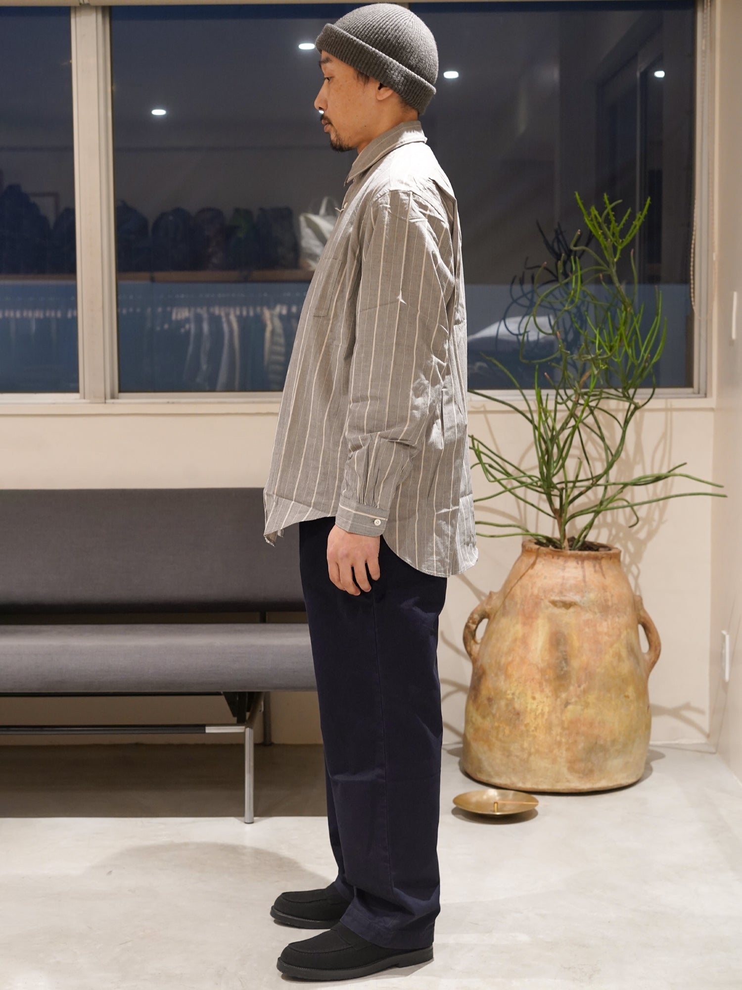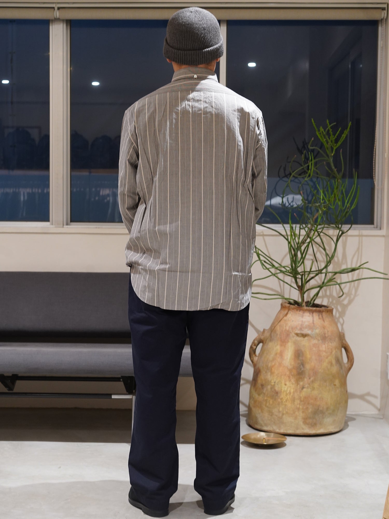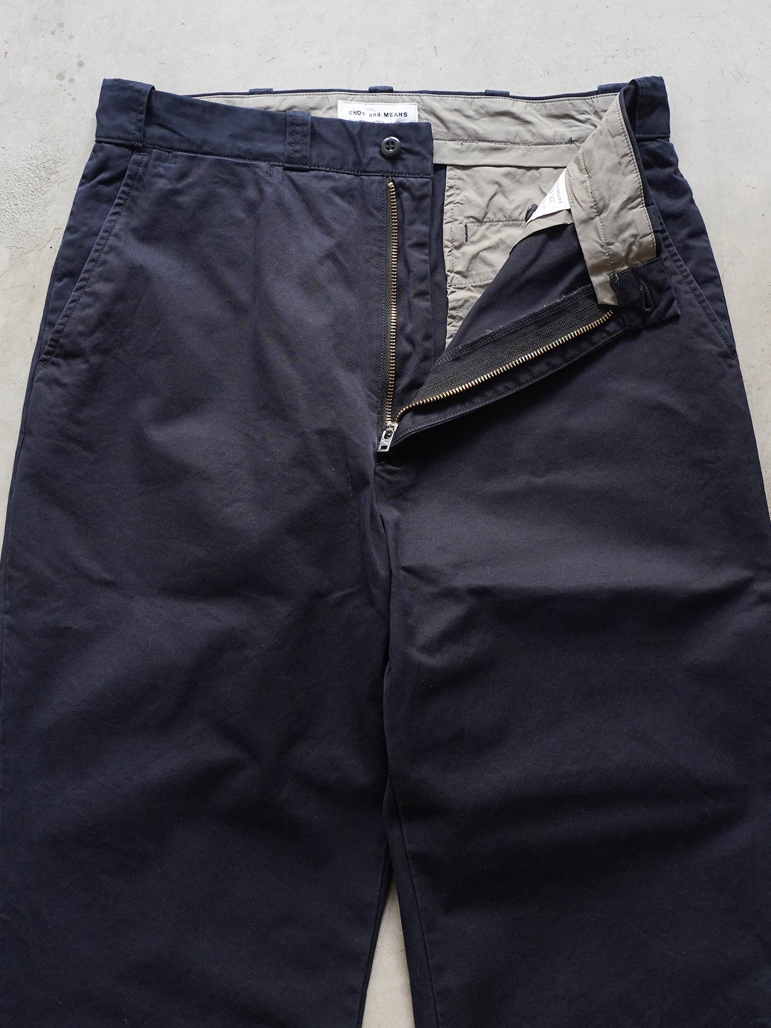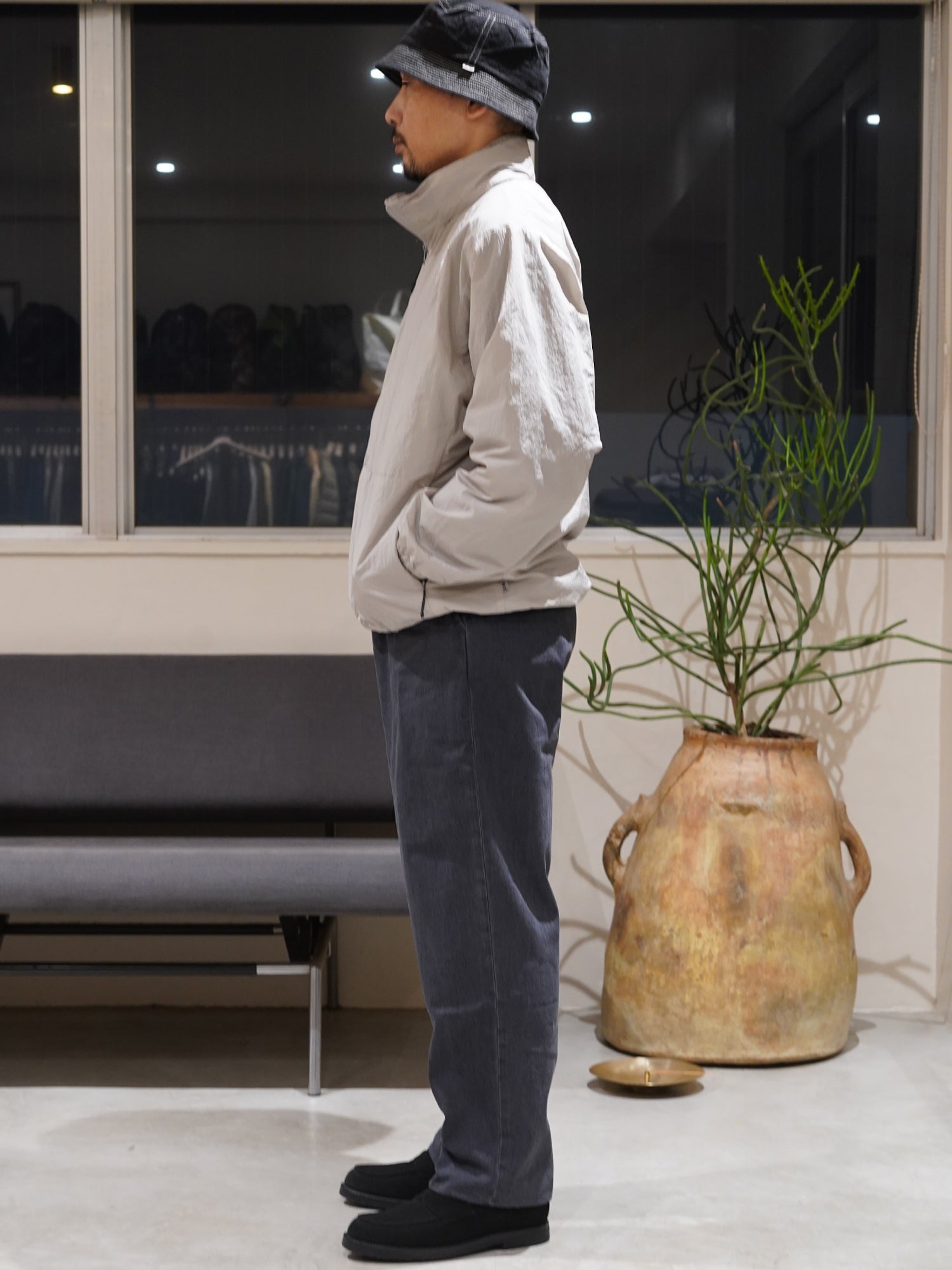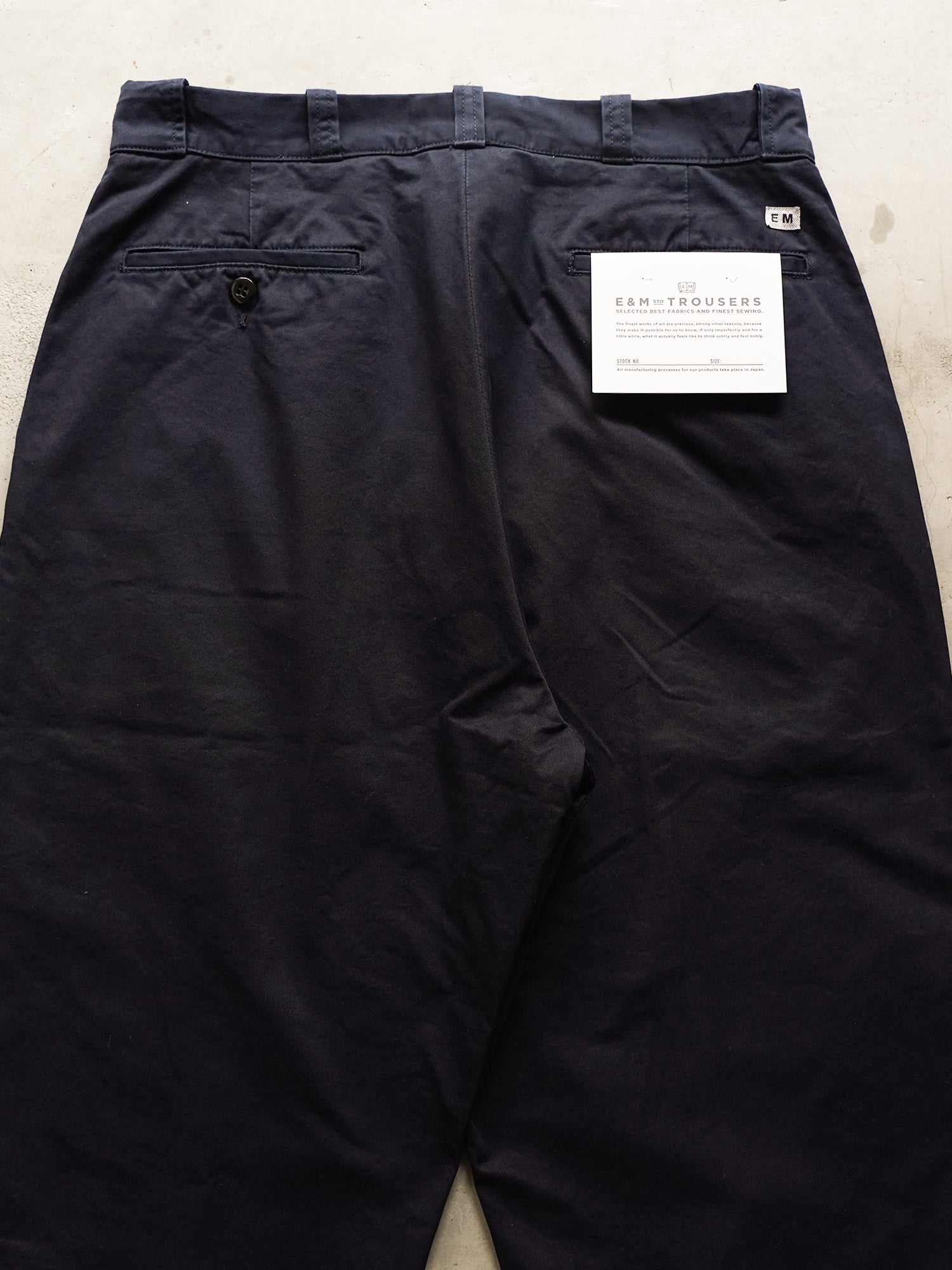 摩擦や裂けに非常に強いチノツイルを使用 。ほど良くコシがありながらもしなやかで柔らかい生地は履きこむほどに馴染み良い表情変化していきます。シルエットはEMの中で1番スタンダードな誰にでも履きやすいタイプ。