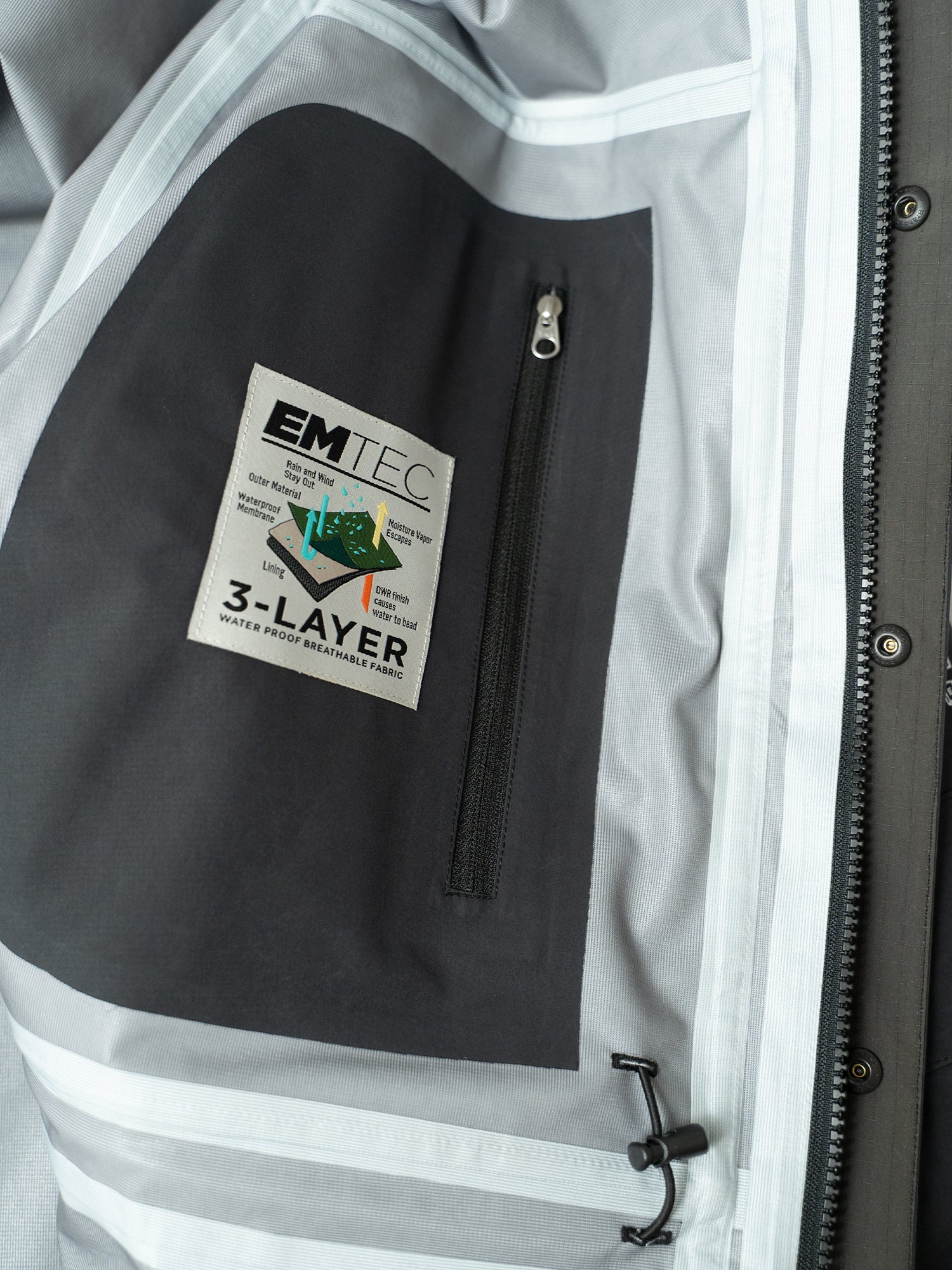 90’sによく見られた止水ジップが使われる前のマウンテンパーカーの形を踏襲し、EMらしいエッセンスを添加した定番のマウンテンパーカー。