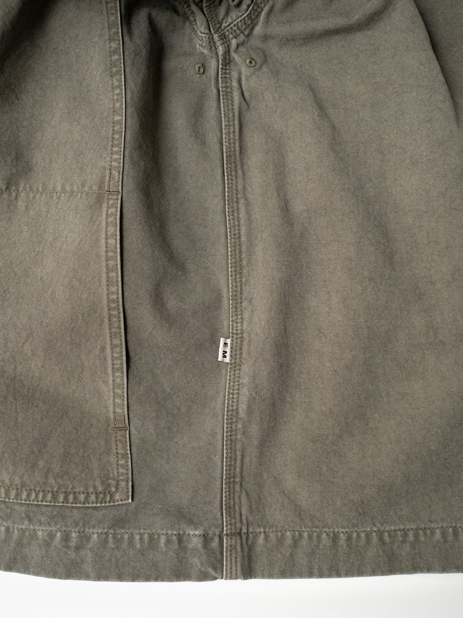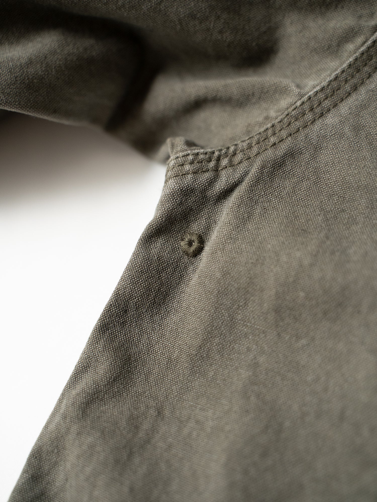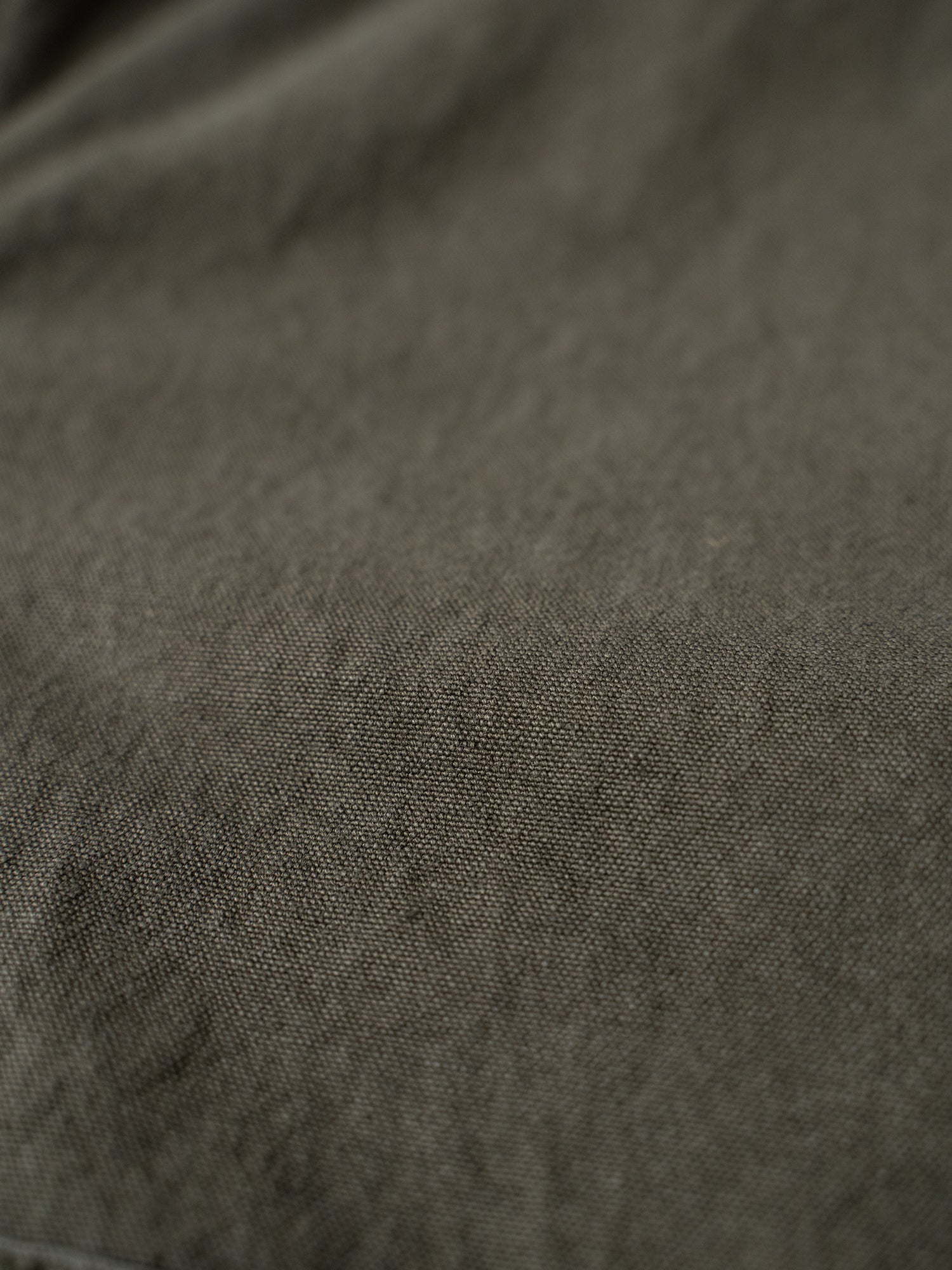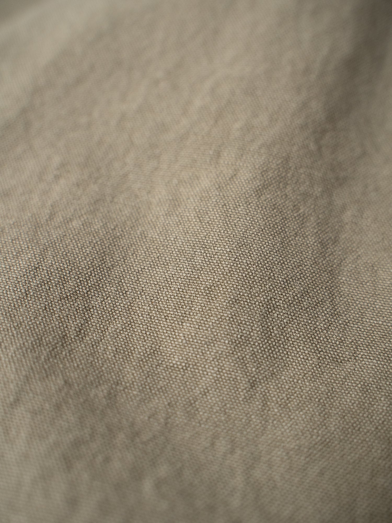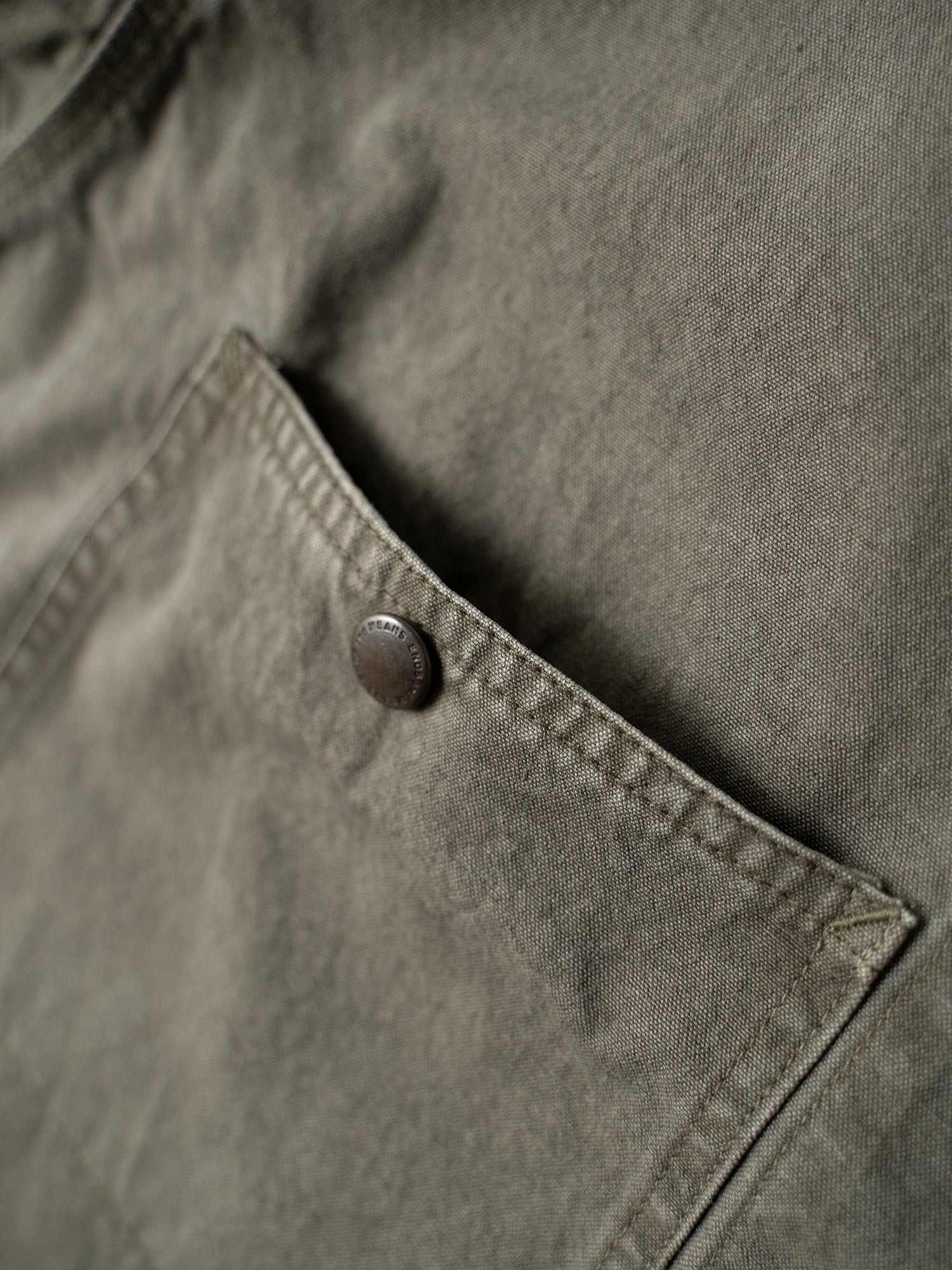 洗い加工を施したコットンリネンのキャンバス生地を使用し、着始めからしっくり馴染む、柔らかく良い塩梅の風合い。ワーク感を醸し出す三本針の環縫い、バランス良いショート丈で、裏無しの春先に着回しのきくアイテム。