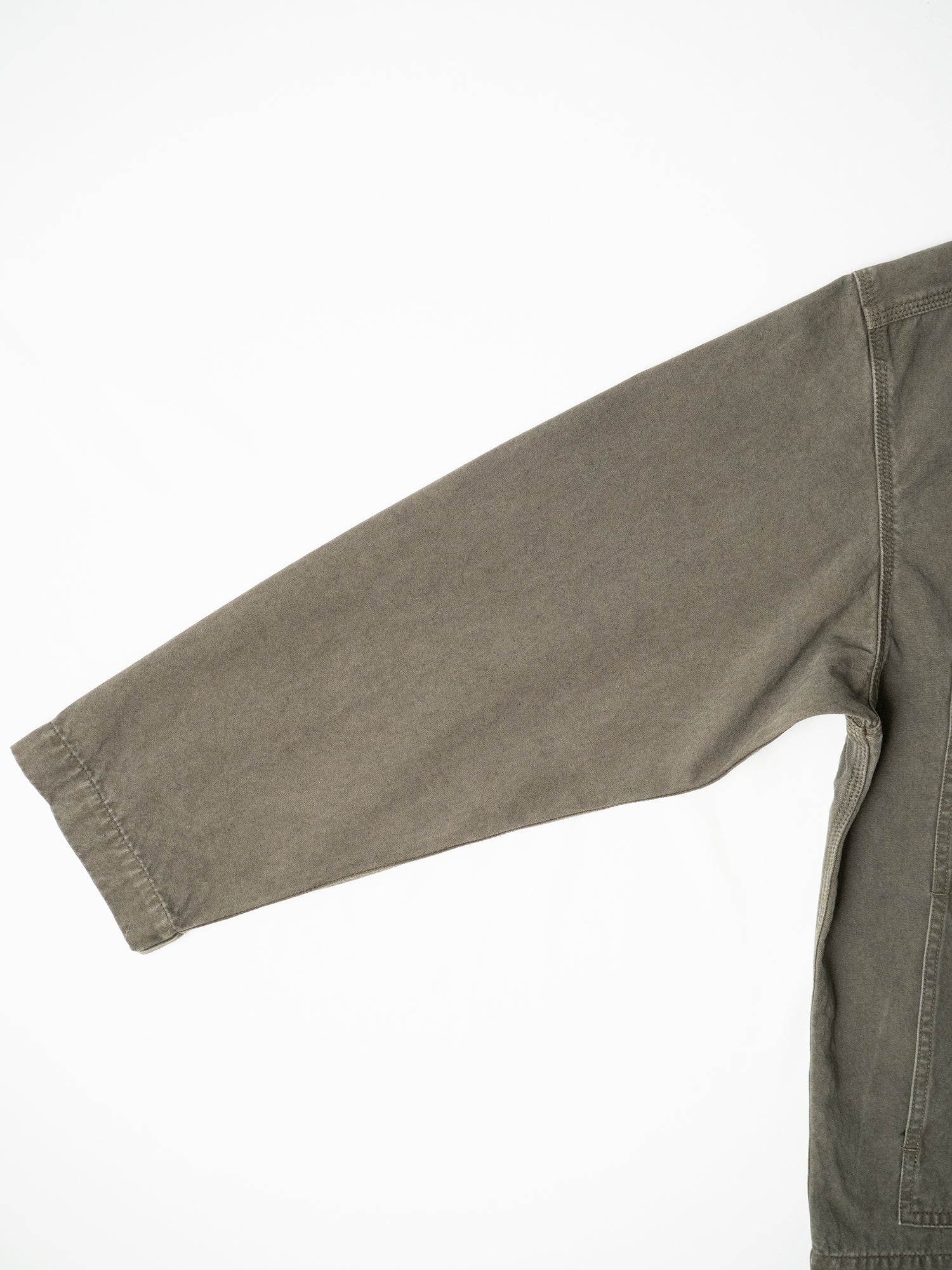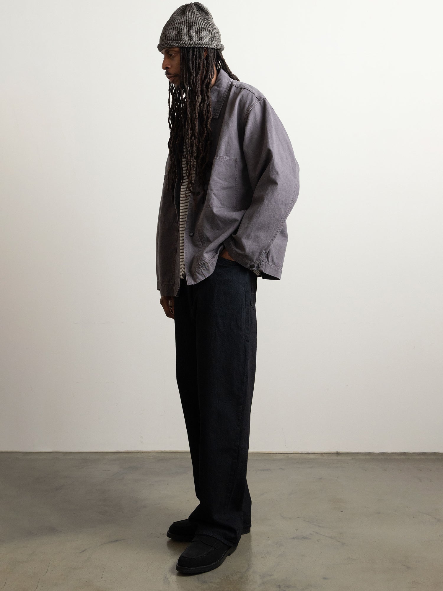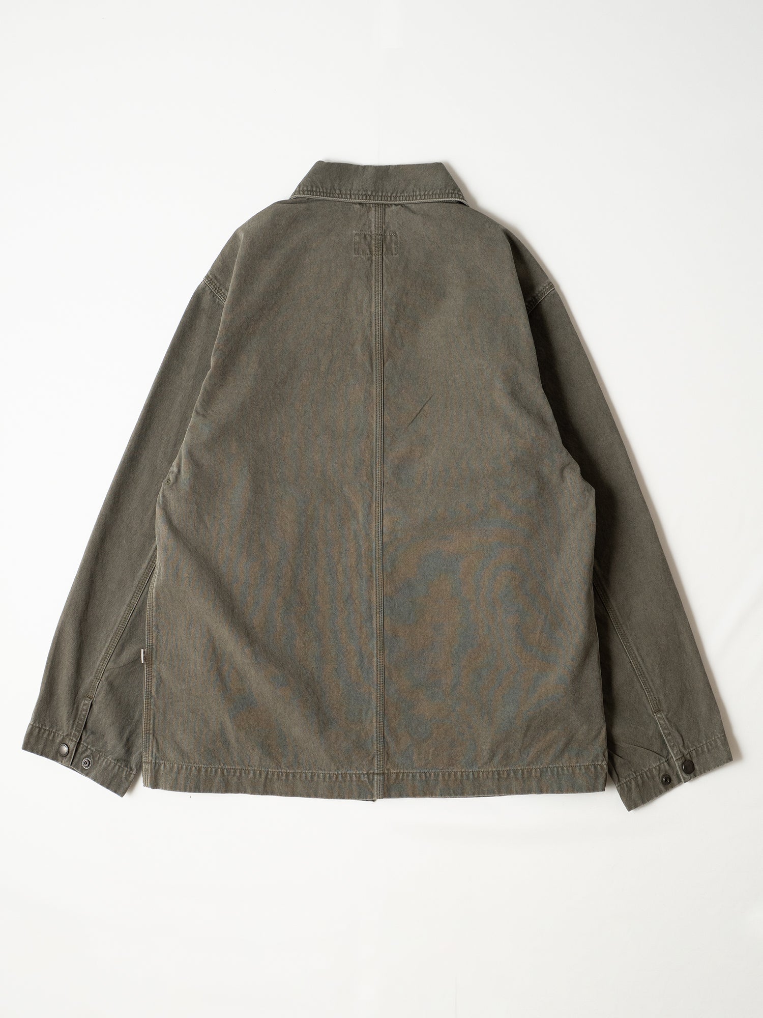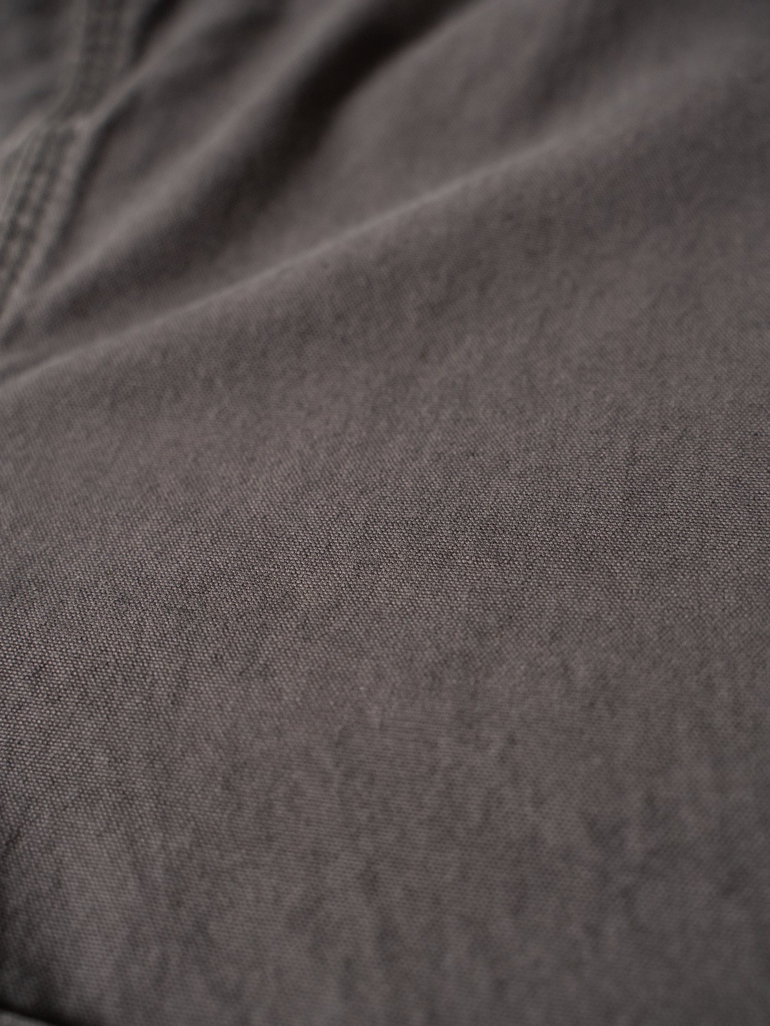 洗い加工を施したコットンリネンのキャンバス生地を使用し、着始めからしっくり馴染む、柔らかく良い塩梅の風合い。ワーク感を醸し出す三本針の環縫い、バランス良いショート丈で、裏無しの春先に着回しのきくアイテム。