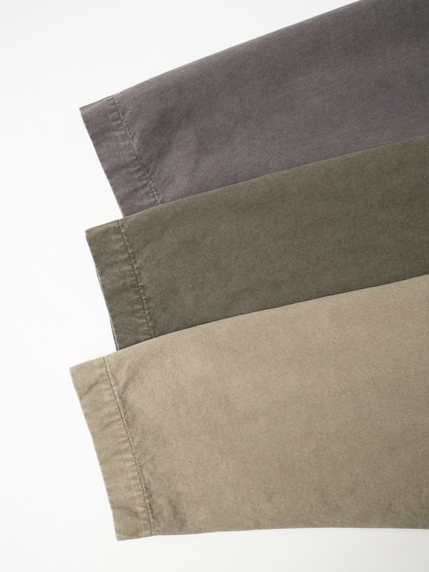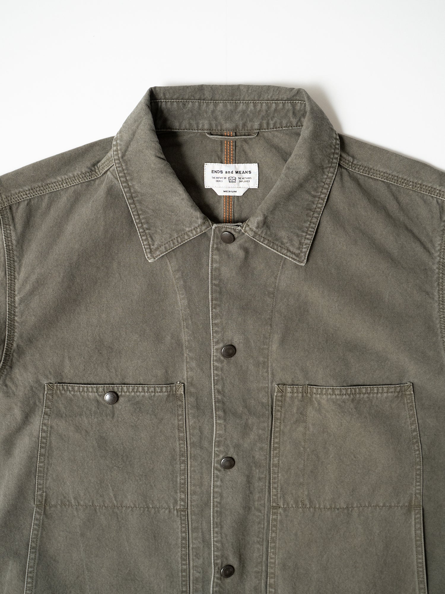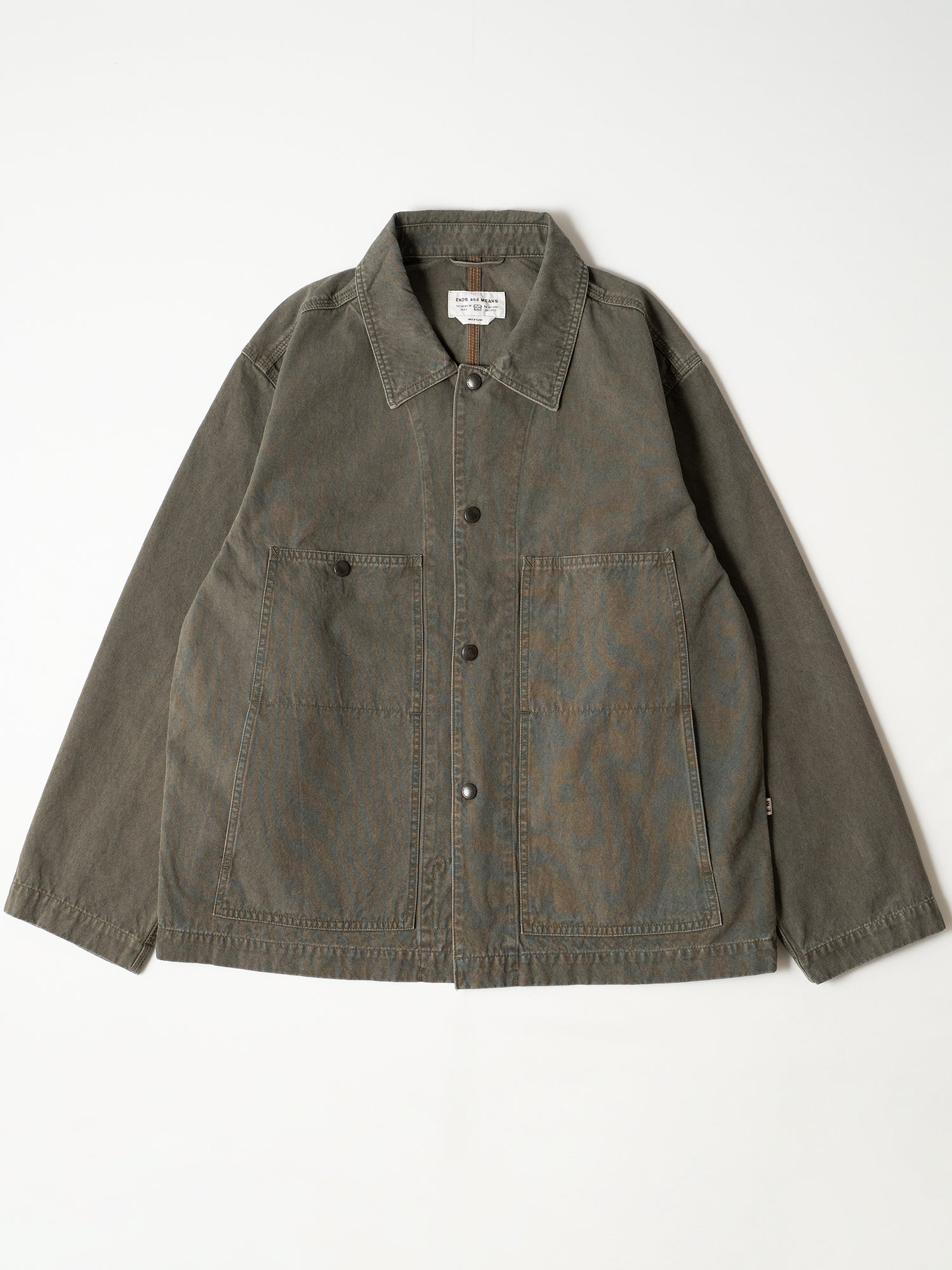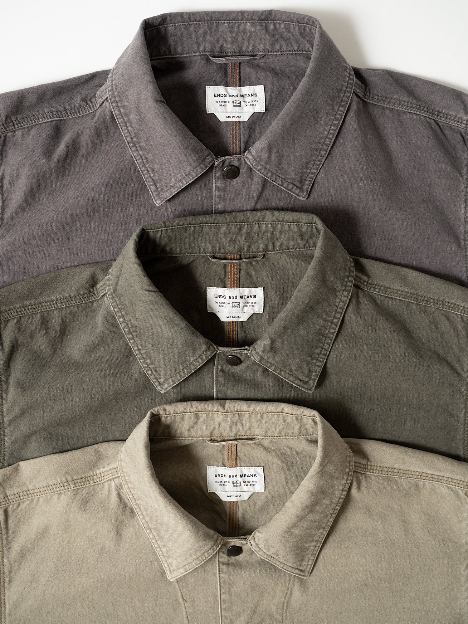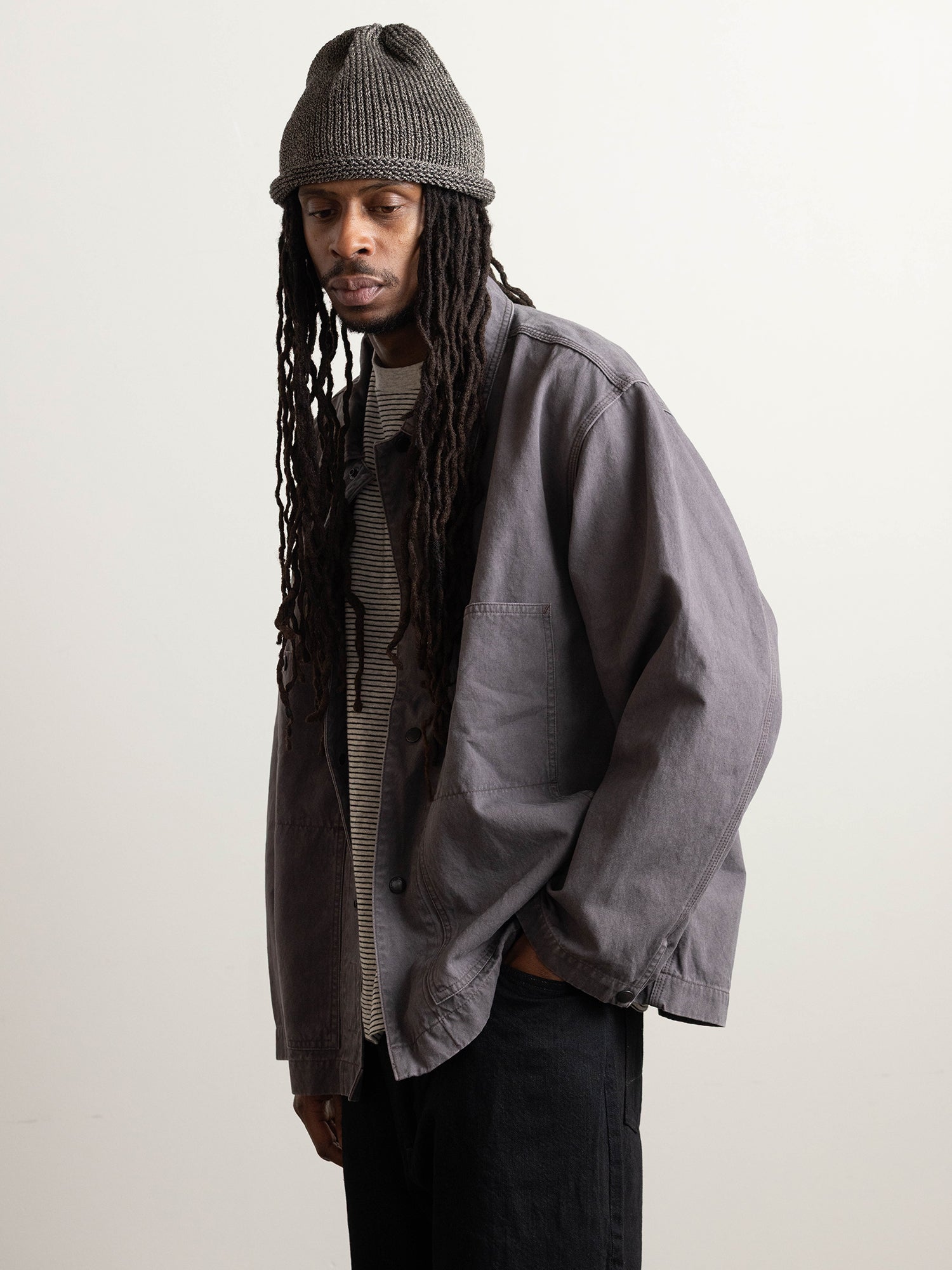 洗い加工を施したコットンリネンのキャンバス生地を使用し、着始めからしっくり馴染む、柔らかく良い塩梅の風合い。ワーク感を醸し出す三本針の環縫い、バランス良いショート丈で、裏無しの春先に着回しのきくアイテム。