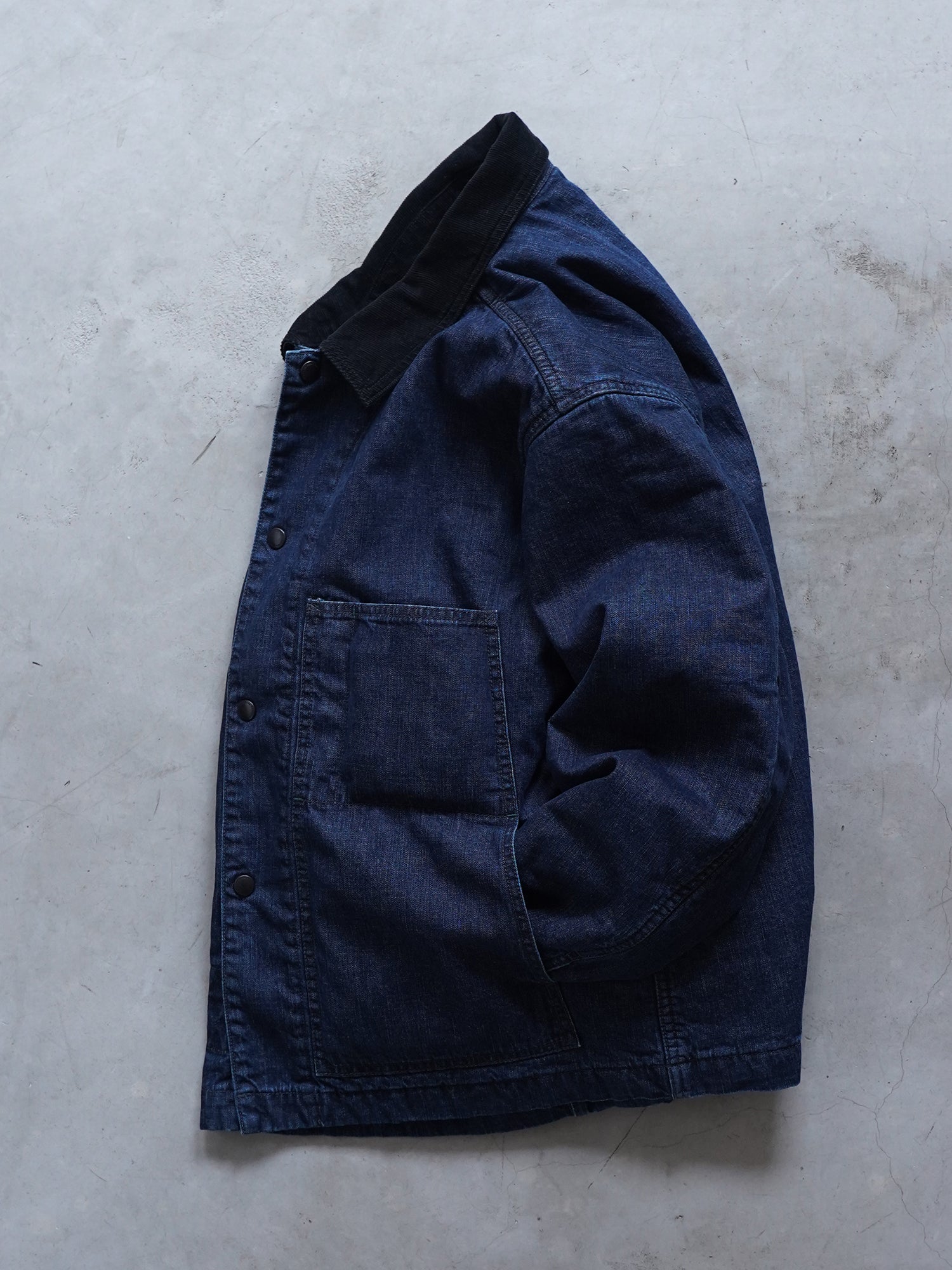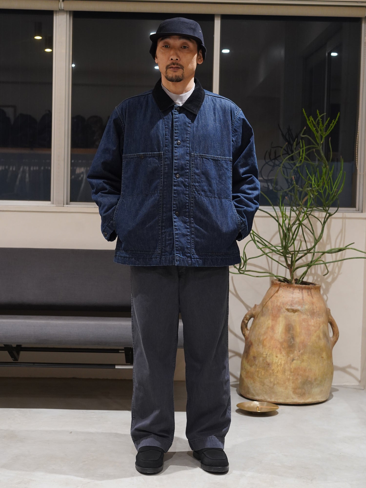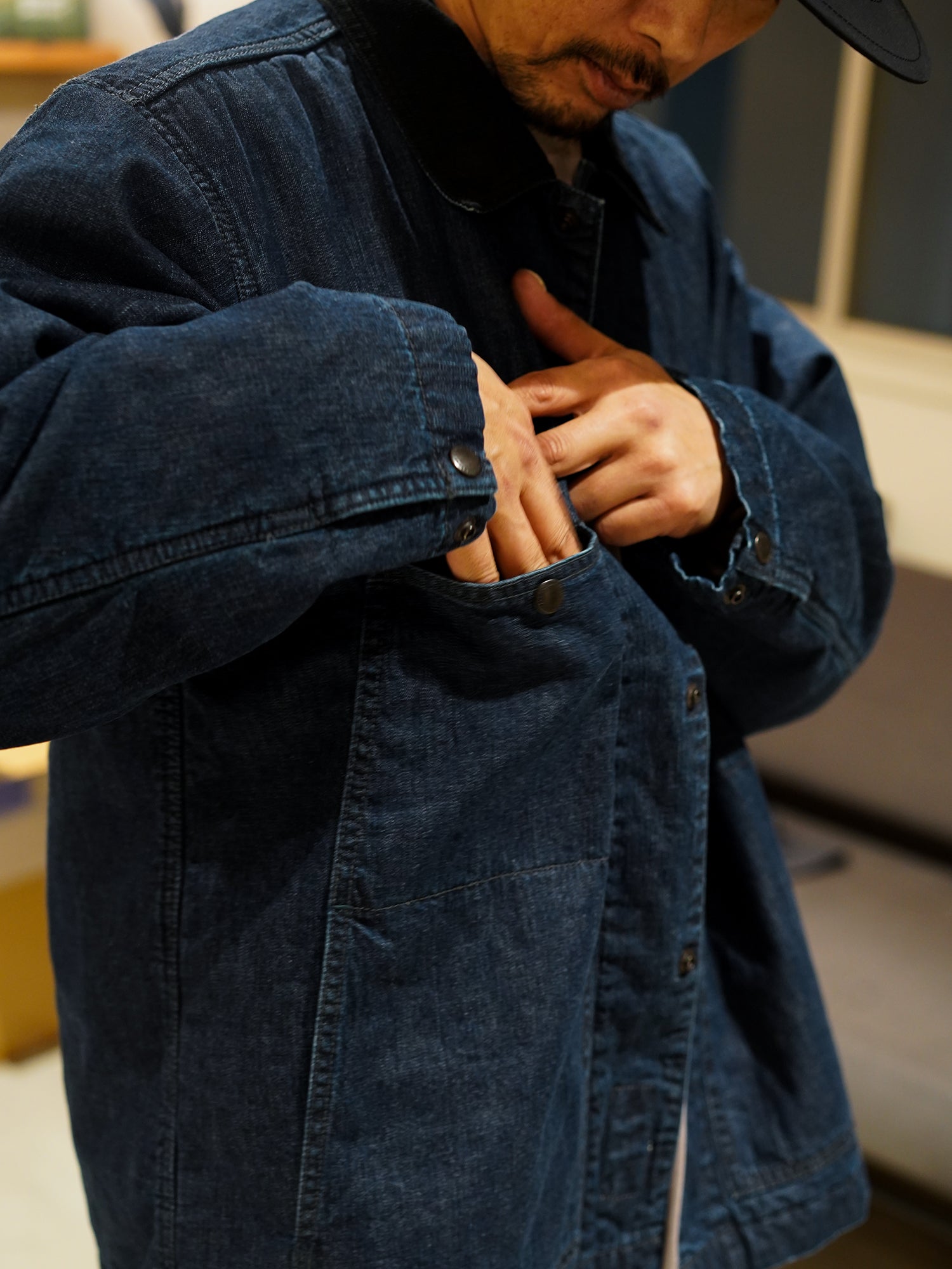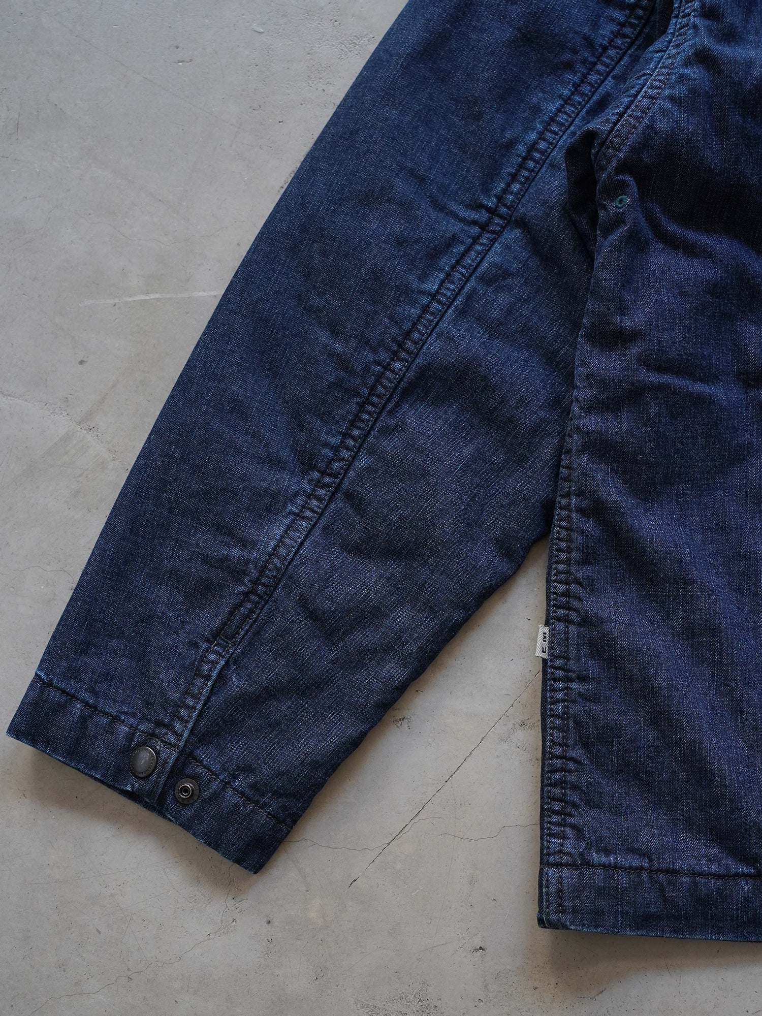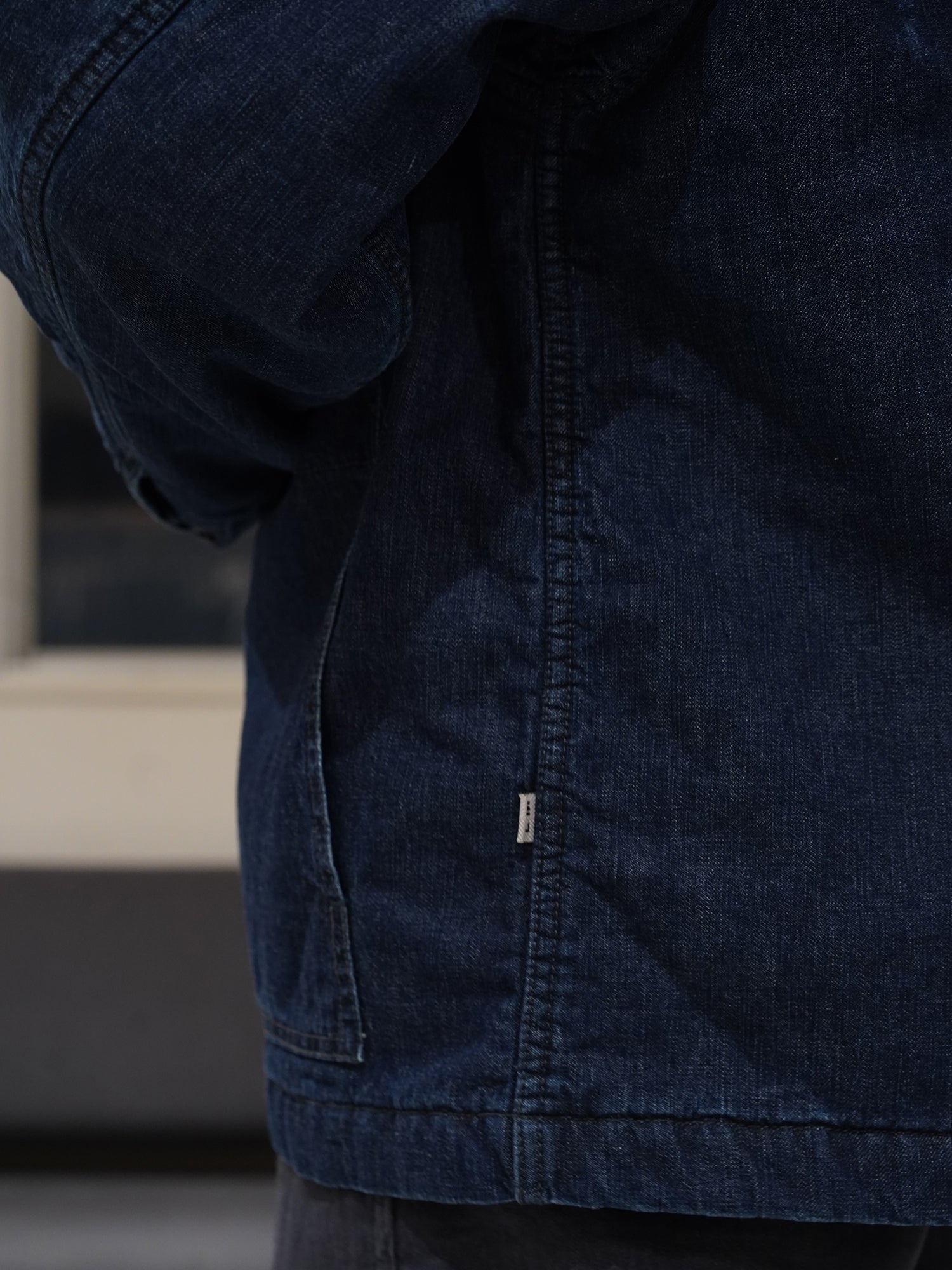 表地は9ozのジンバブエコットンを使用し着始めから馴染むよう洗い加工を程よく施し、若干緑がかったインディゴ生地。