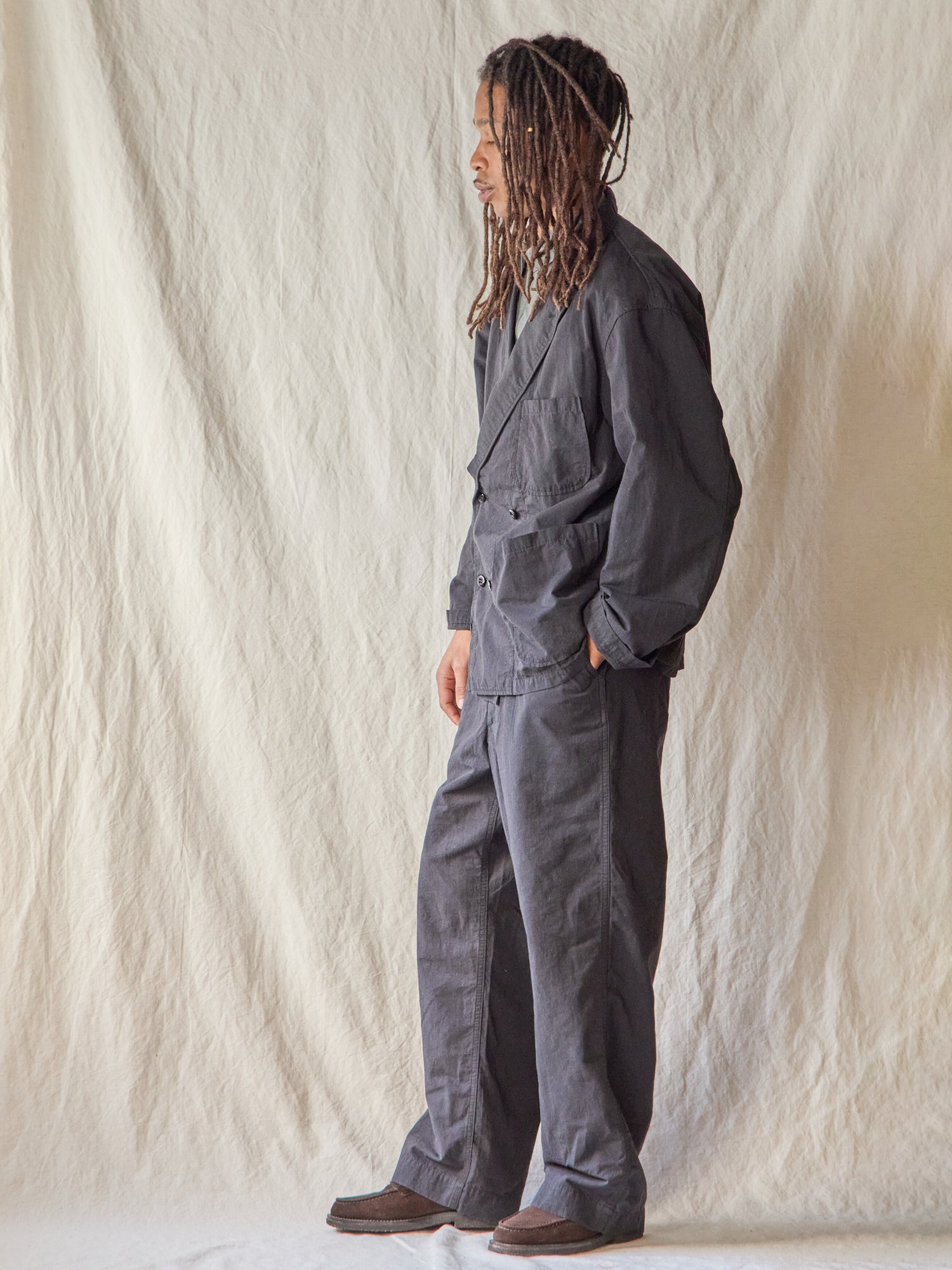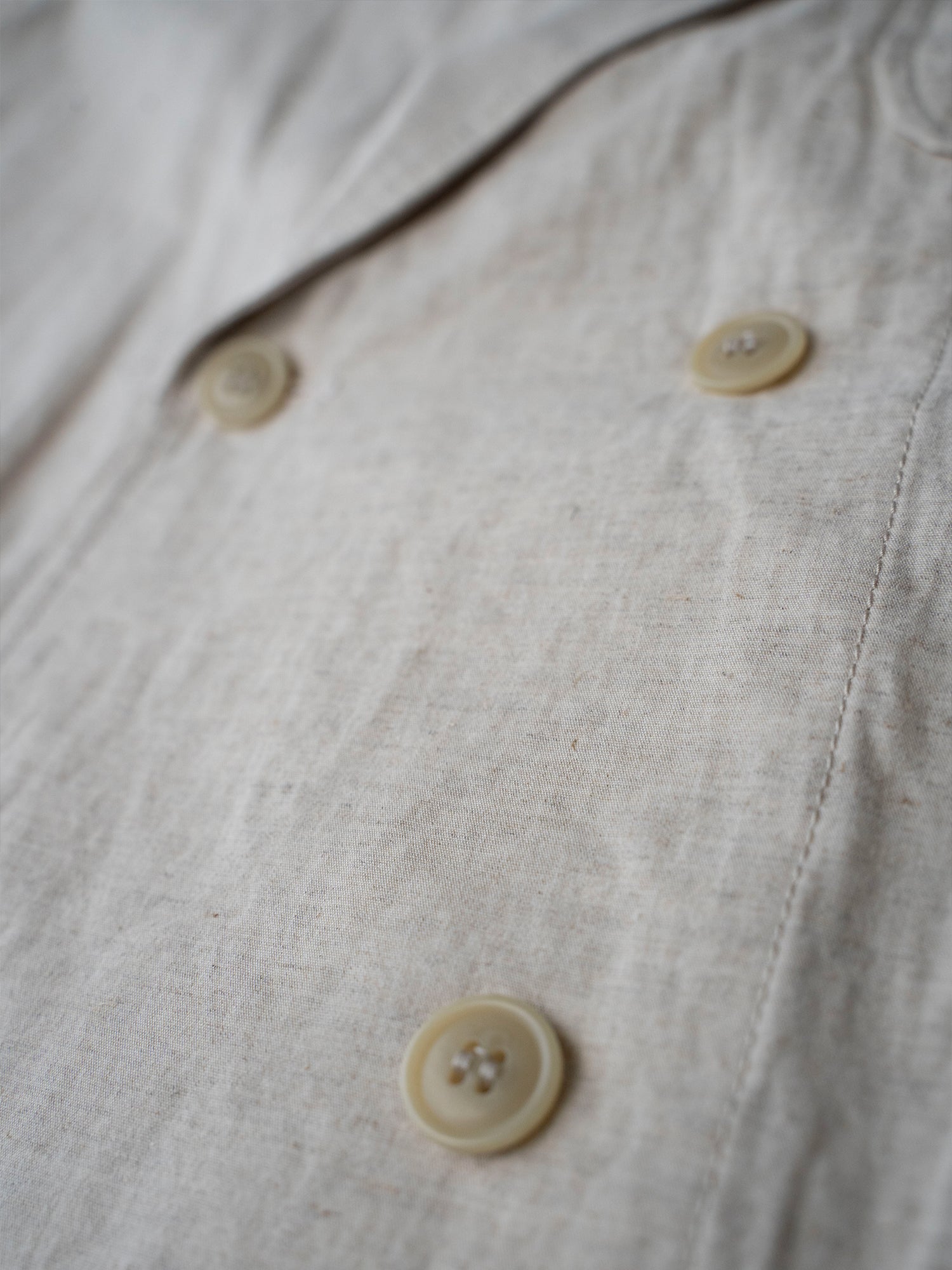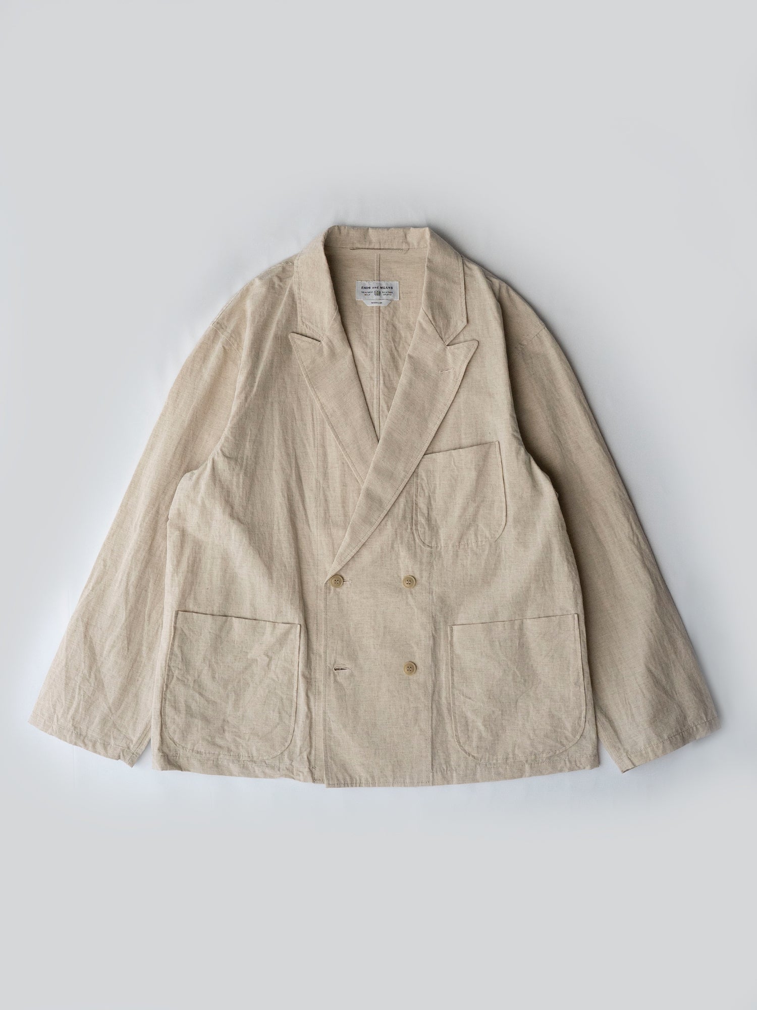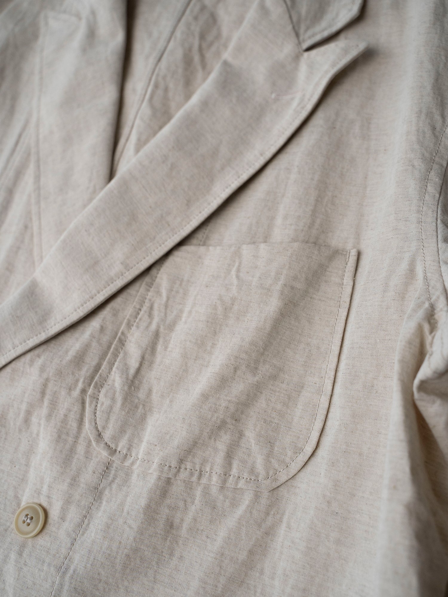 肌触りの良いコットンナイロンリネン生地を使った春夏に丁度良い素材感のDouble Breasted Work Jacket。