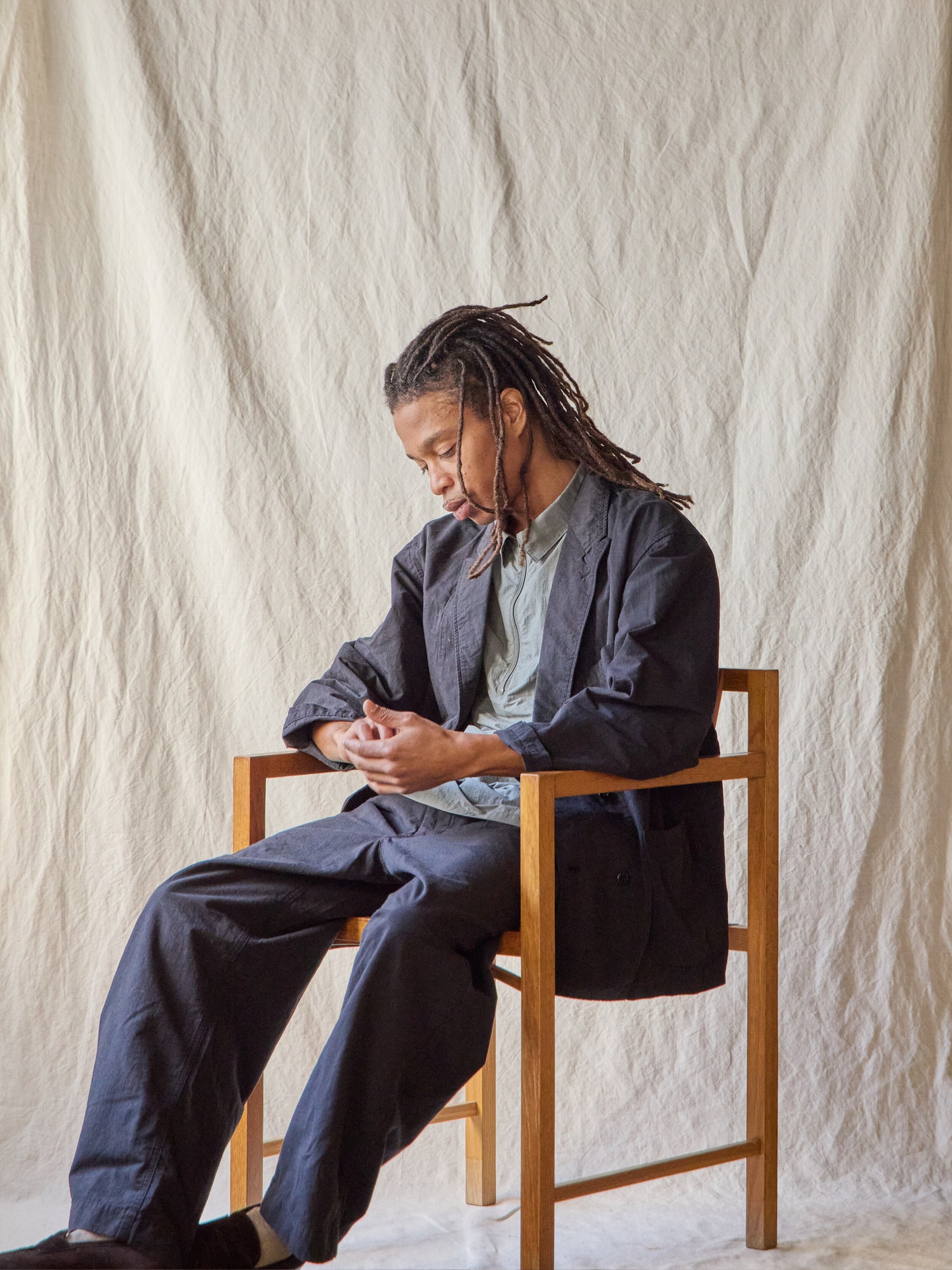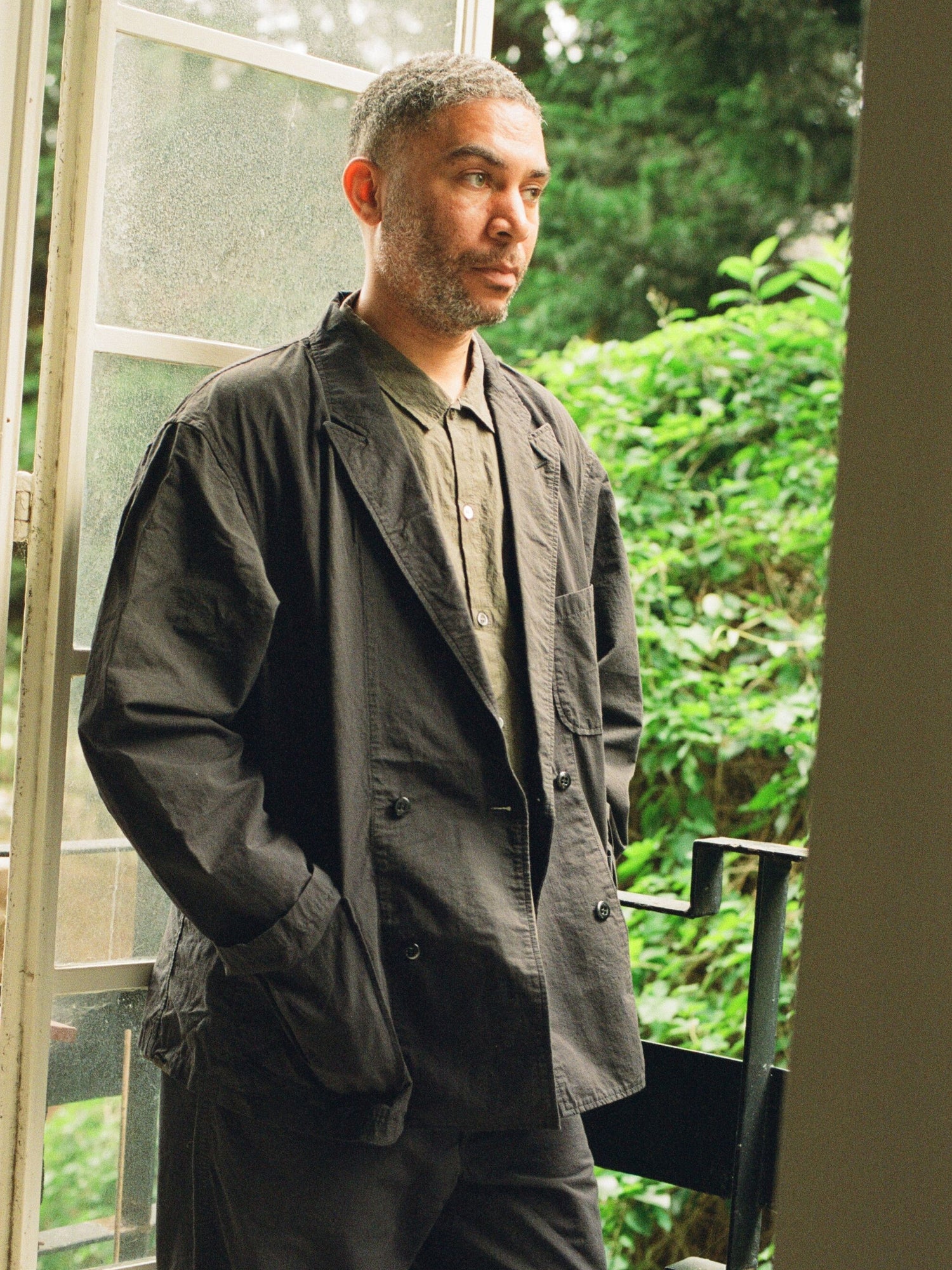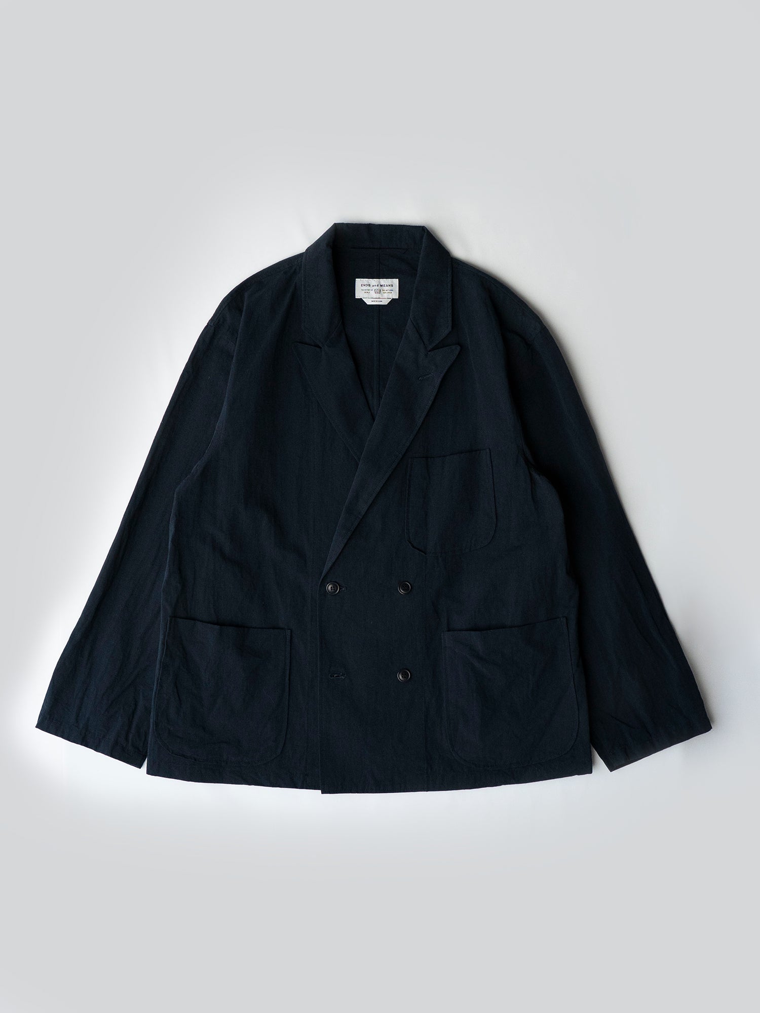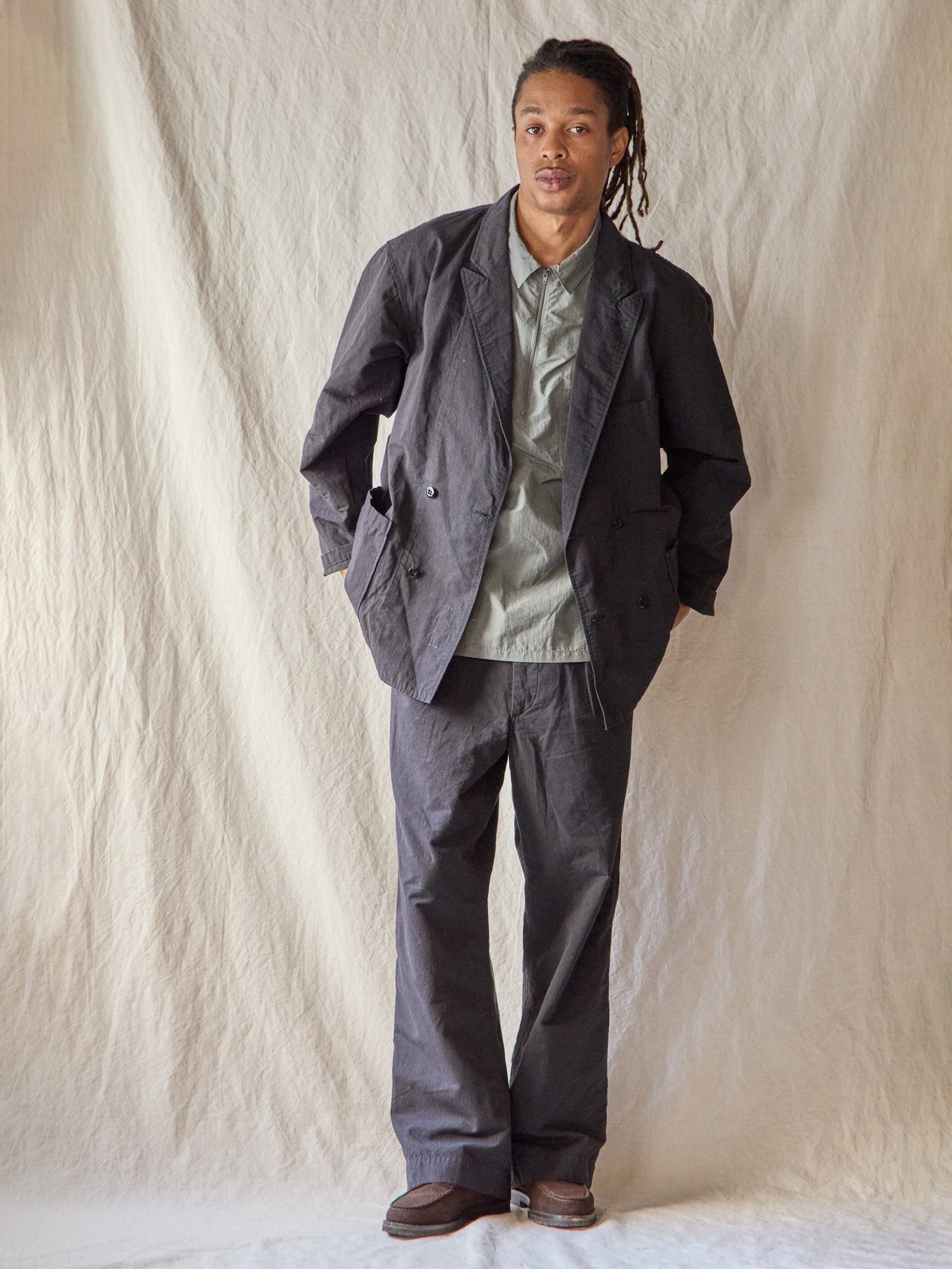 肌触りの良いコットンナイロンリネン生地を使った春夏に丁度良い素材感のDouble Breasted Work Jacket。