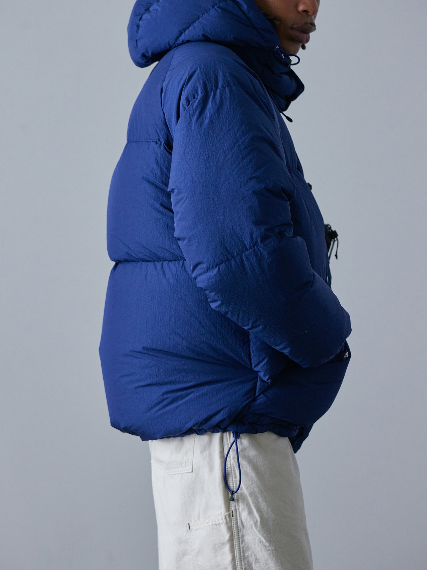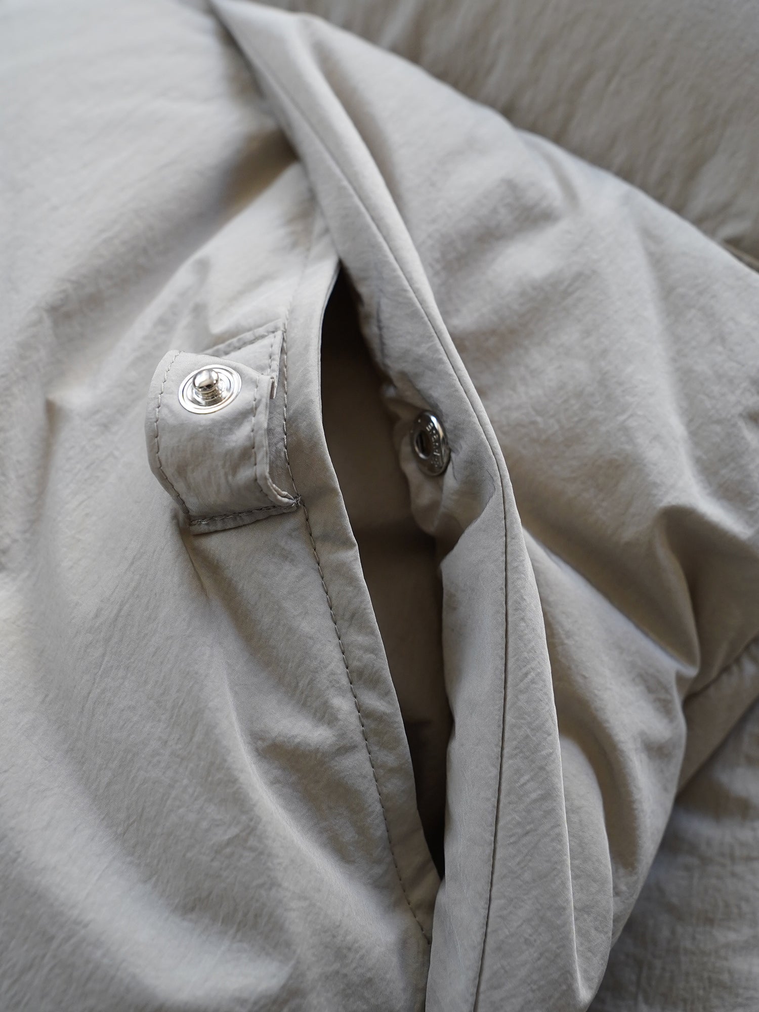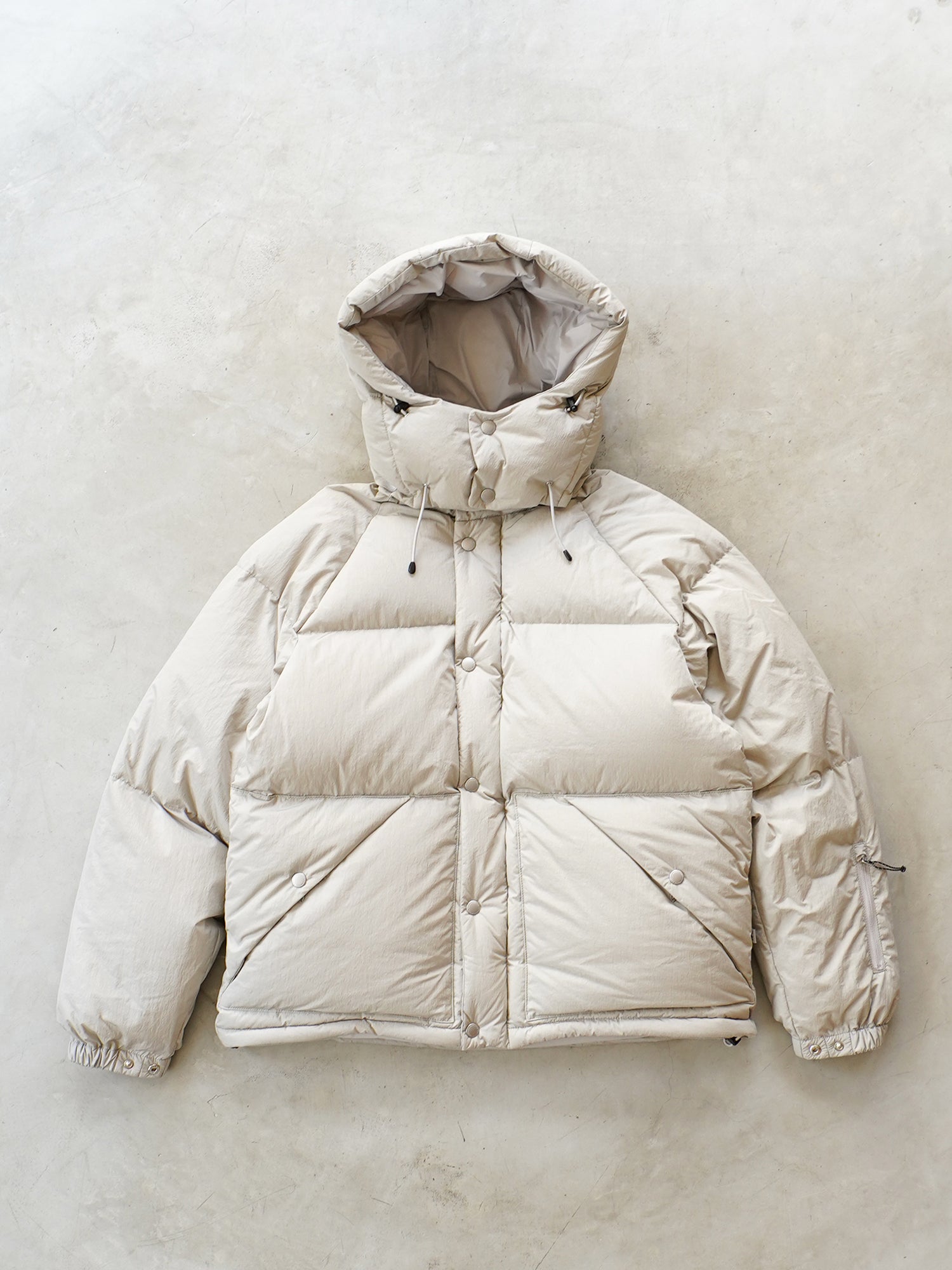 レトロアウトドアのスタイルを踏襲しつつ細部をアップデートしたダウンジャケットになります。薄手でシャリ感のあるマットなナイロンを表地に河田フェザーのリサイクル羽毛を使用。
