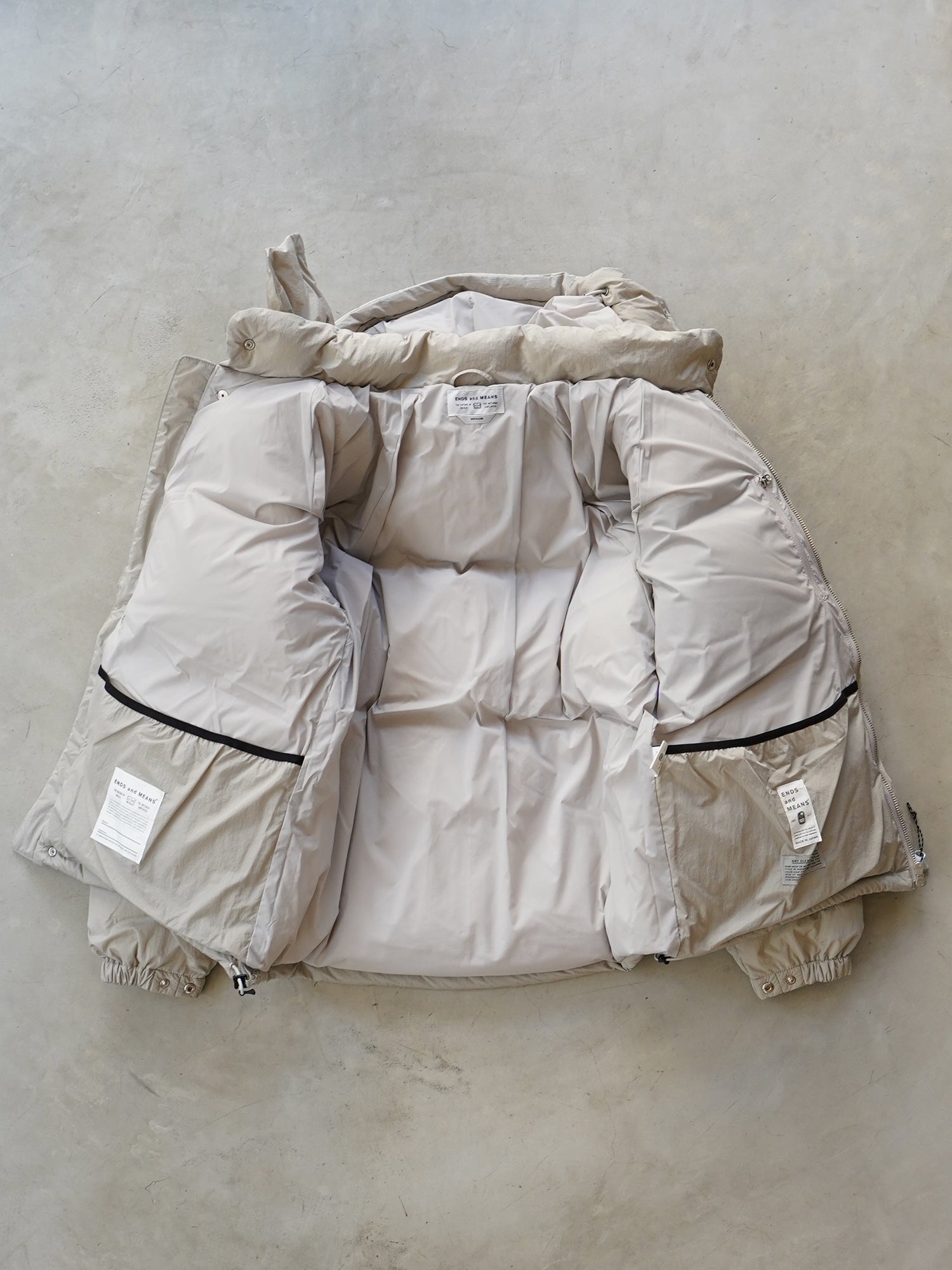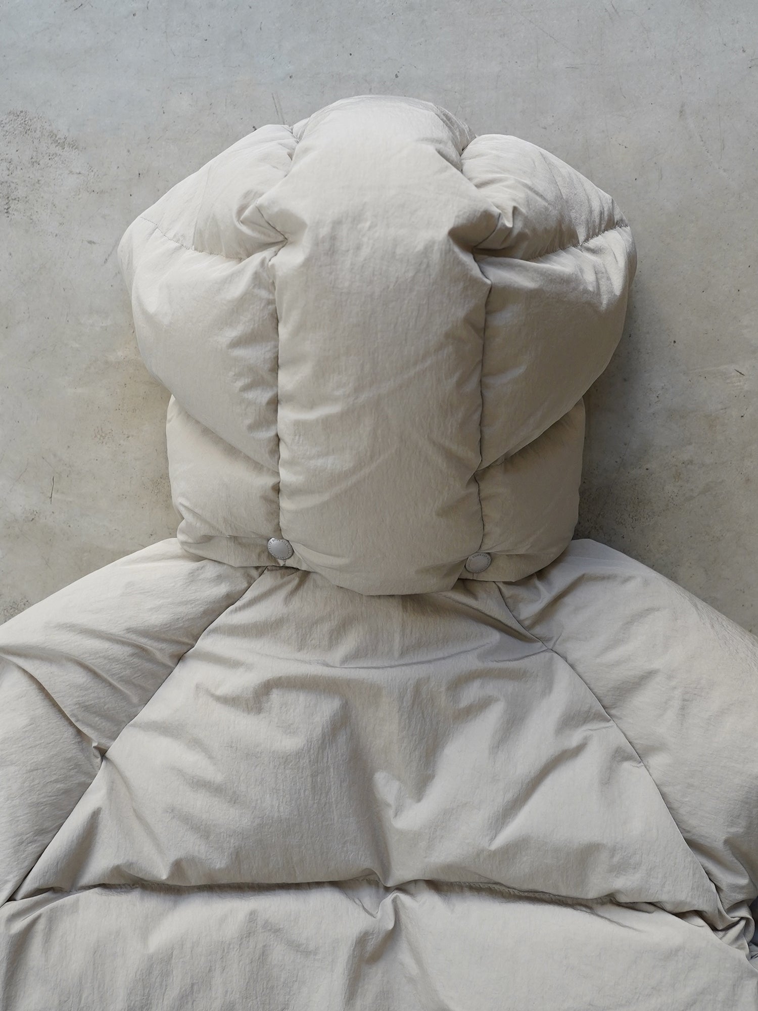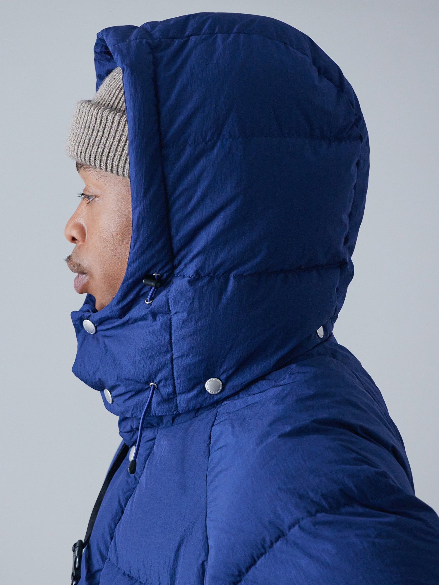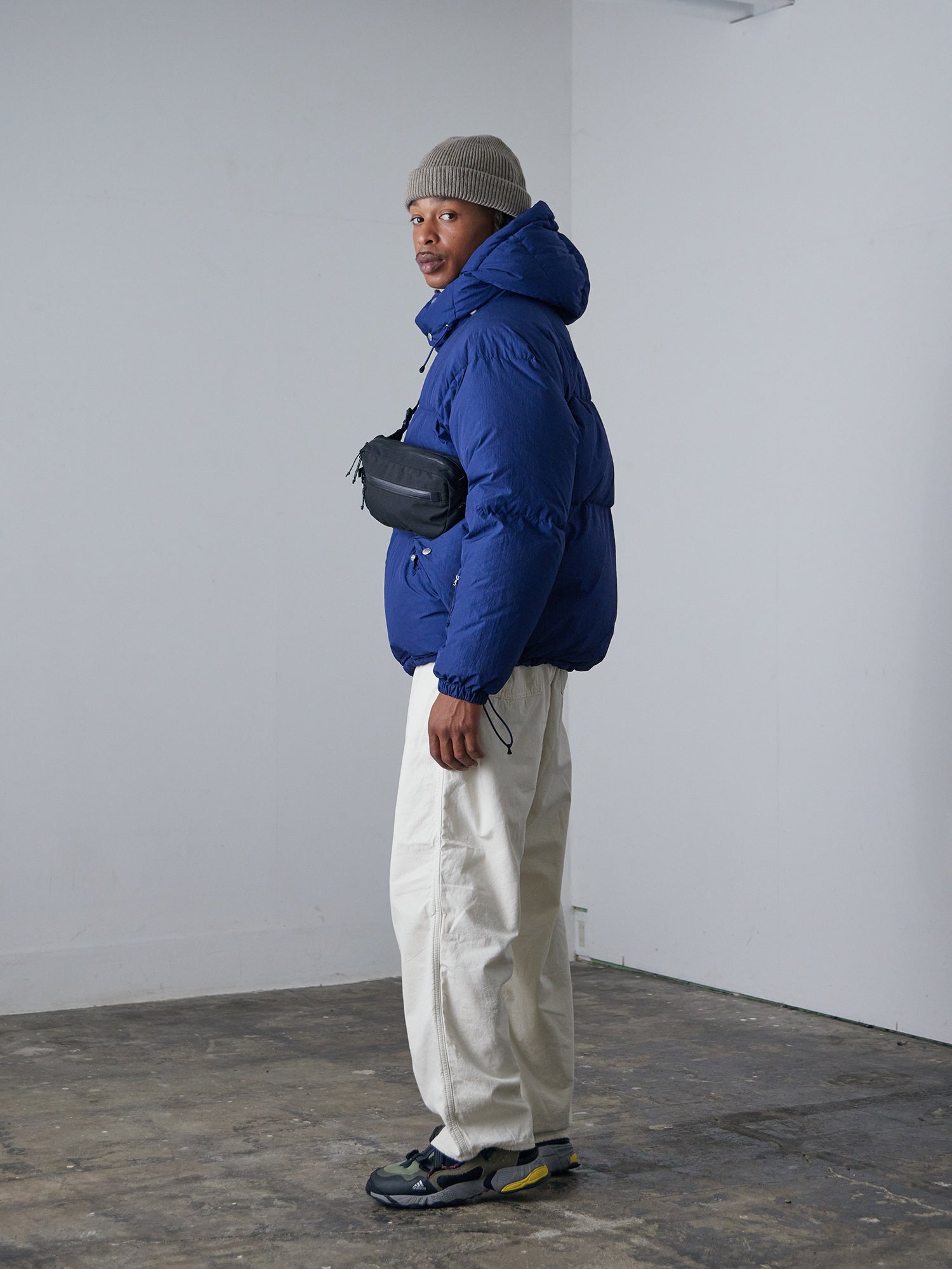 レトロアウトドアのスタイルを踏襲しつつ細部をアップデートしたダウンジャケットになります。薄手でシャリ感のあるマットなナイロンを表地に河田フェザーのリサイクル羽毛を使用。