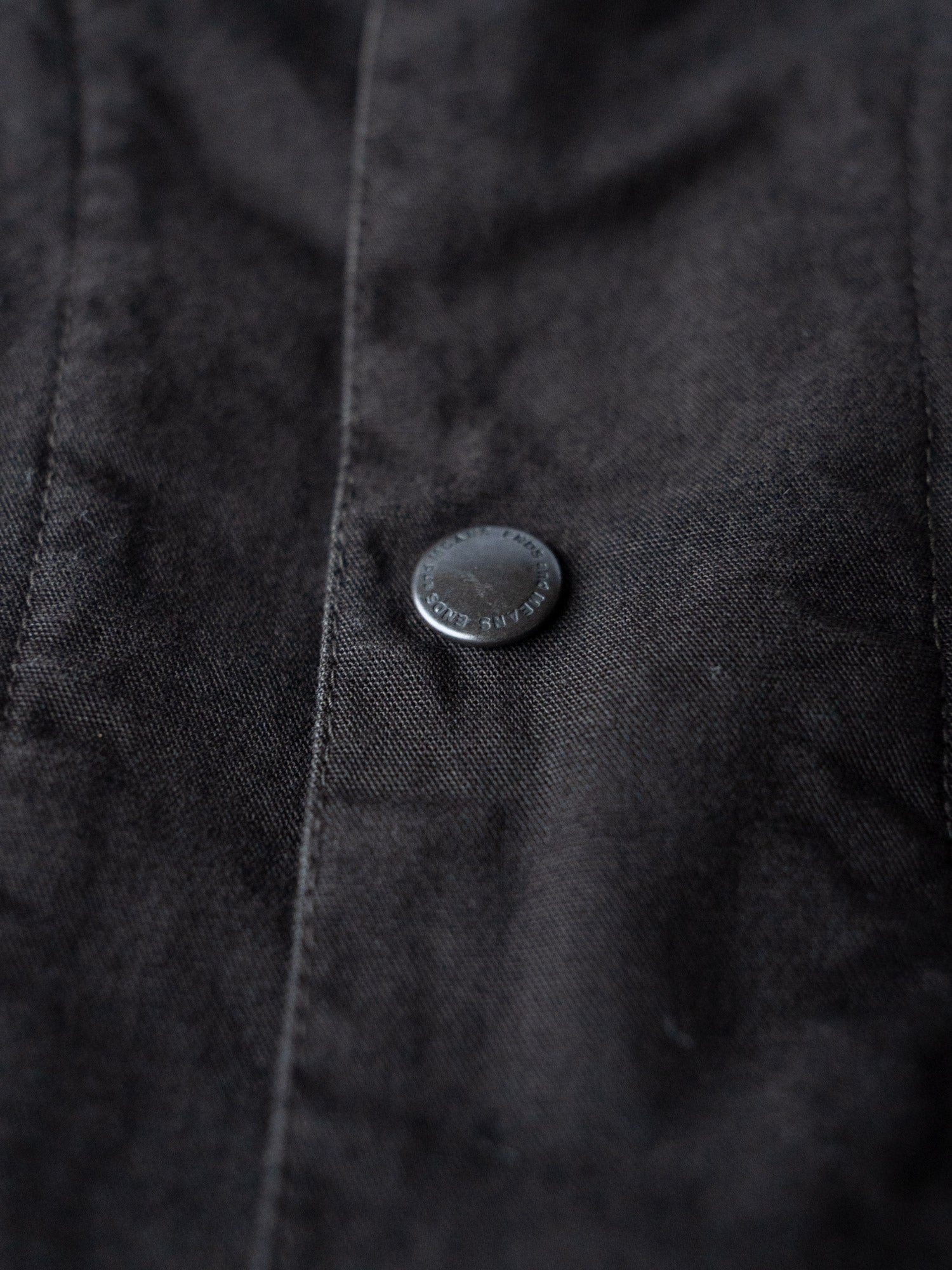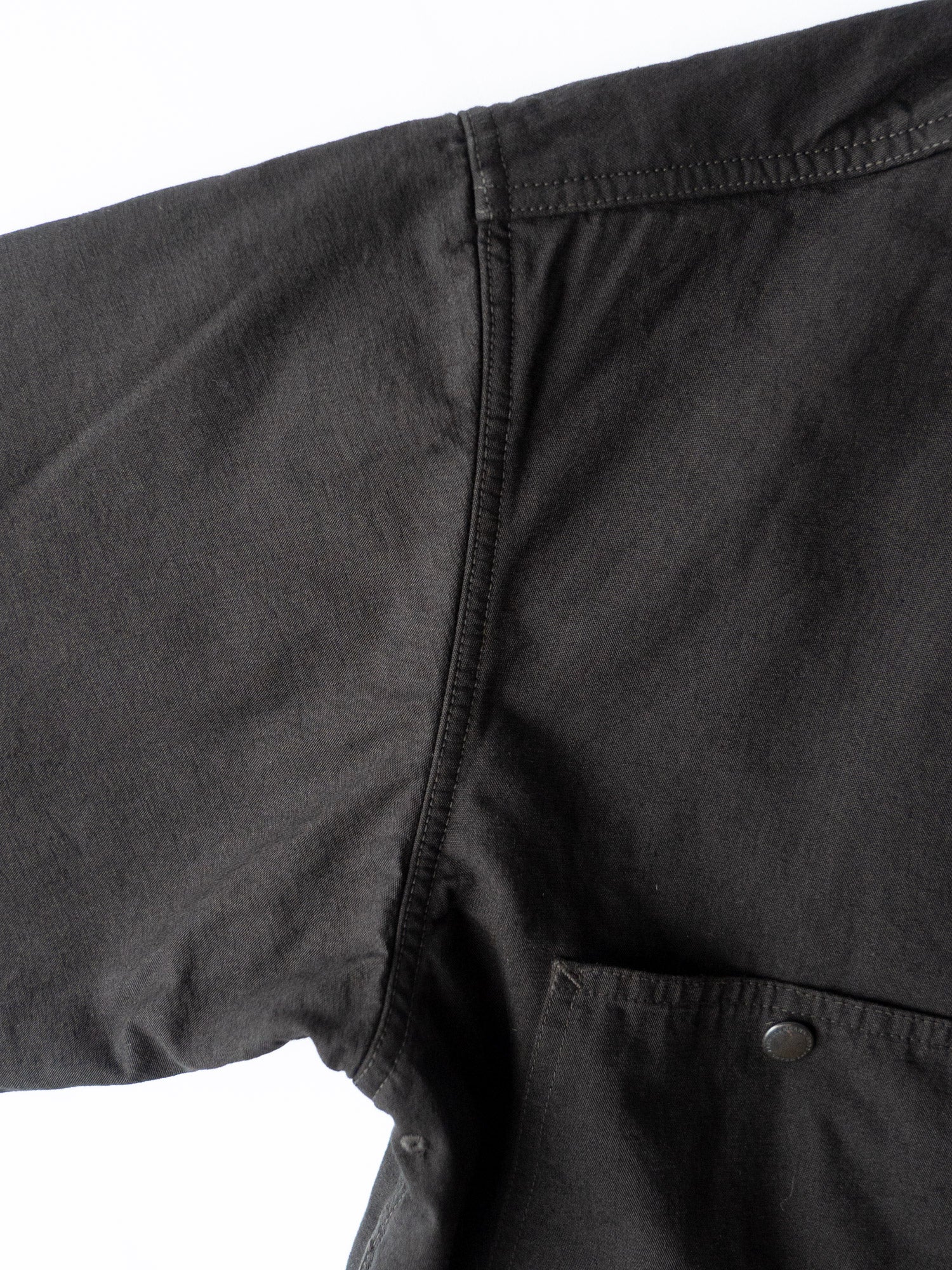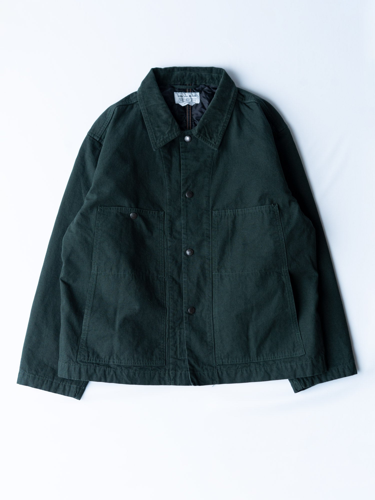通常のキャンバス生地よりもしなやかで品がある強撚オーガニックコットン糸で折り上げたキャンバス生地を使用。襟はコーデュロイ生地。内側には程よい厚さのキルティングライニング。