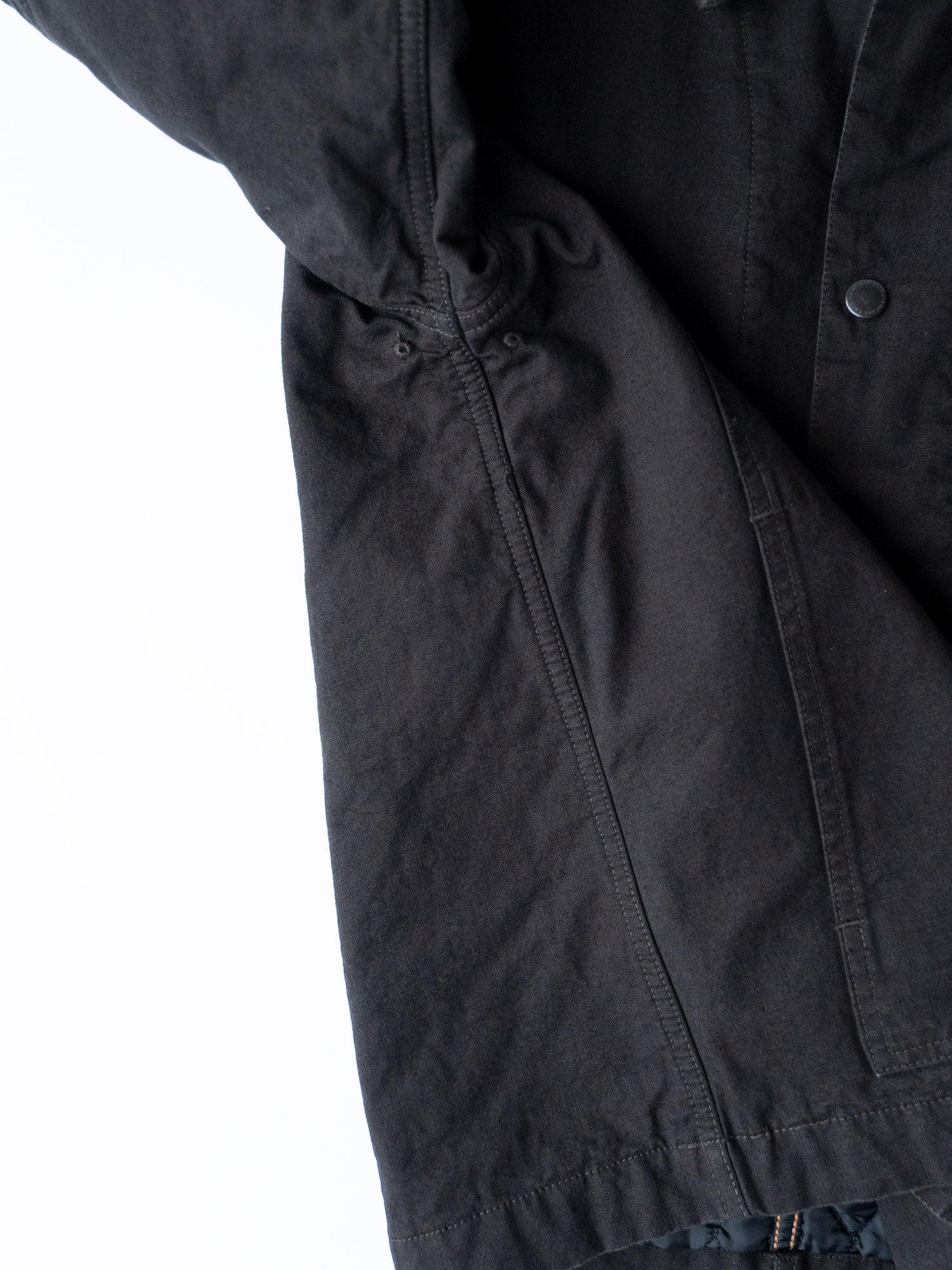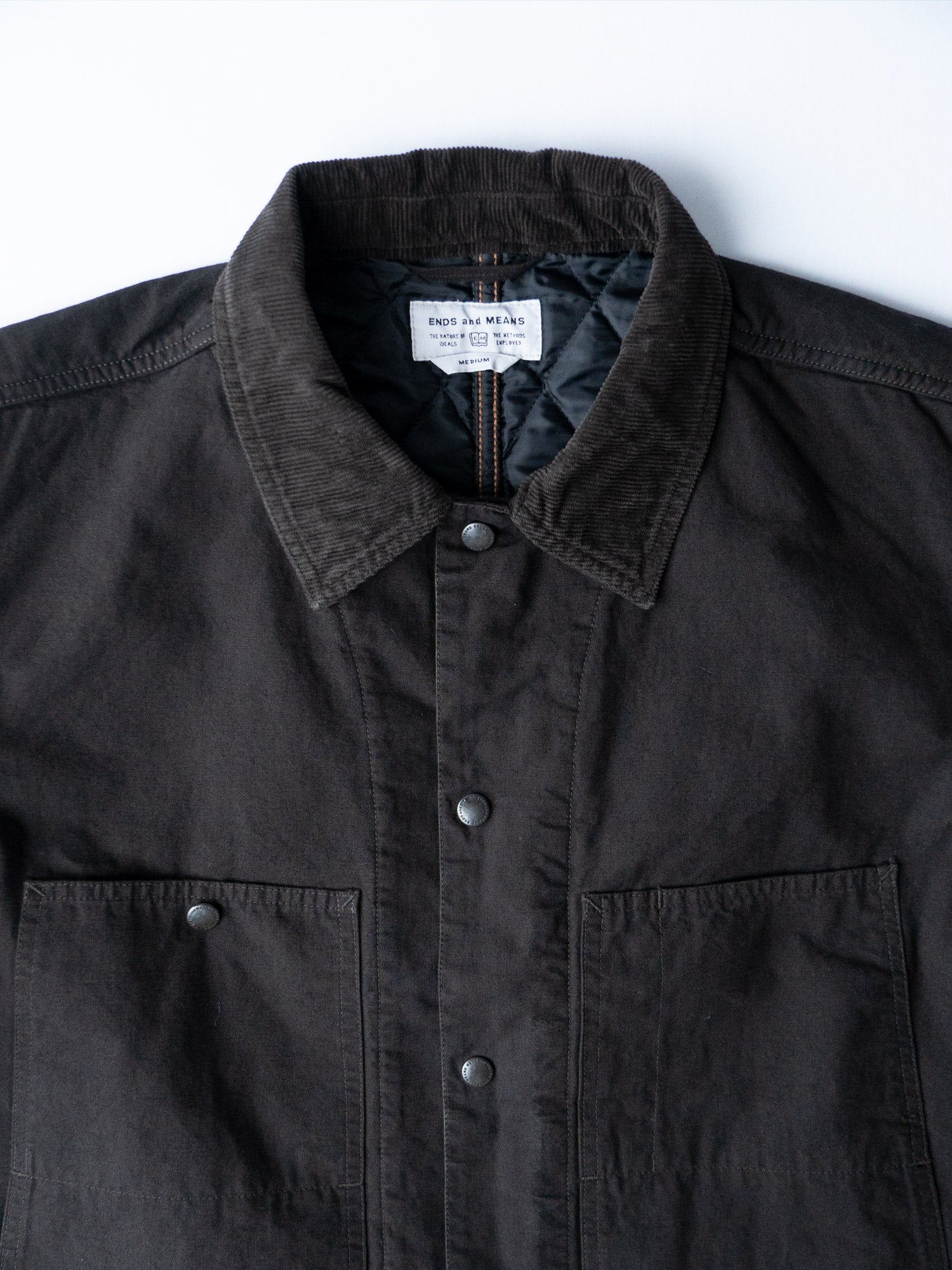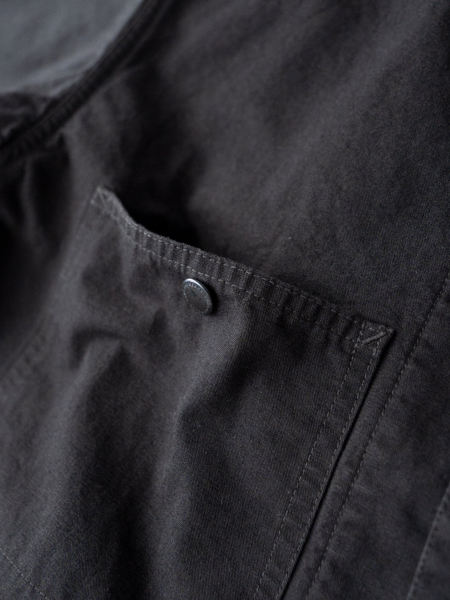 通常のキャンバス生地よりもしなやかで品がある強撚オーガニックコットン糸で折り上げたキャンバス生地を使用。襟はコーデュロイ生地。内側には程よい厚さのキルティングライニング。