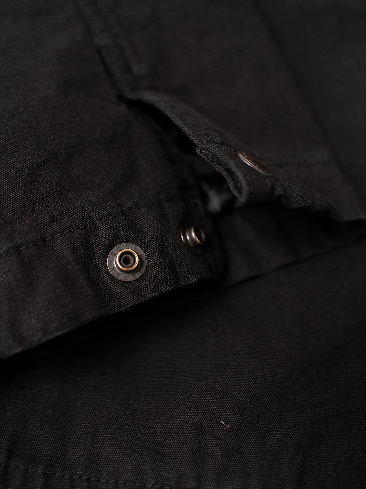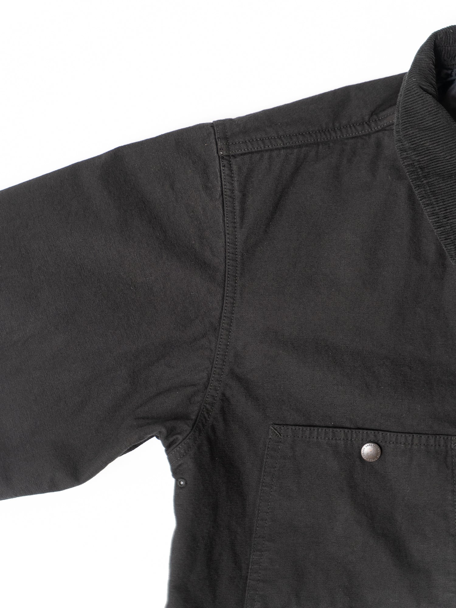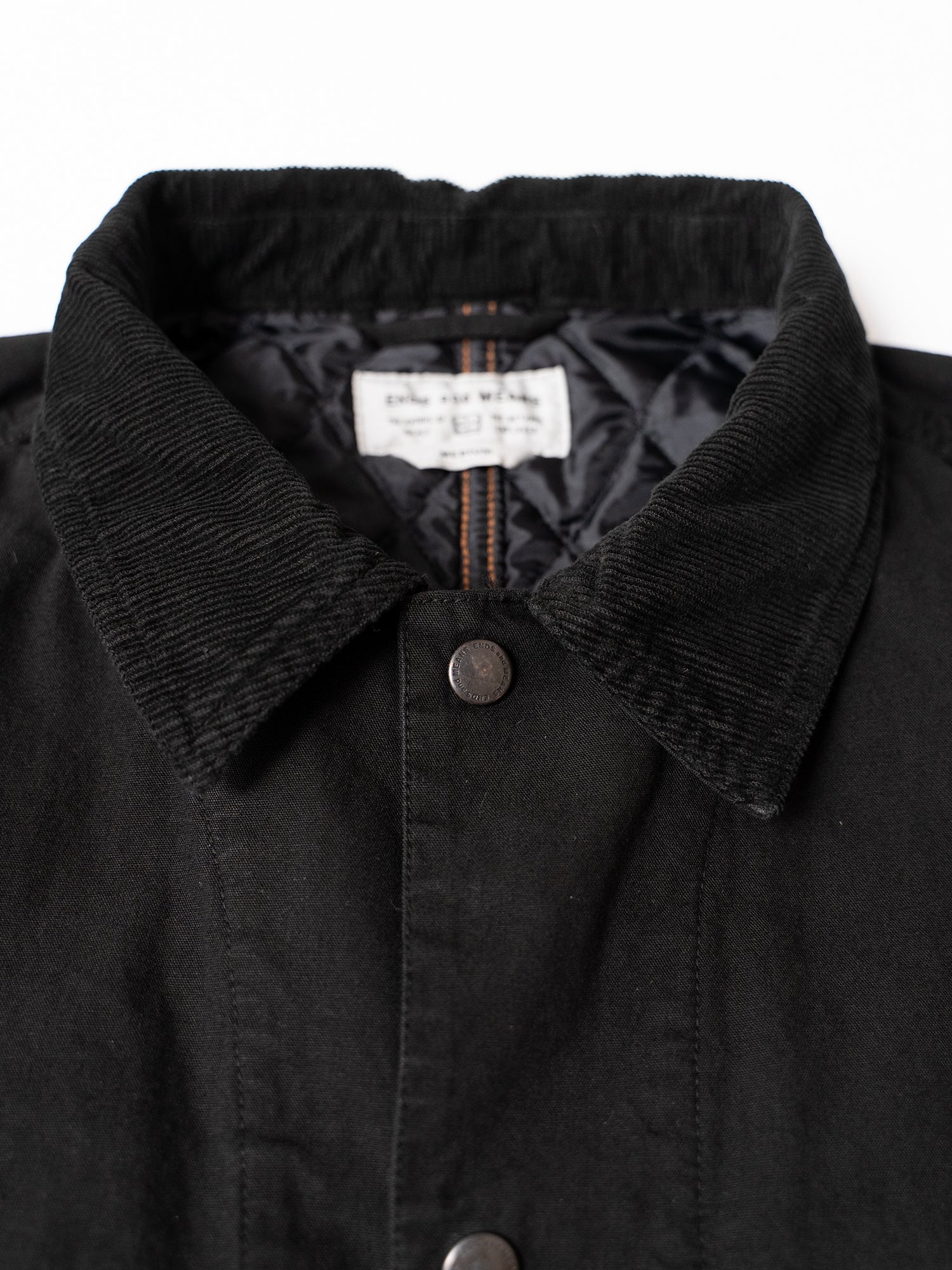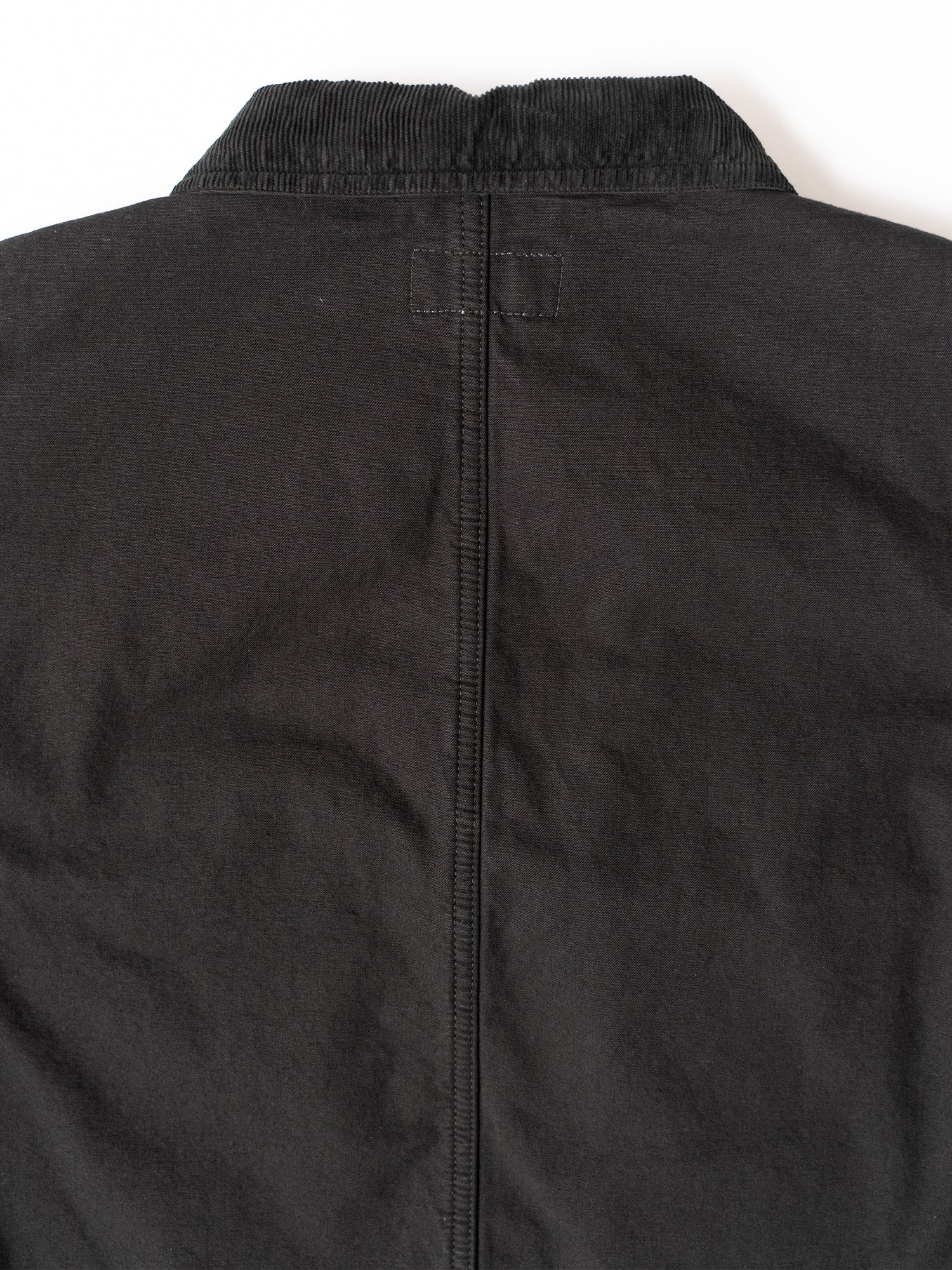 通常のキャンバス生地よりもしなやかで品がある強撚オーガニックコットン糸で折り上げたキャンバス生地を使用。襟はコーデュロイ生地。内側には程よい厚さのキルティングライニング。