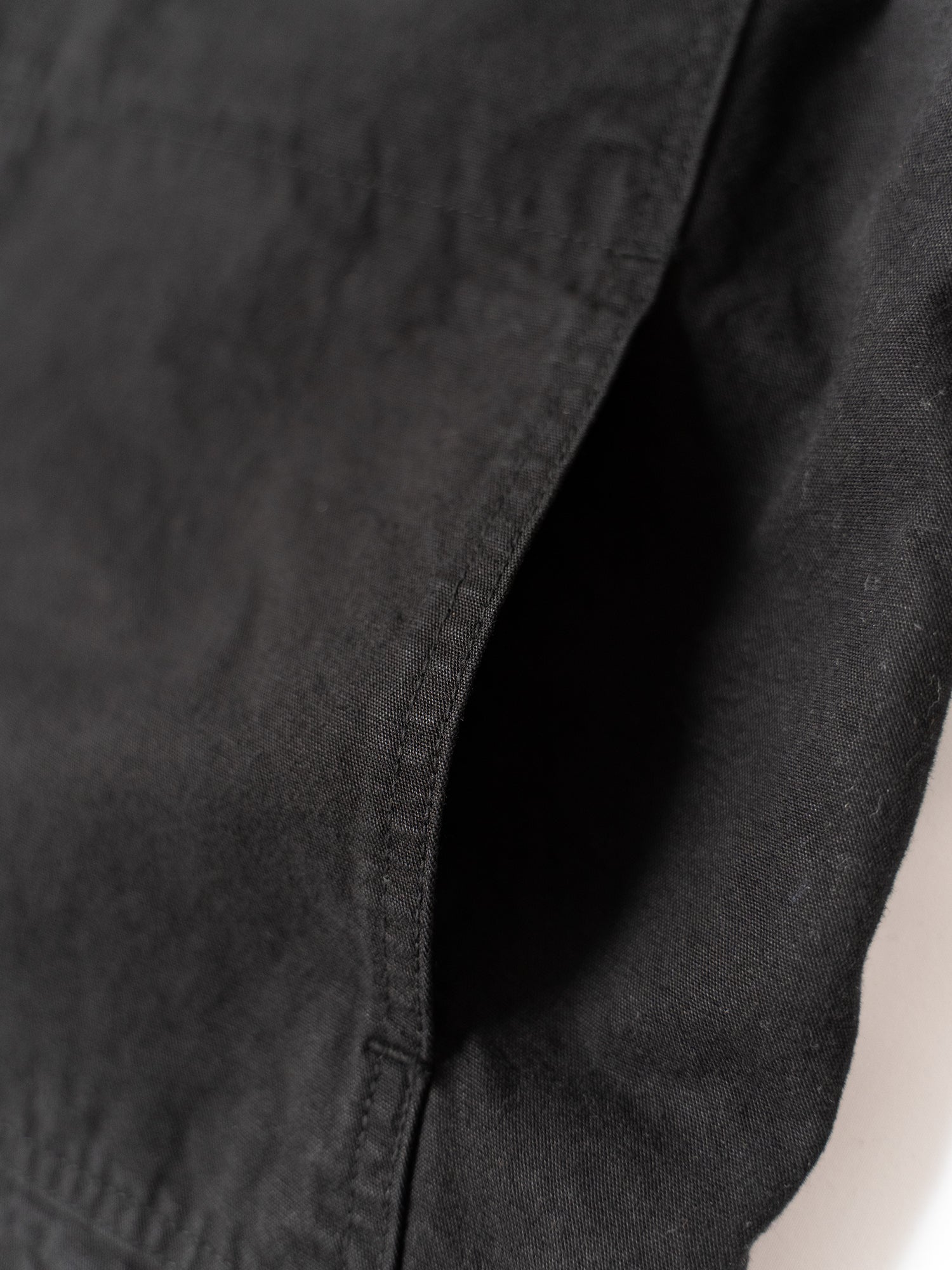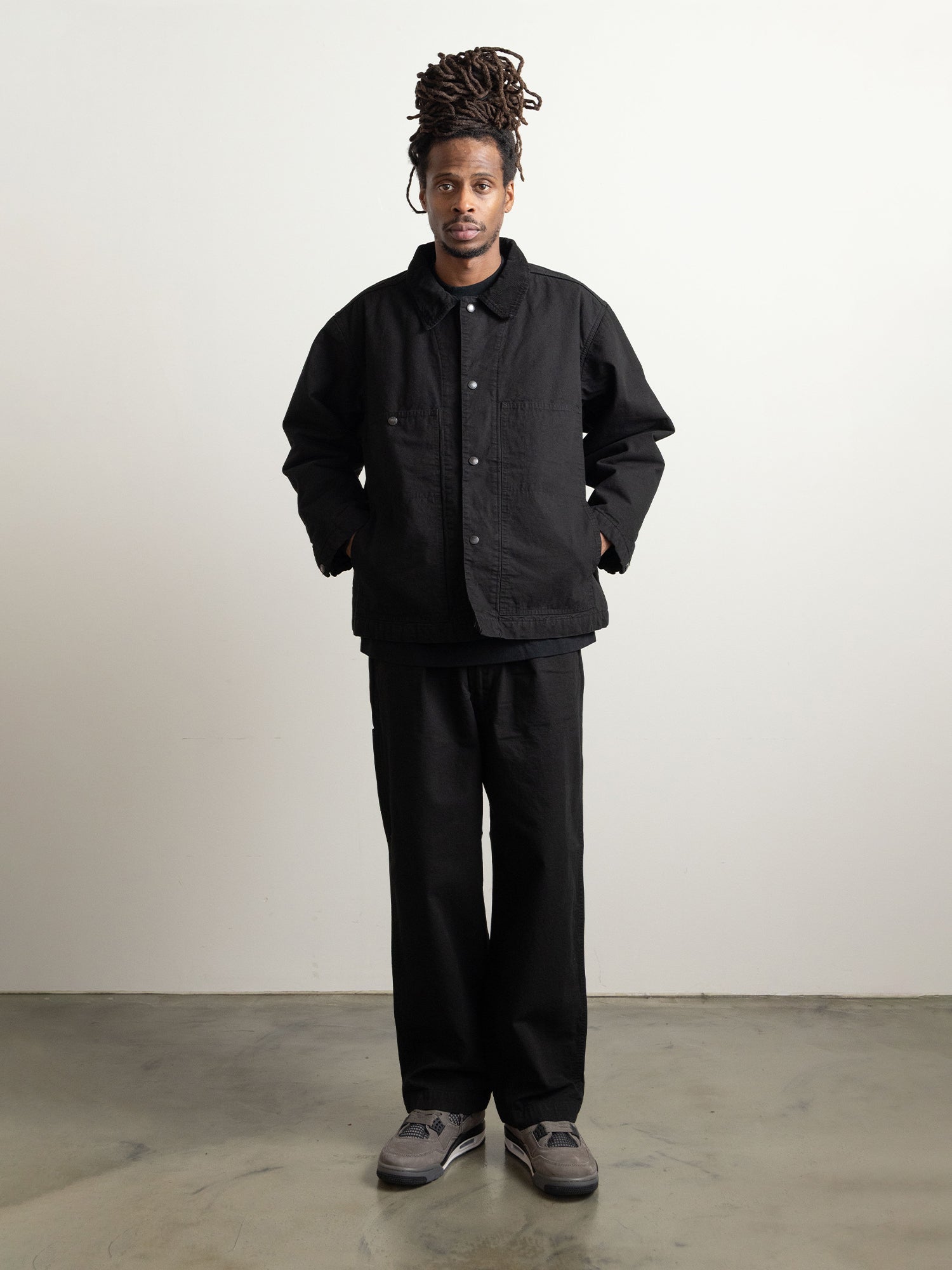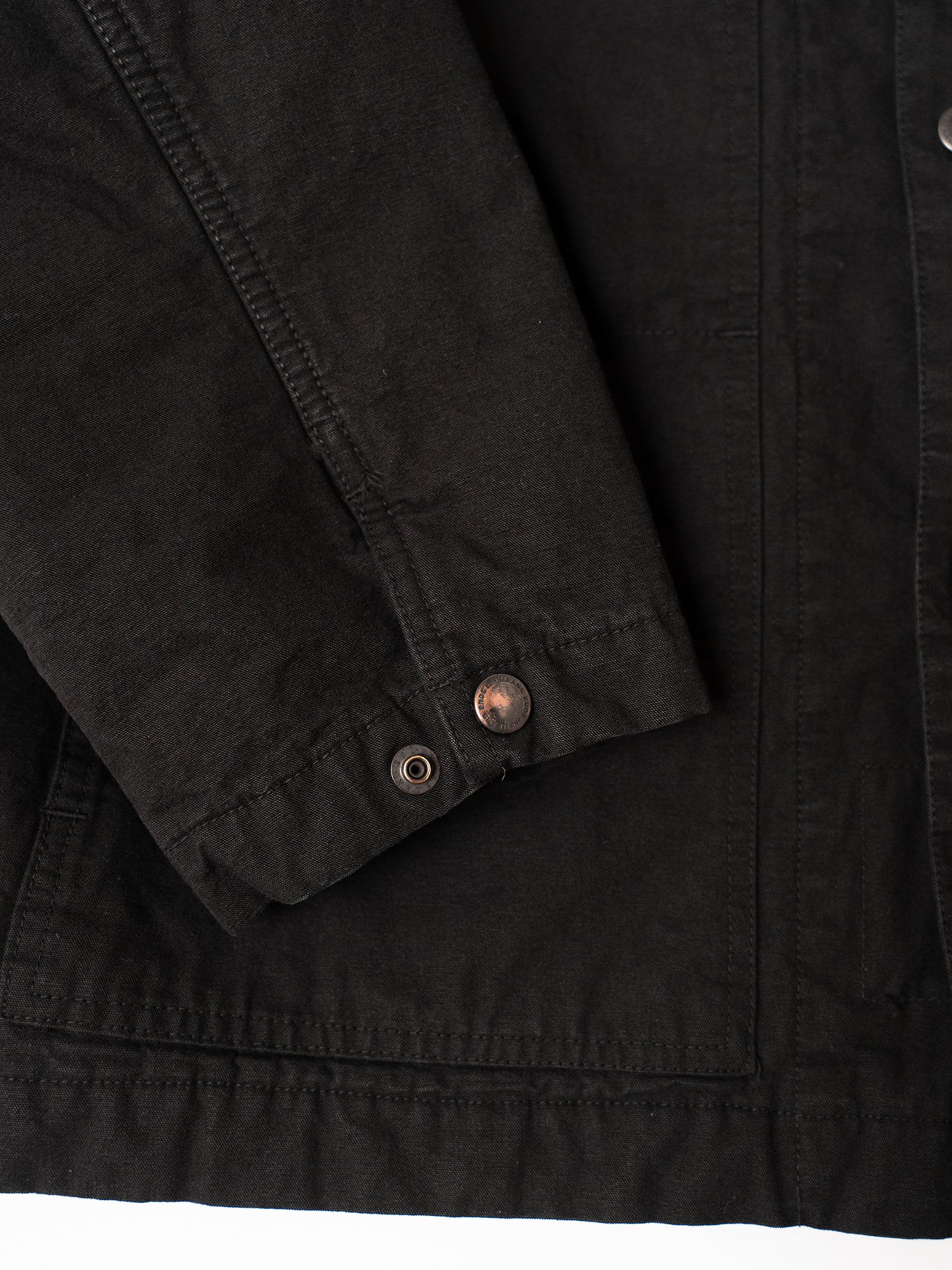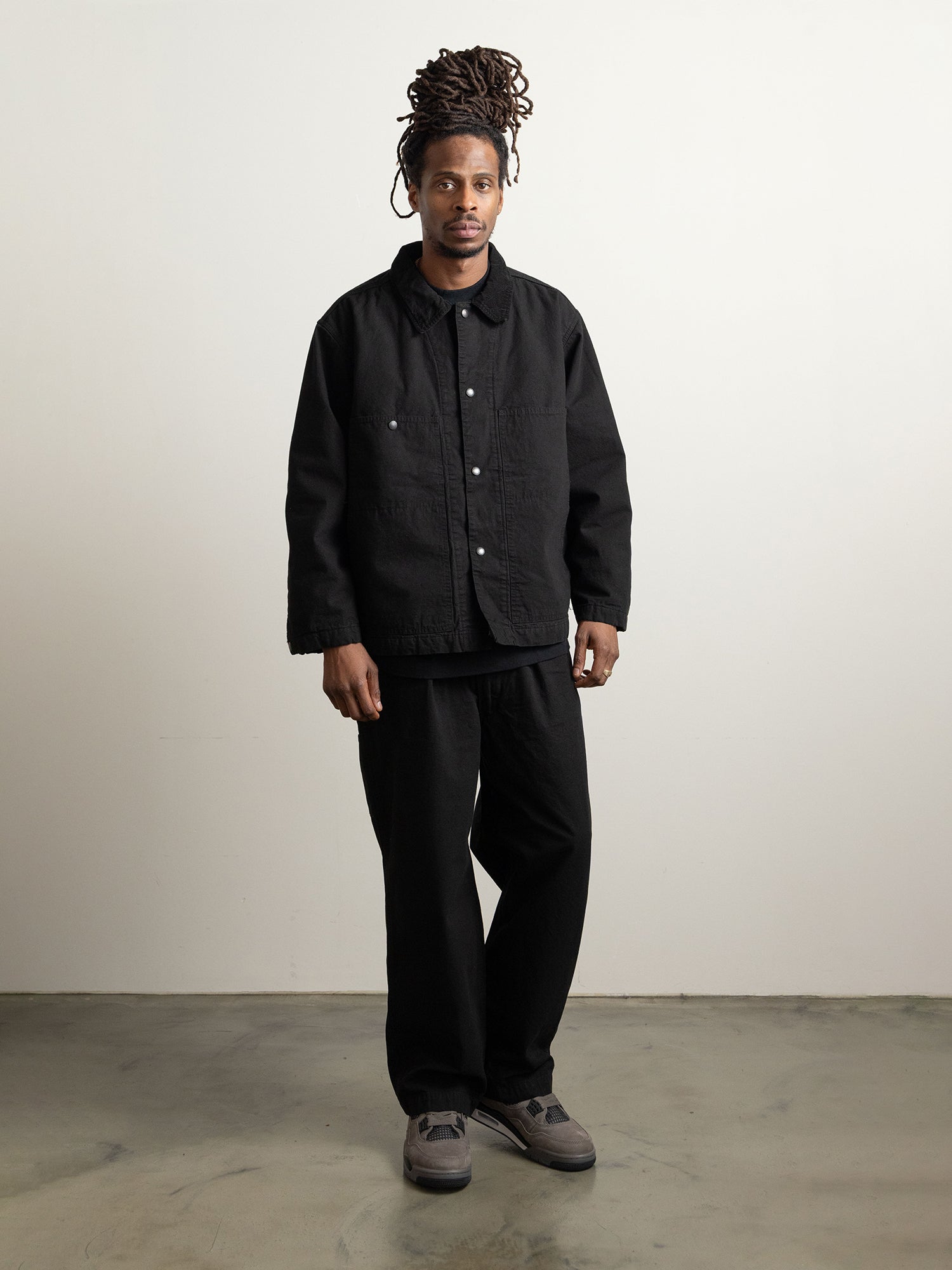 通常のキャンバス生地よりもしなやかで品がある強撚オーガニックコットン糸で折り上げたキャンバス生地を使用。襟はコーデュロイ生地。内側には程よい厚さのキルティングライニング。