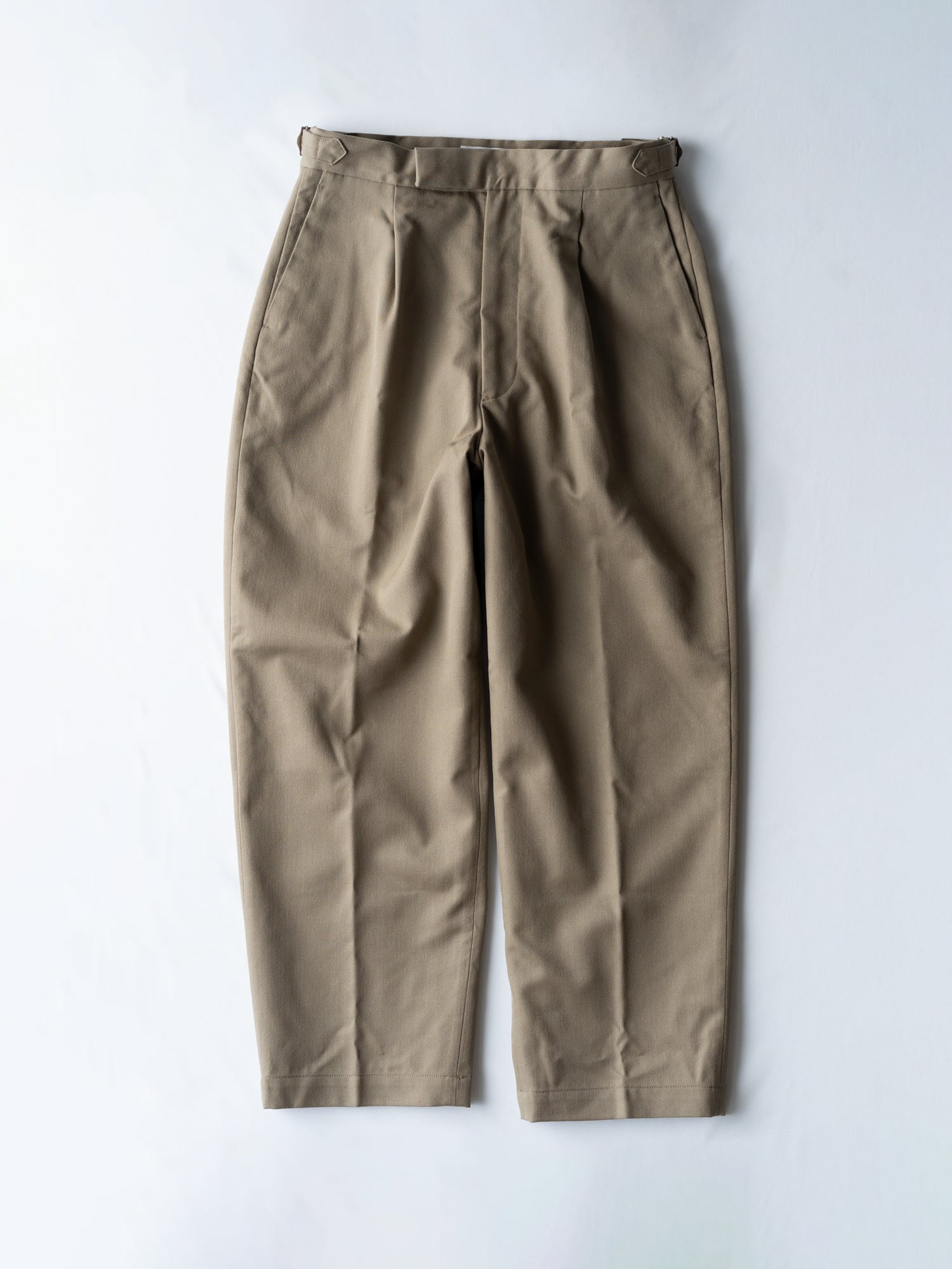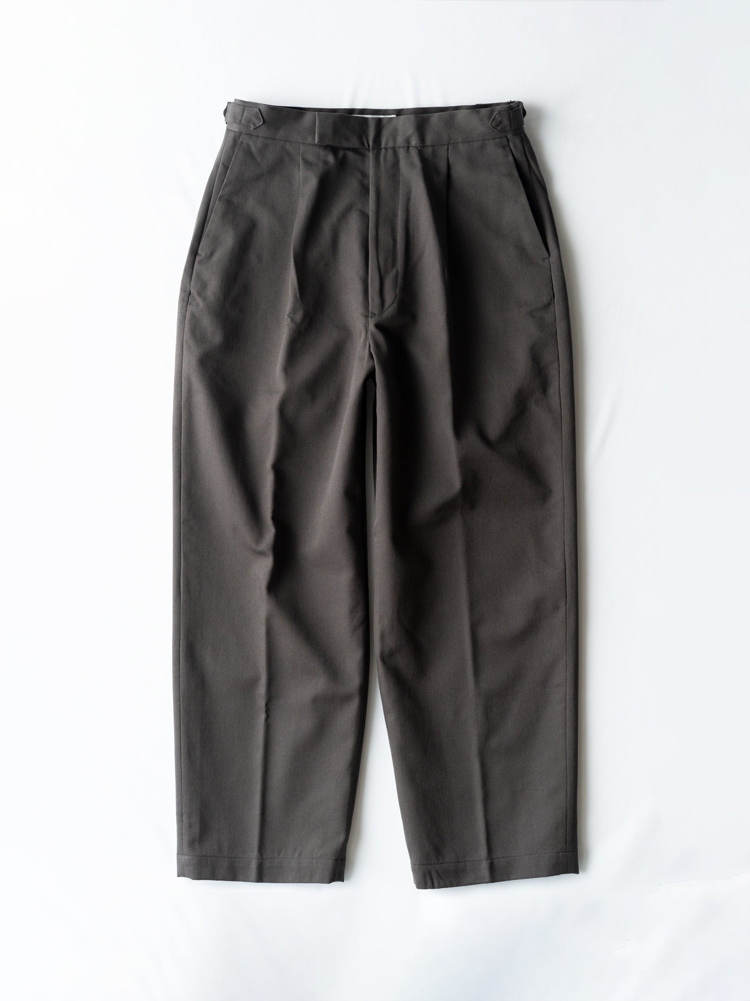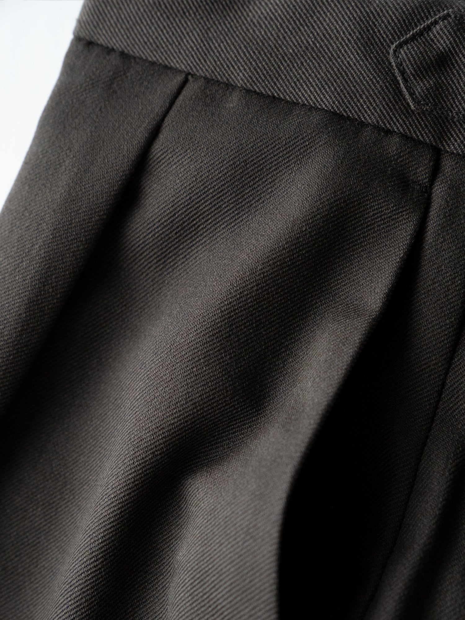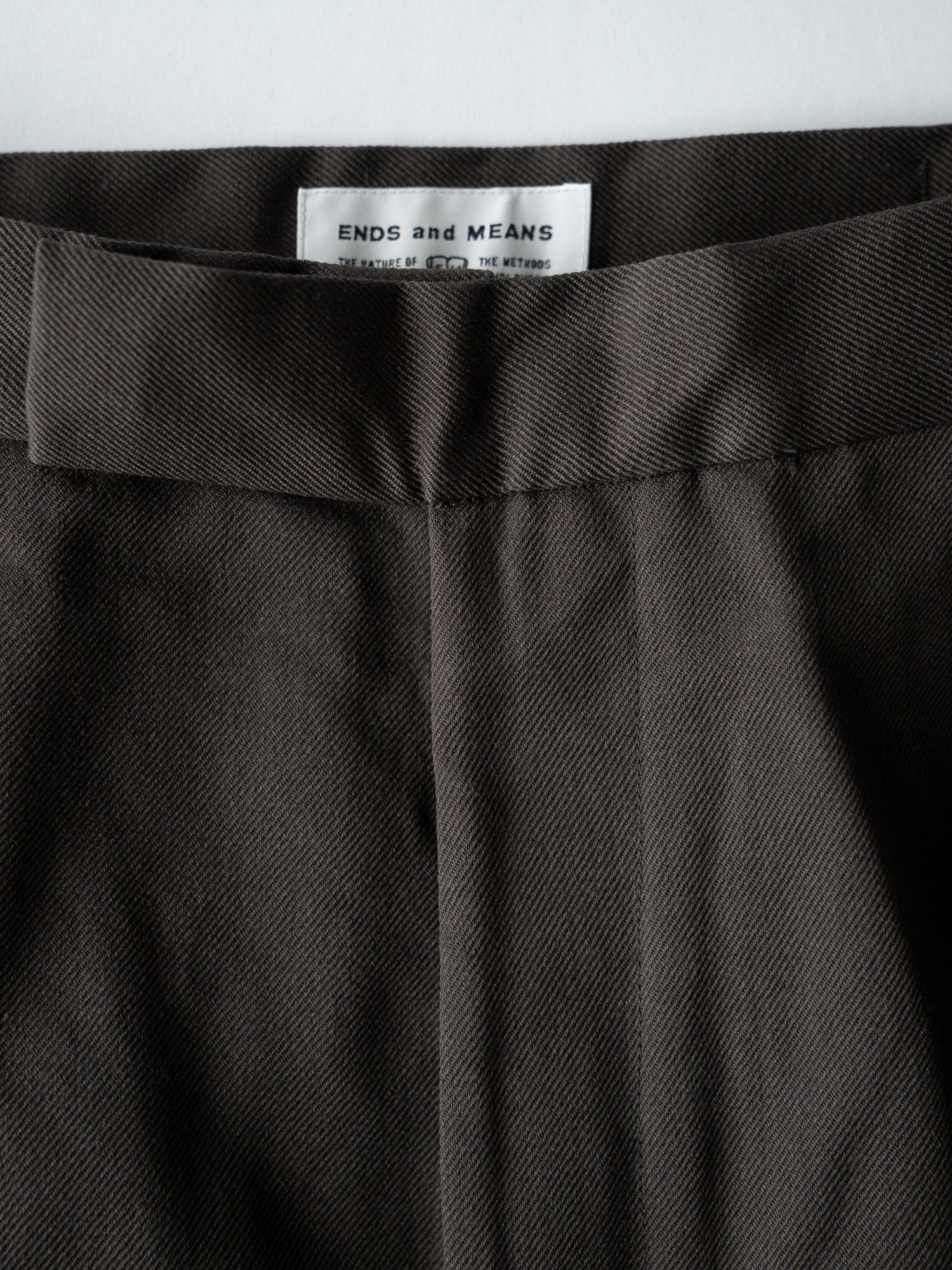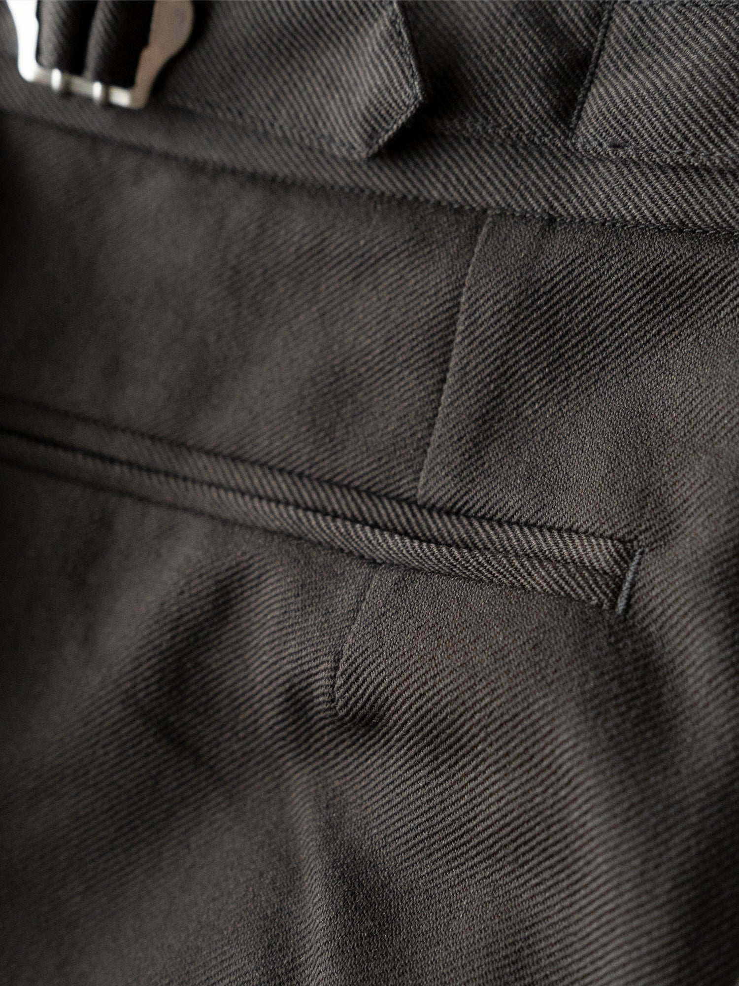今回はメリノウールを使用した綾目がきれいなサージを使用し、上品かつ深みのあるベージュ、ダークブラウン、ブラックの3色展開。コシのあるしっかりした生地で、ワタリと腰回りに余裕があり、ゆったりとしたシルエット。※未洗いですので、洗い後はコシが柔らかくなり若干縮みも生じます。