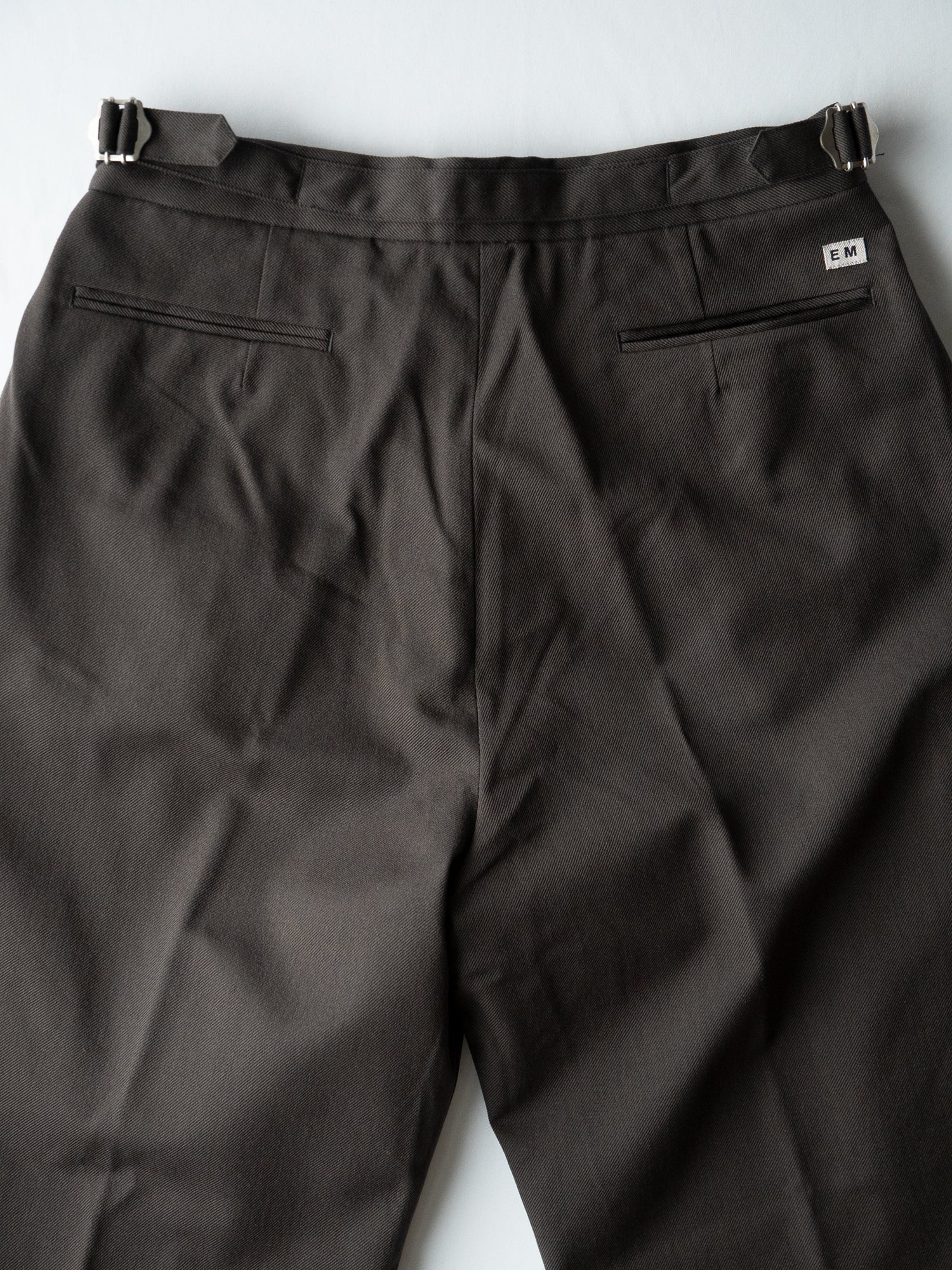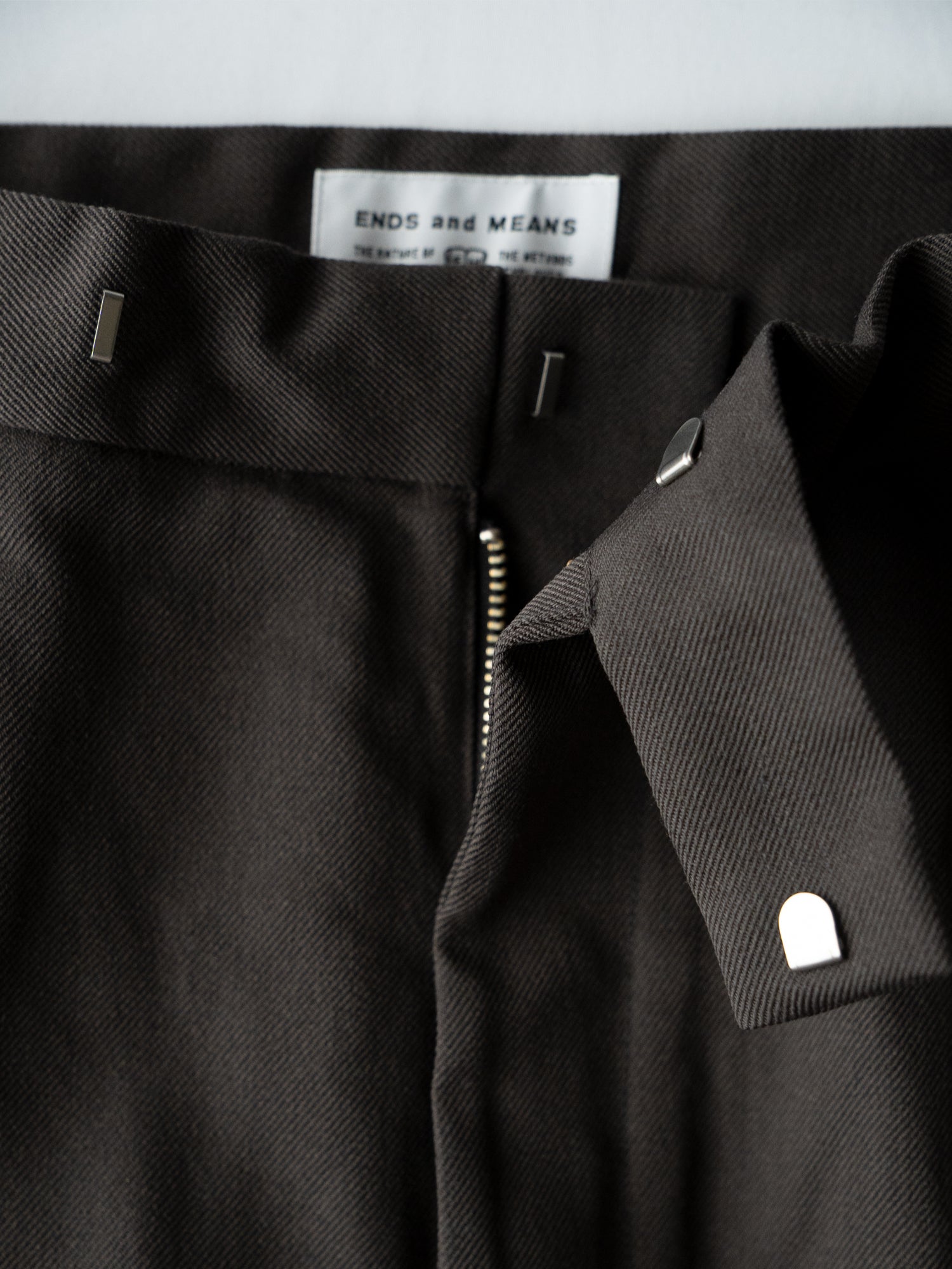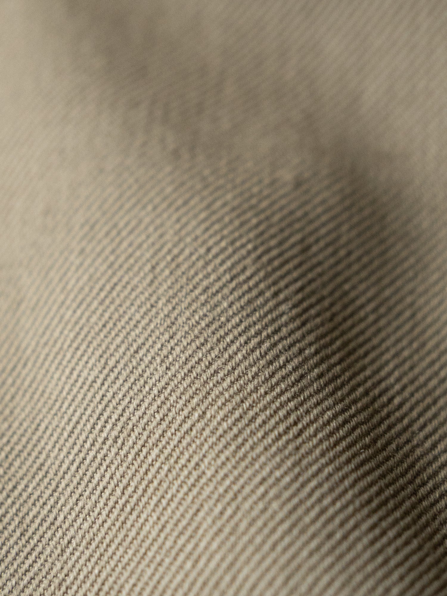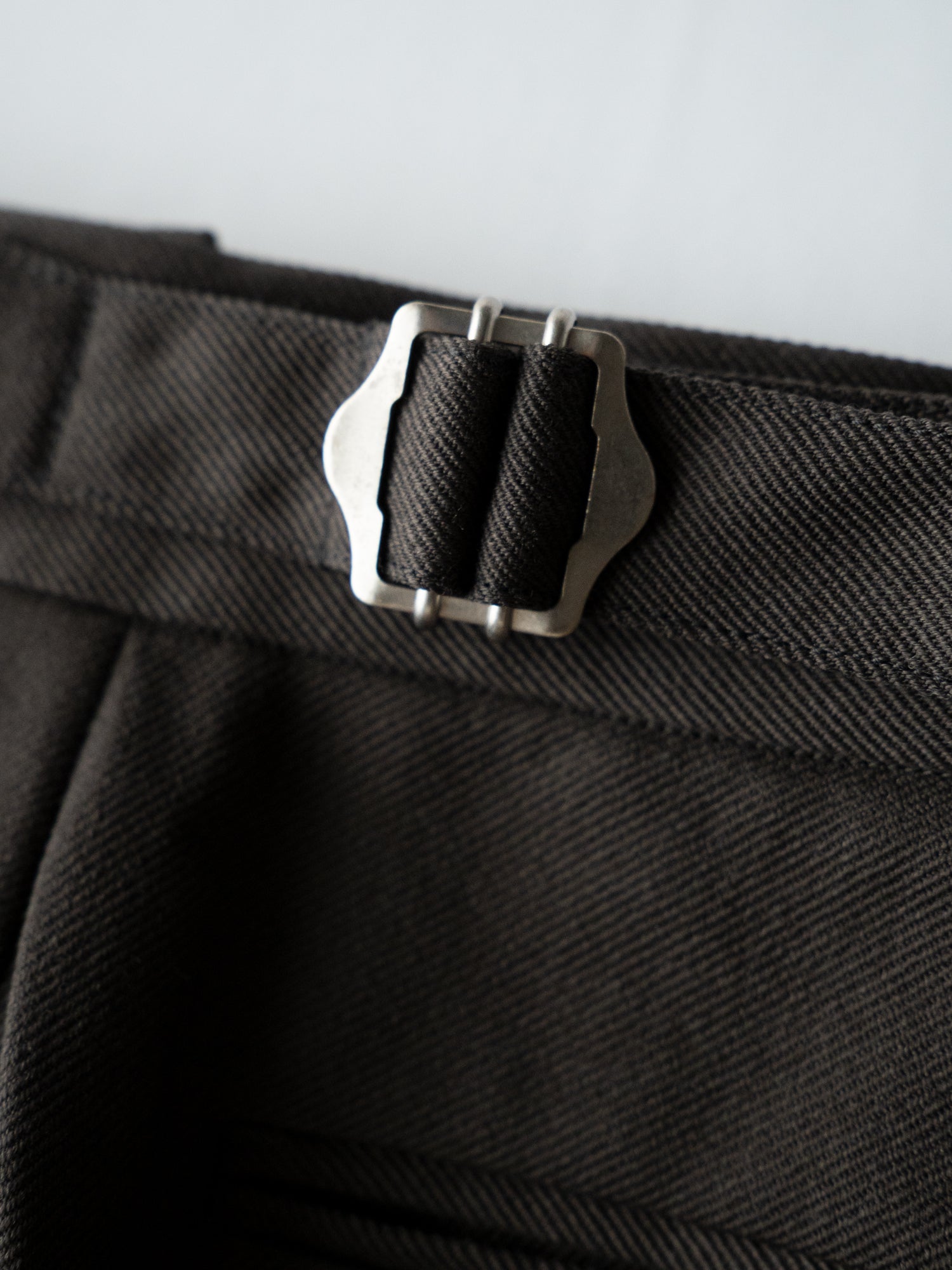 今回はメリノウールを使用した綾目がきれいなサージを使用し、上品かつ深みのあるベージュ、ダークブラウン、ブラックの3色展開。コシのあるしっかりした生地で、ワタリと腰回りに余裕があり、ゆったりとしたシルエット。※未洗いですので、洗い後はコシが柔らかくなり若干縮みも生じます。