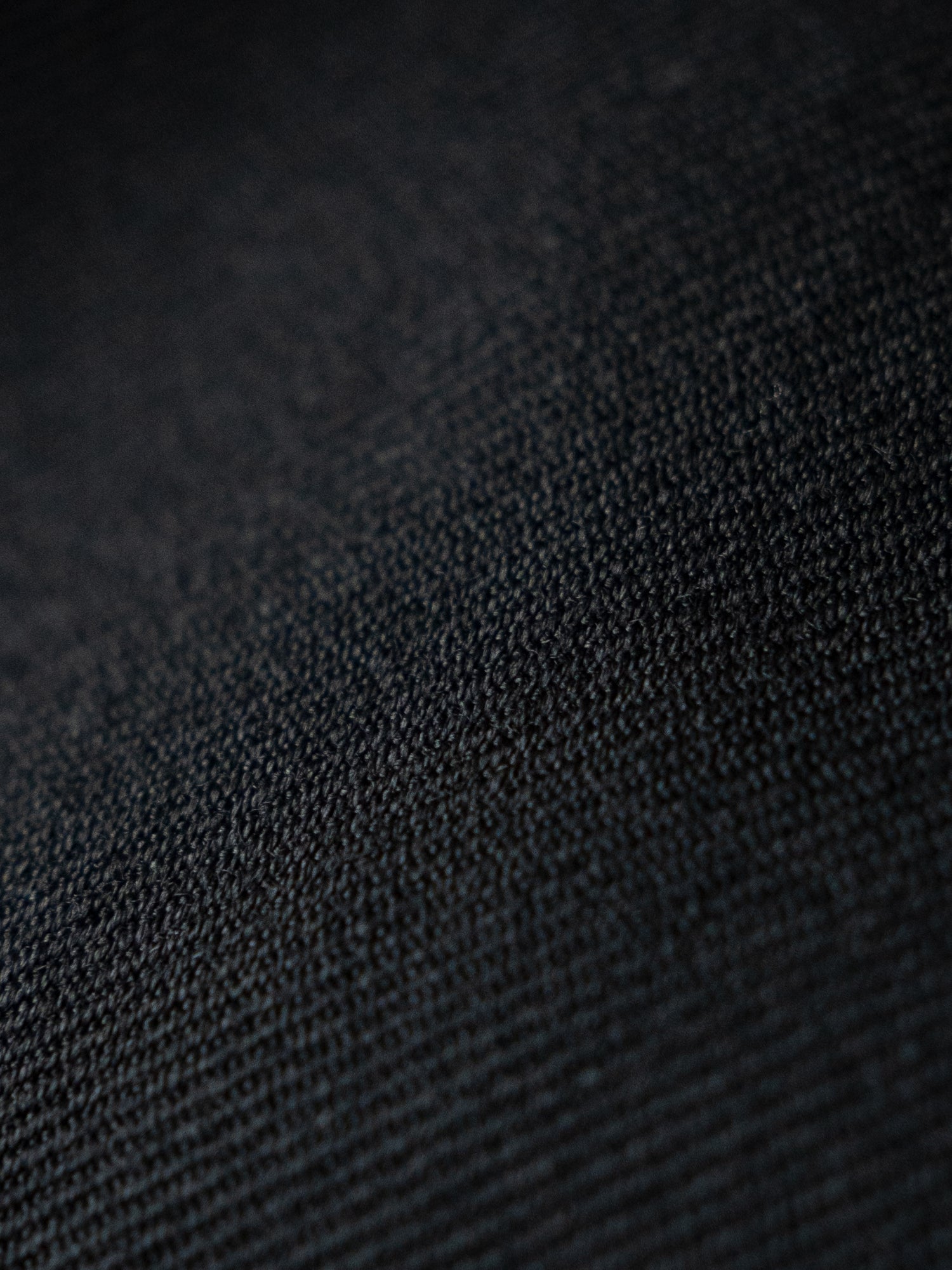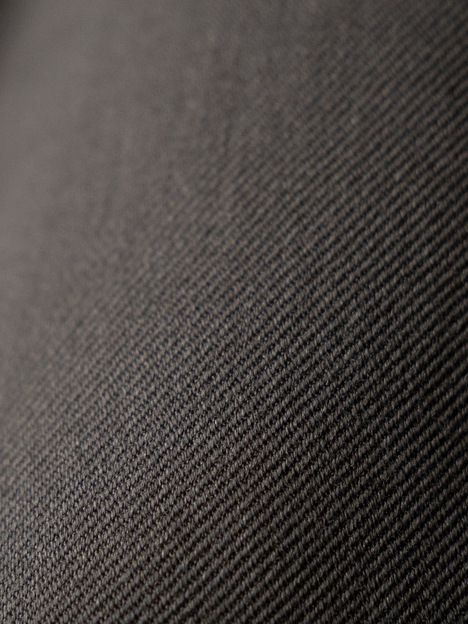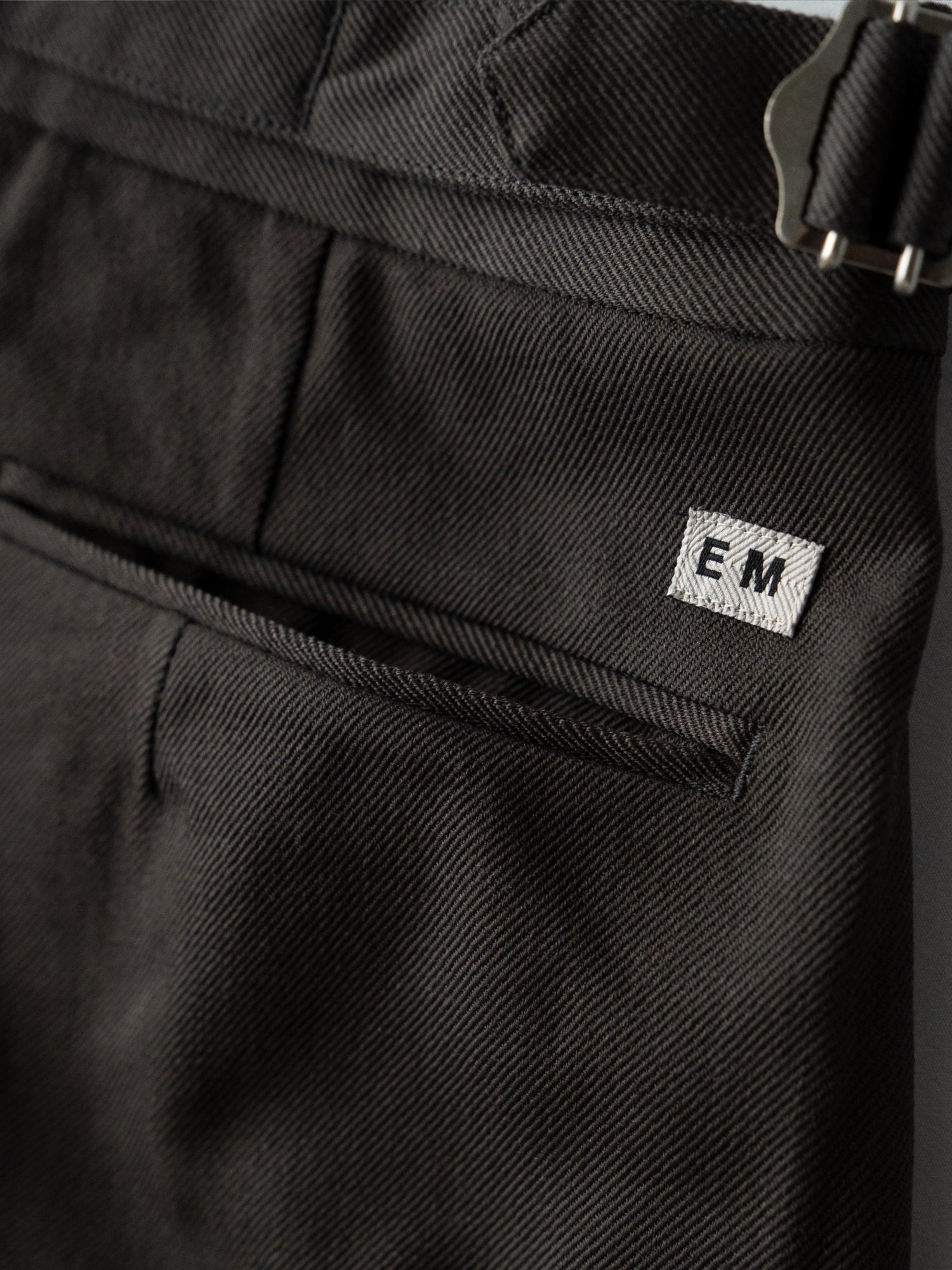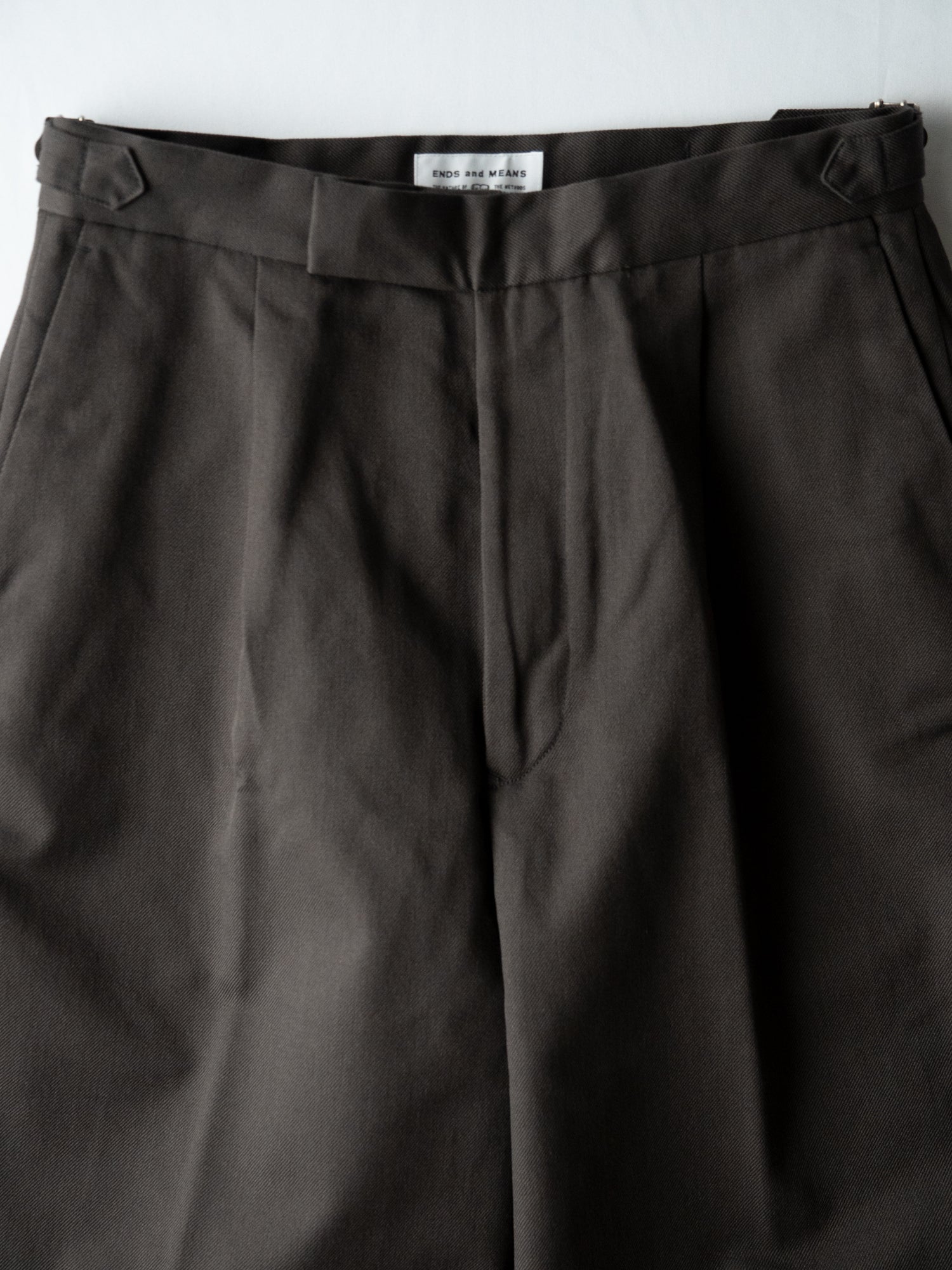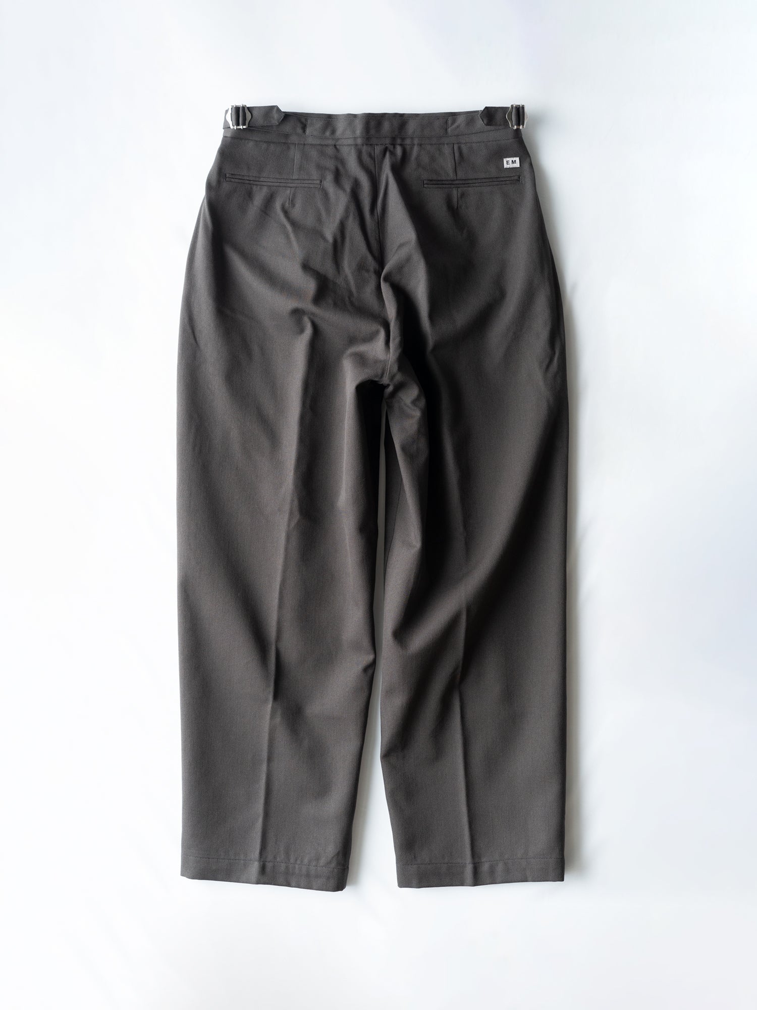 今回はメリノウールを使用した綾目がきれいなサージを使用し、上品かつ深みのあるベージュ、ダークブラウン、ブラックの3色展開。コシのあるしっかりした生地で、ワタリと腰回りに余裕があり、ゆったりとしたシルエット。※未洗いですので、洗い後はコシが柔らかくなり若干縮みも生じます。