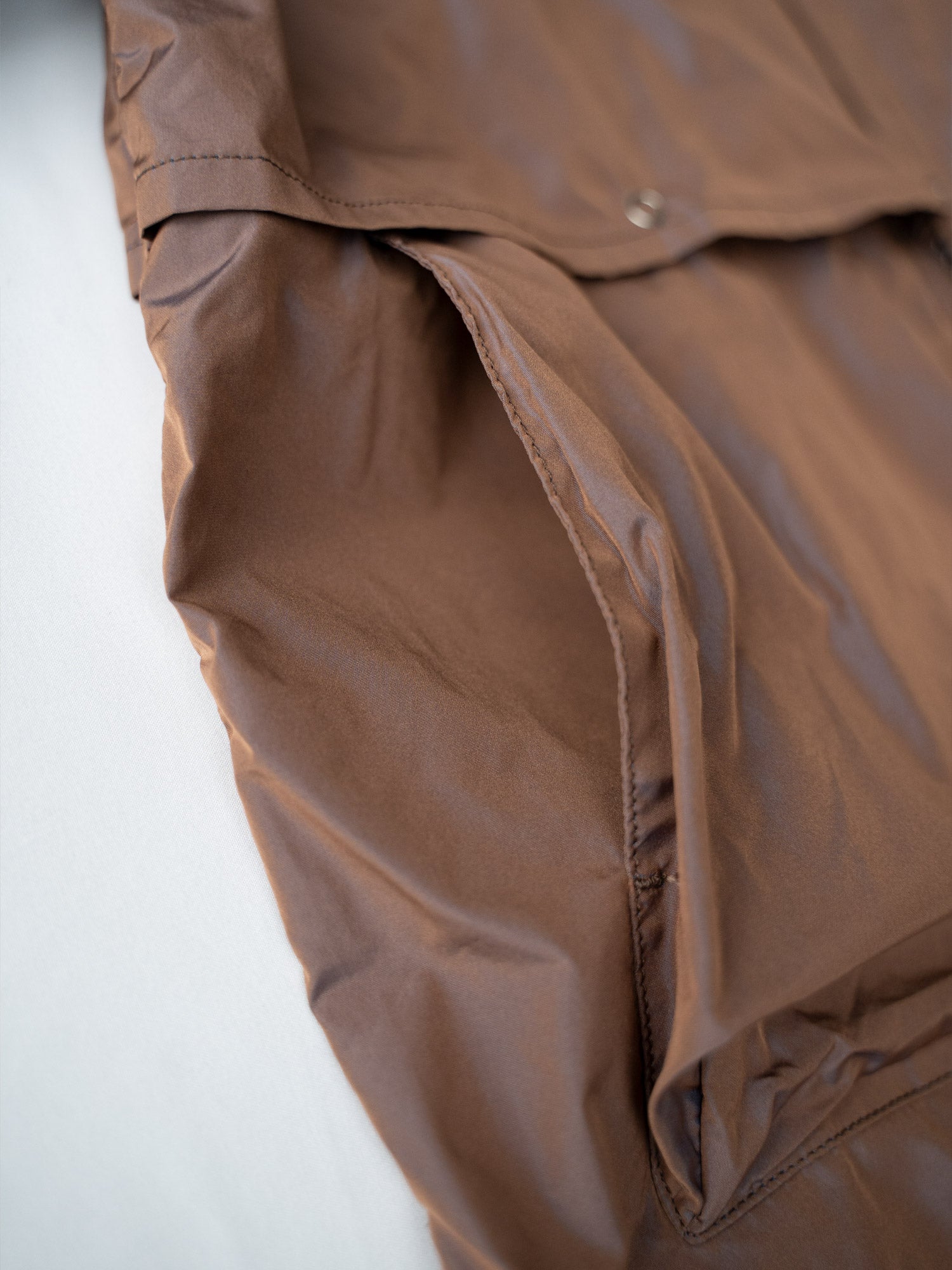 衣服内の湿気や籠もった熱を調整できるよう背面も同様にヨーク裏がベンチレーション仕様。サイドがハンドウォーマーになっている大きめの立体ポケットを完備し、Tシャツの上から軽く羽織れ、畳むと小さくなるので定番のライトシャツジャケットと同様に旅行時や日常使いにとても便利なアイテム。