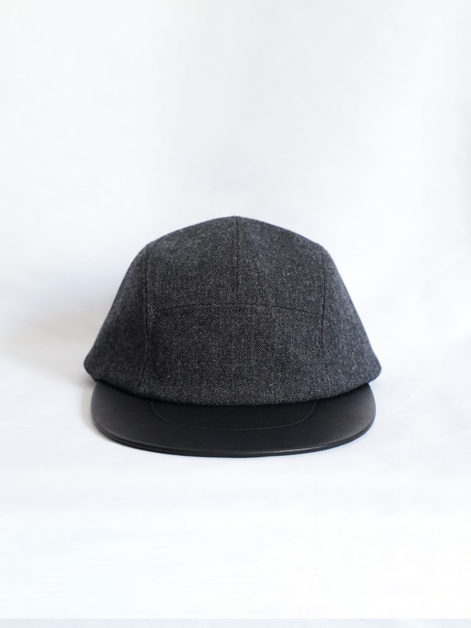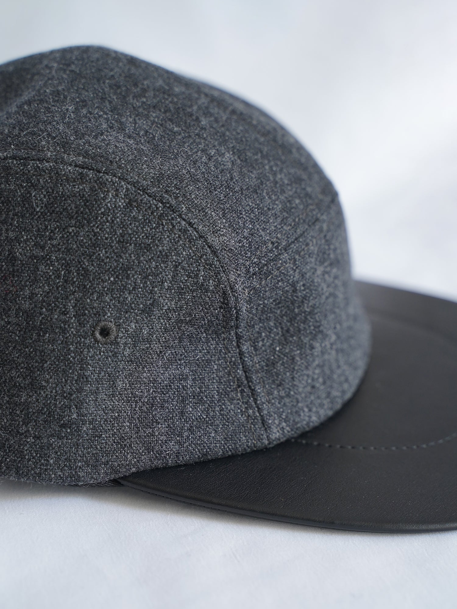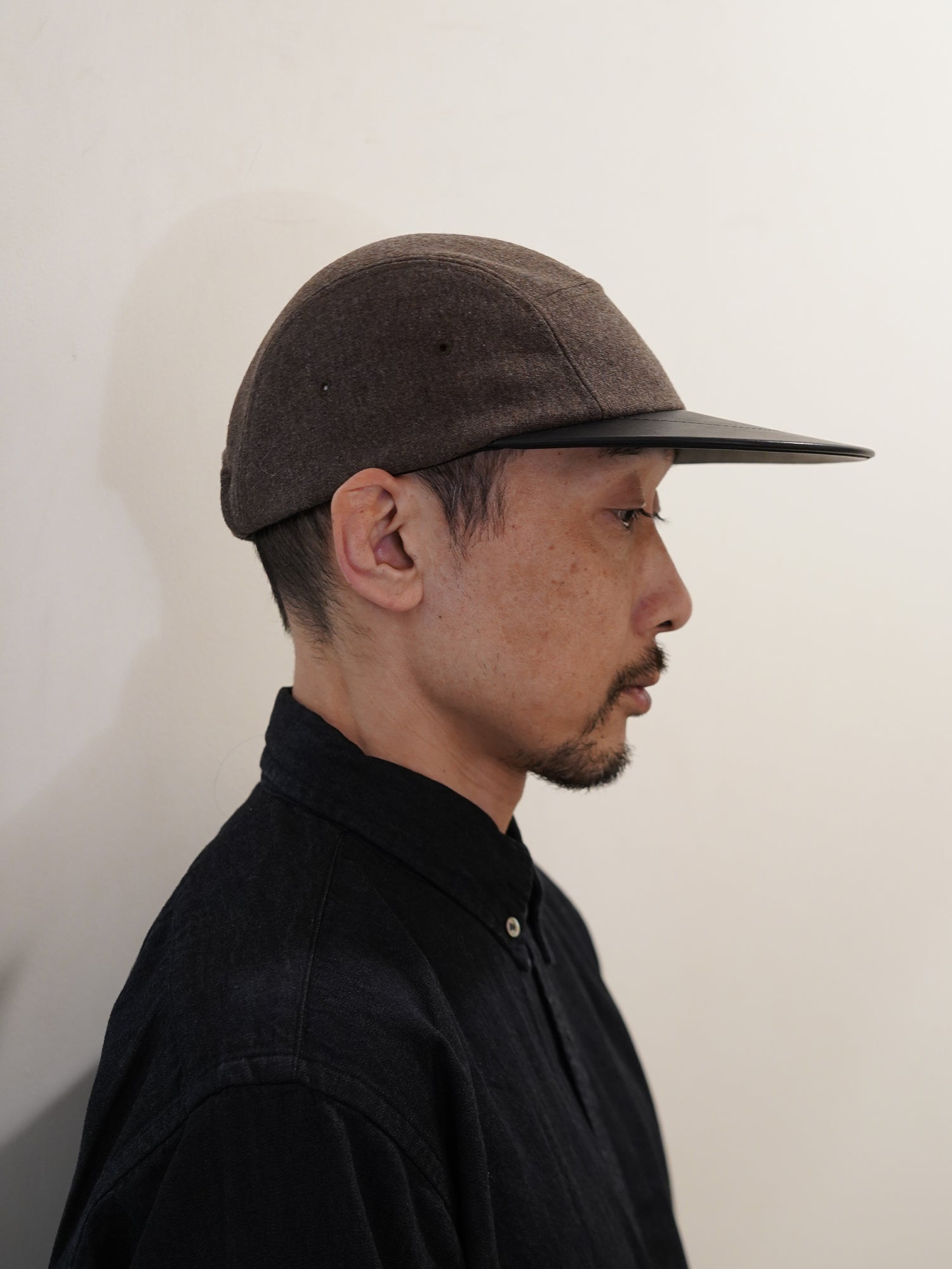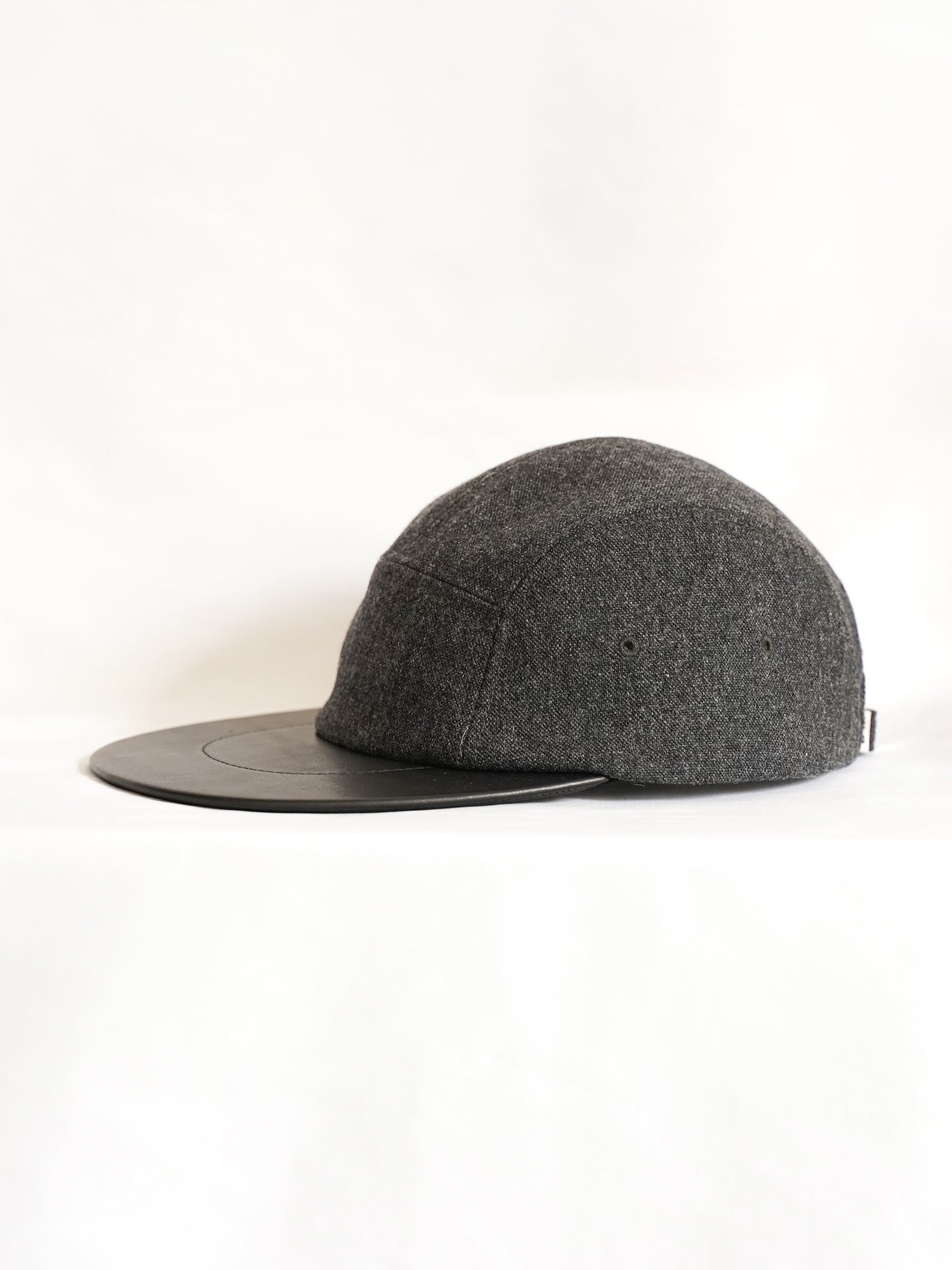 防水レザーを使用した本革バイザーのCamp Cap。クラウン部分はざっくりとした質感のウールナイロン生地を使用。
