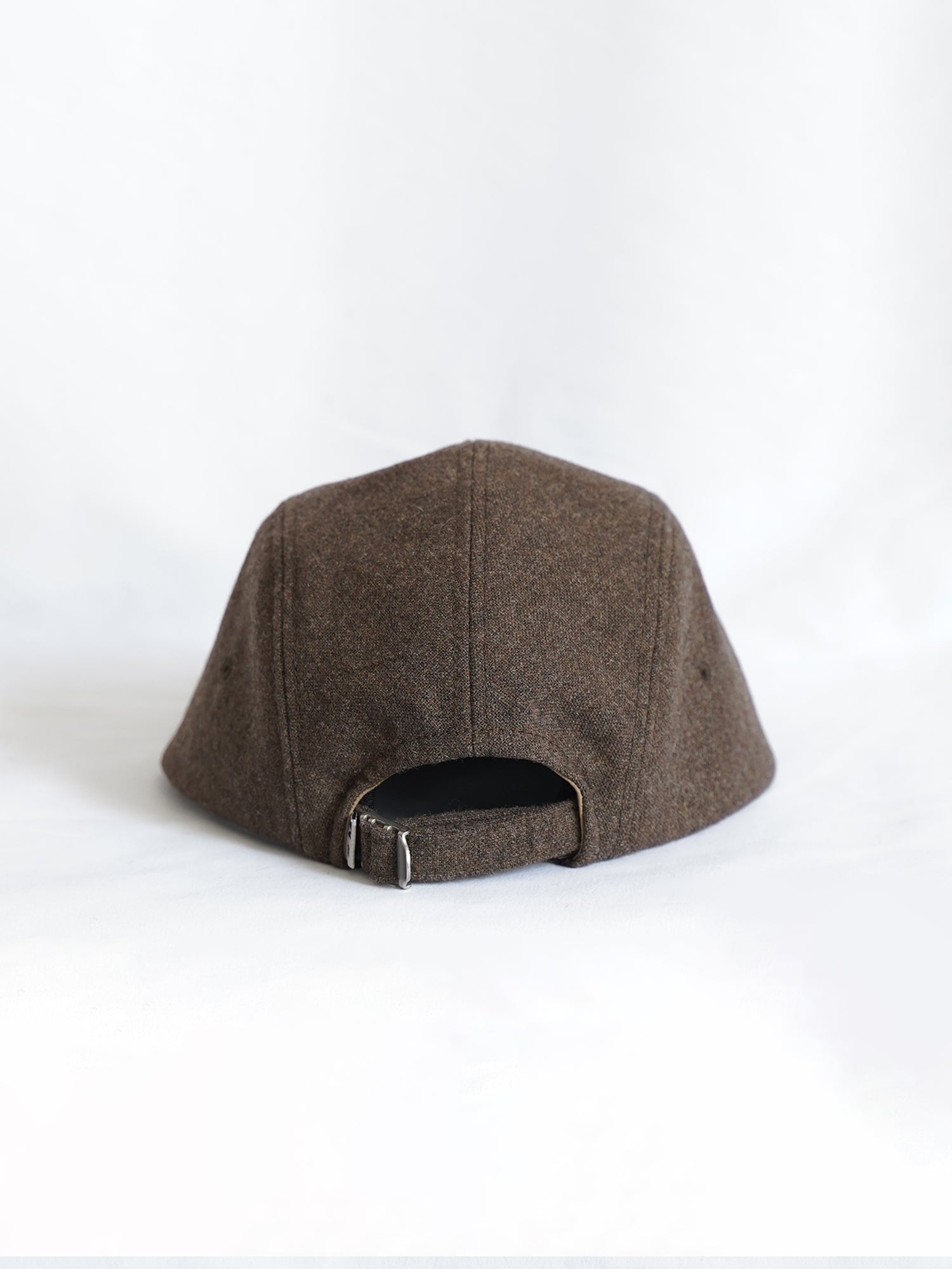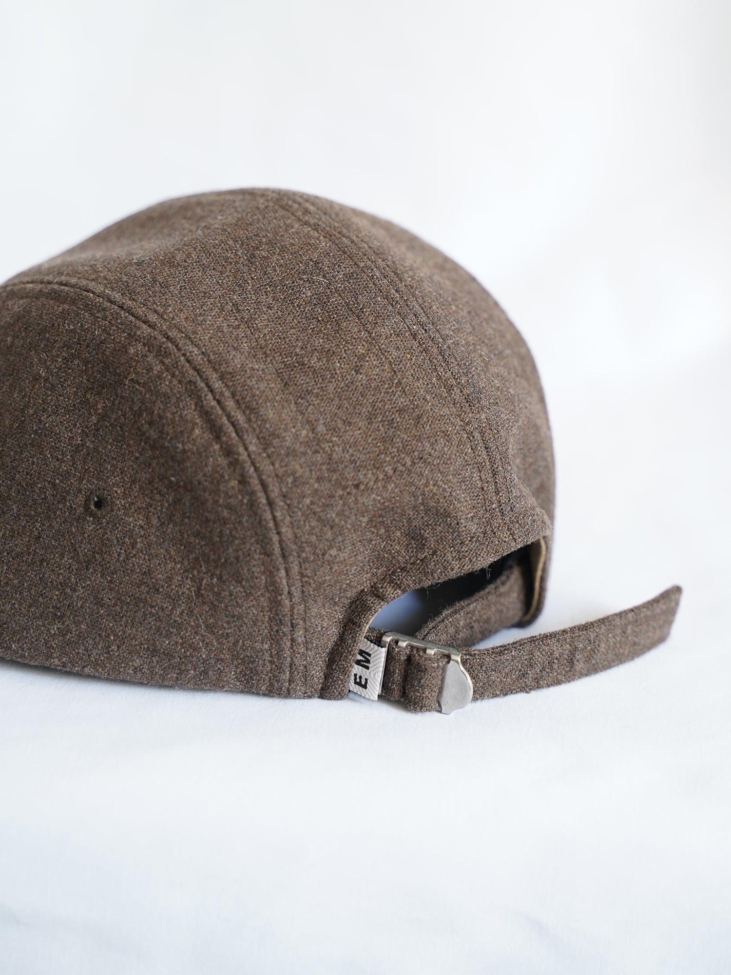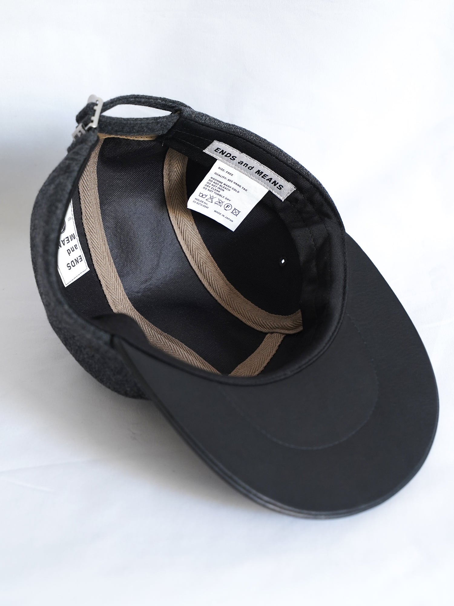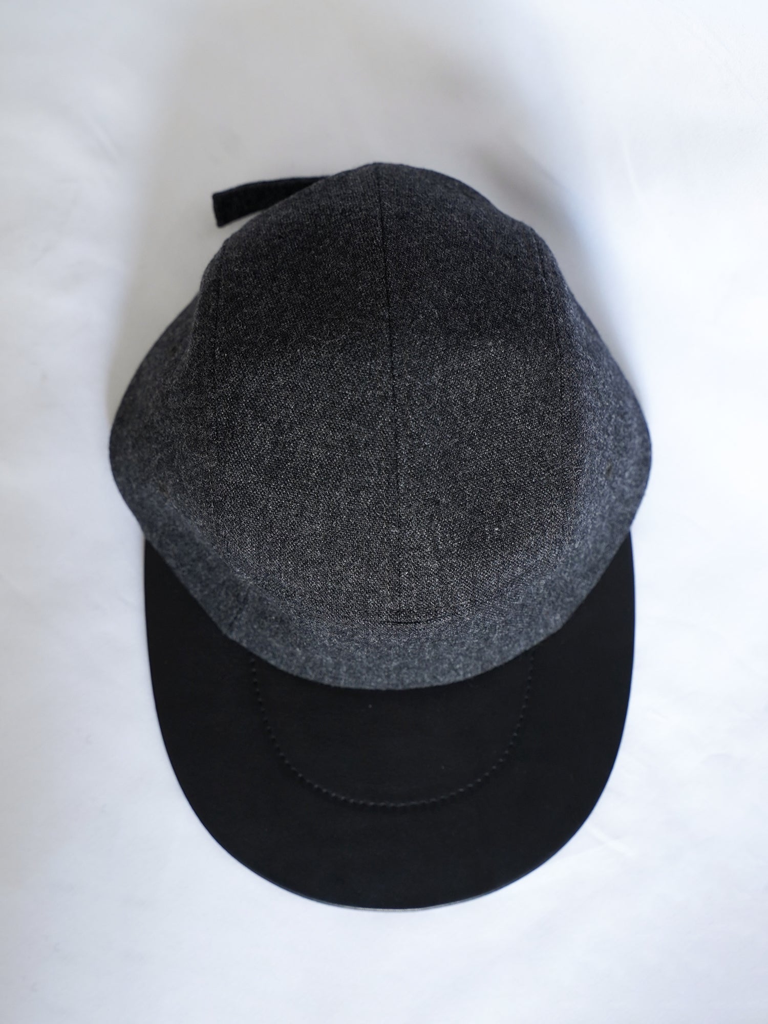 防水レザーを使用した本革バイザーのCamp Cap。クラウン部分はざっくりとした質感のウールナイロン生地を使用。