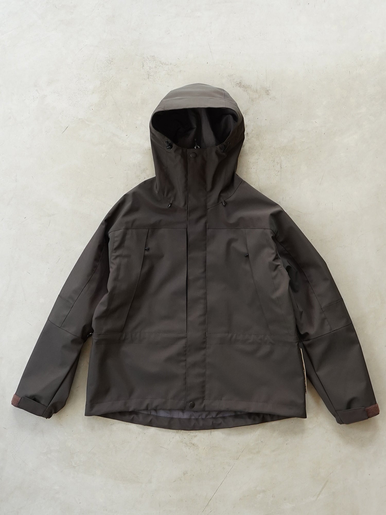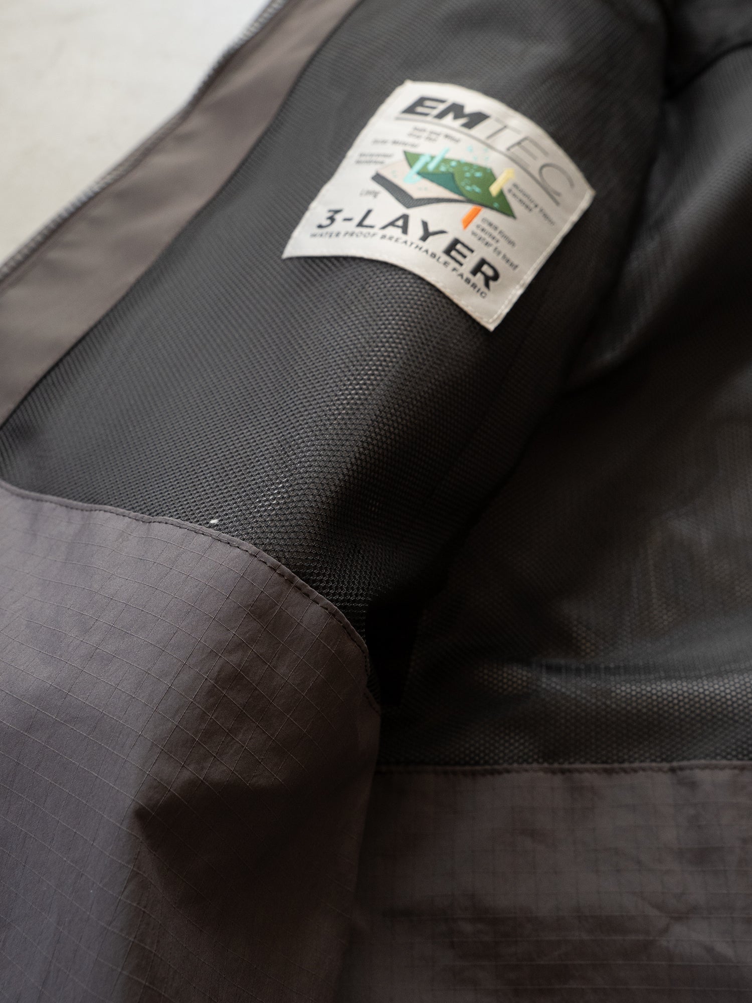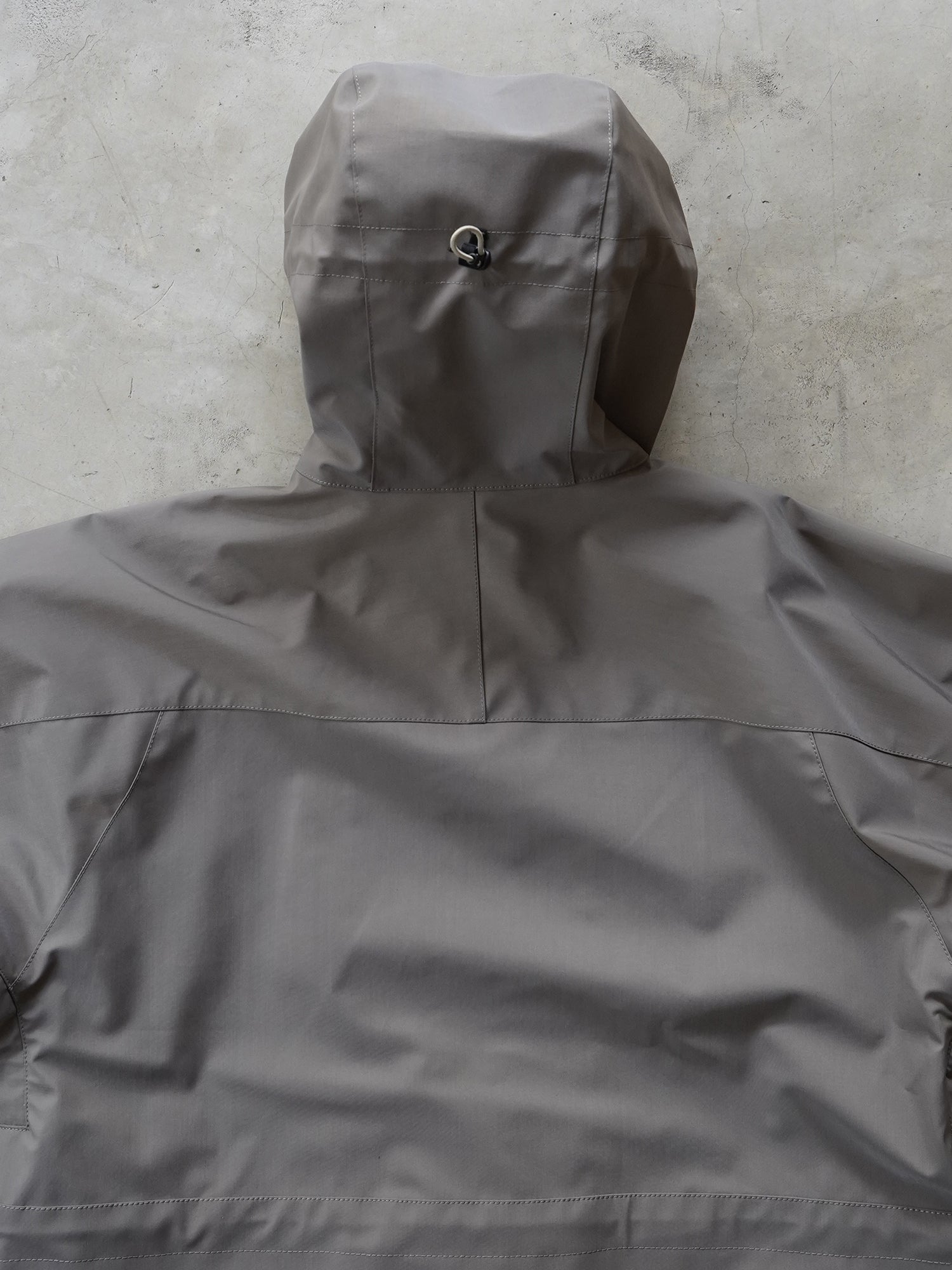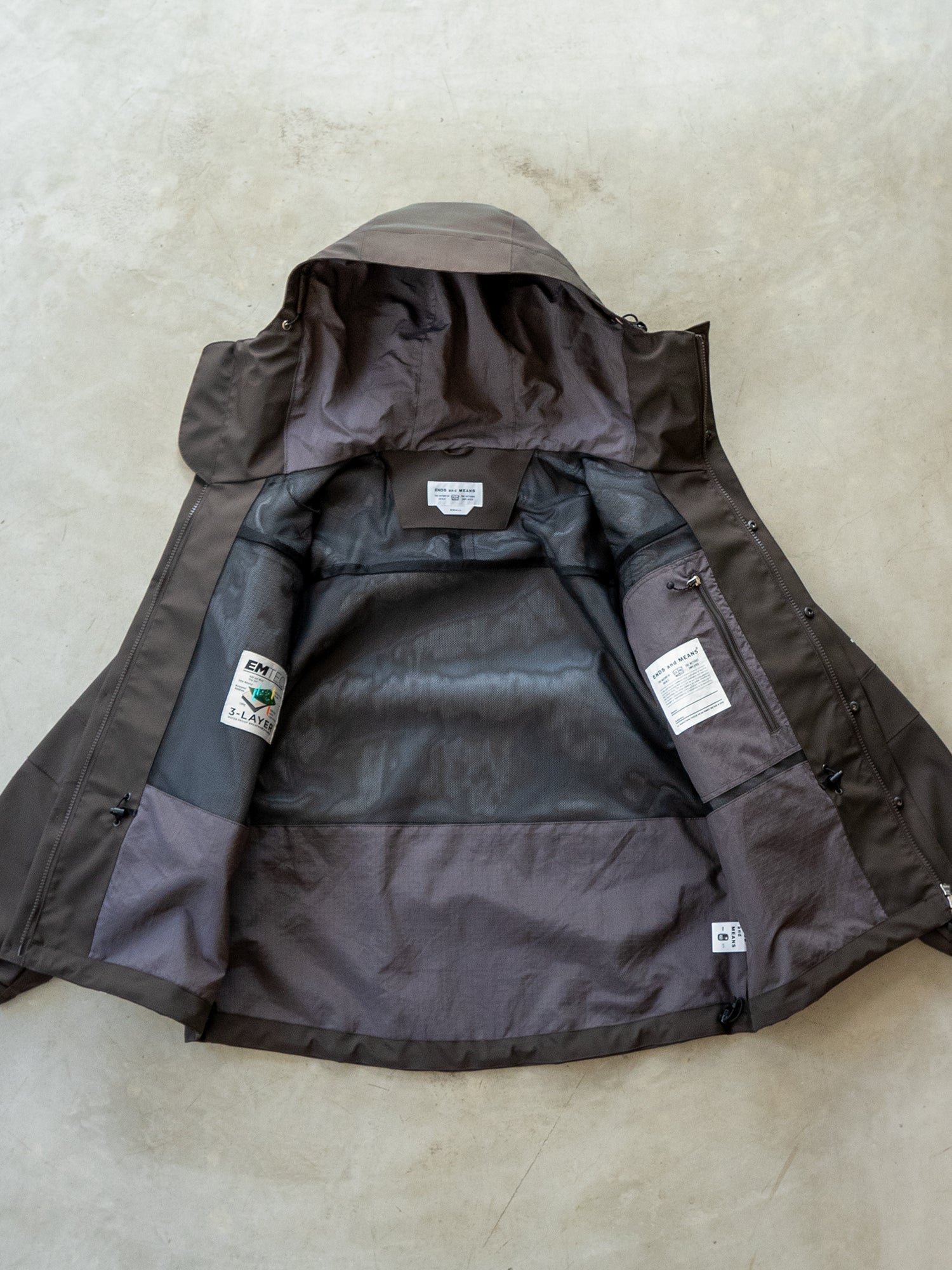 ウールxポリエステルの混紡生地を3レイヤー。ウールの艶感が独特な高級感を醸し出し、少しモードな雰囲気は見る角度によってタマムシのような色の変化を楽しめます。内側はリップストップとメッシュのポリエステル生地。脇はWジップによる開閉ベンチレーションを搭載。内外5つのポケット完備。機能的にも申し分ないディテールを搭載。フードの立ち、身幅、着丈のバランス感、着用時のシルエット、実用性などを数年研究し、影響を受けた90年代のアウトドアスタイルを細部に踏襲。EMの哲学を落とし込んだプロダクト。