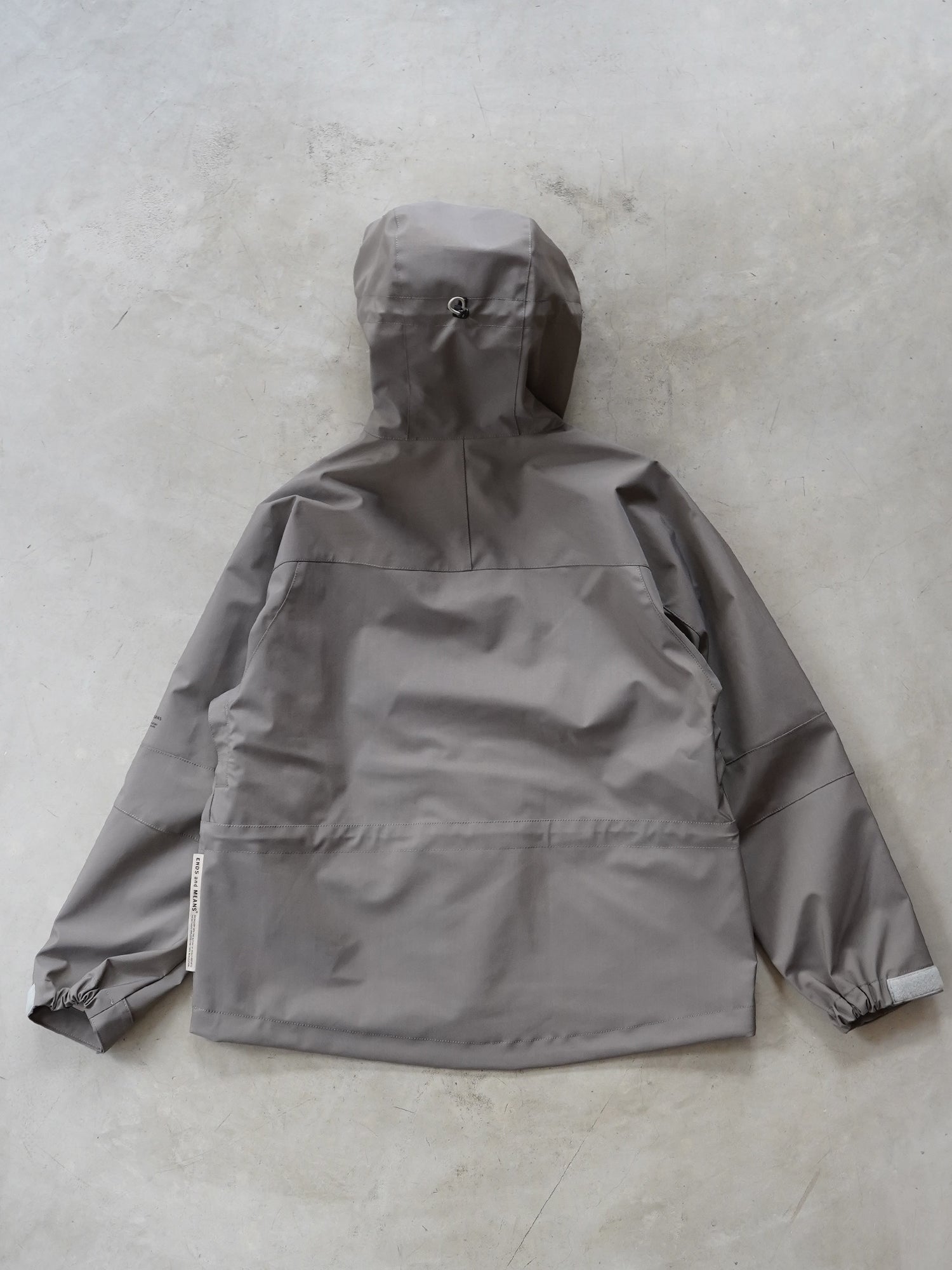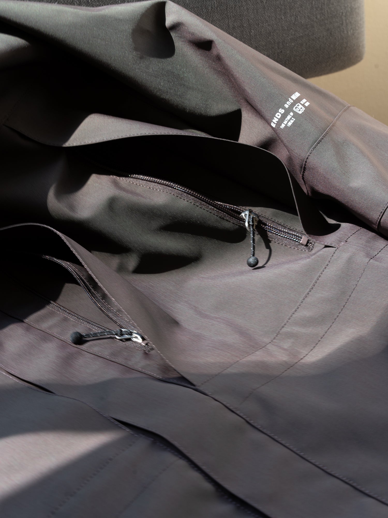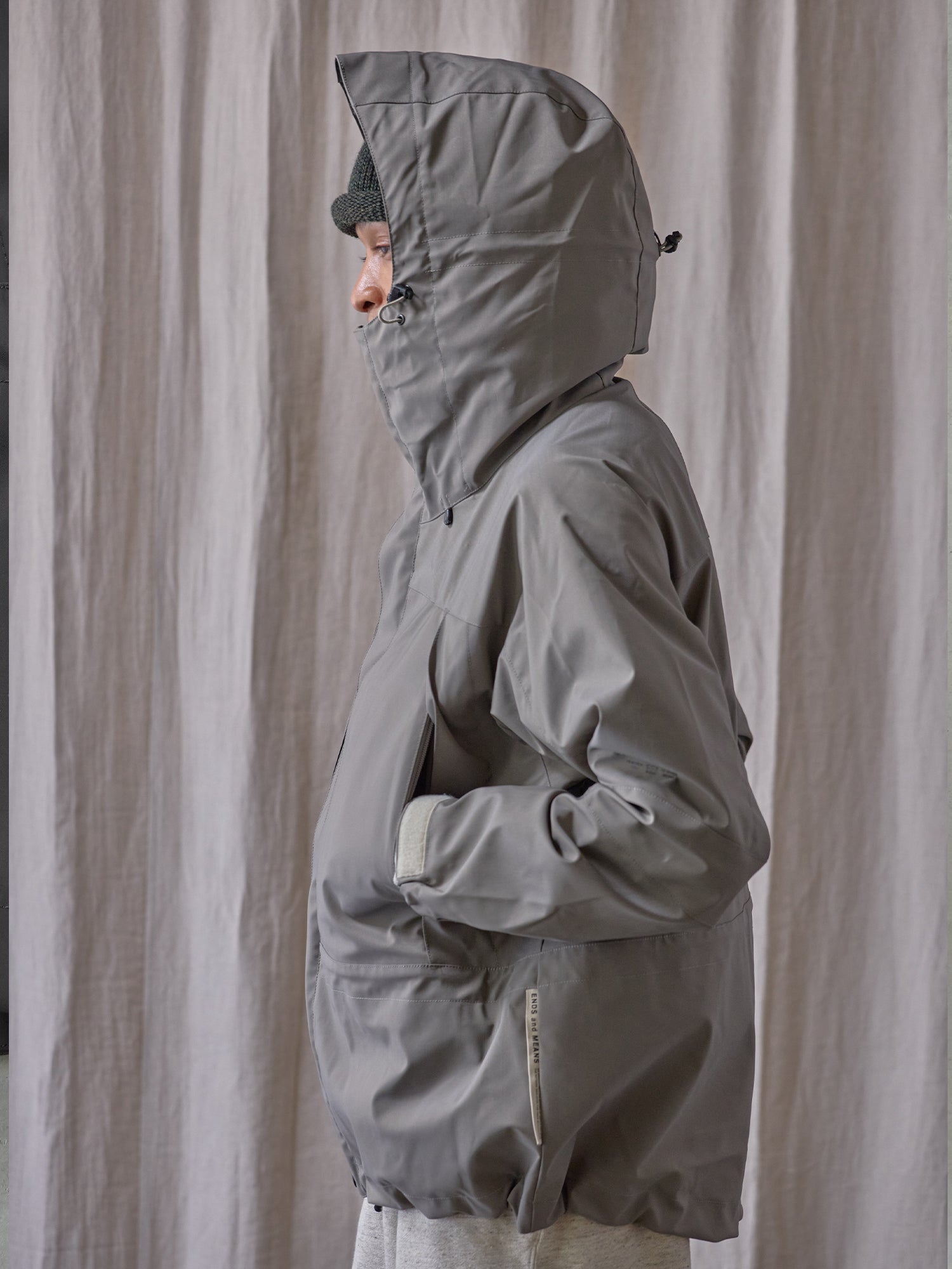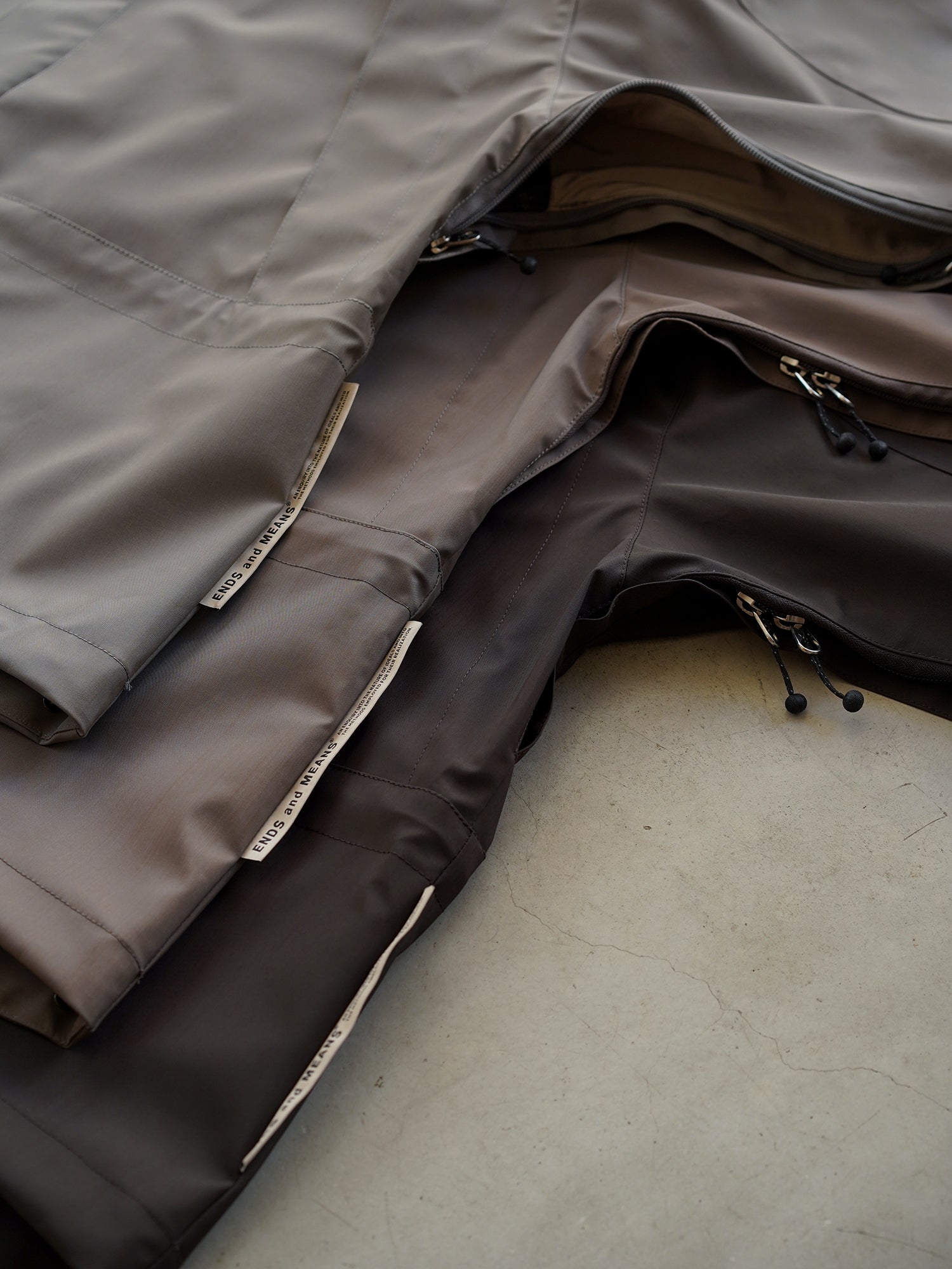 ウールxポリエステルの混紡生地を3レイヤー。ウールの艶感が独特な高級感を醸し出し、少しモードな雰囲気は見る角度によってタマムシのような色の変化を楽しめます。内側はリップストップとメッシュのポリエステル生地。脇はWジップによる開閉ベンチレーションを搭載。内外5つのポケット完備。機能的にも申し分ないディテールを搭載。フードの立ち、身幅、着丈のバランス感、着用時のシルエット、実用性などを数年研究し、影響を受けた90年代のアウトドアスタイルを細部に踏襲。EMの哲学を落とし込んだプロダクト。