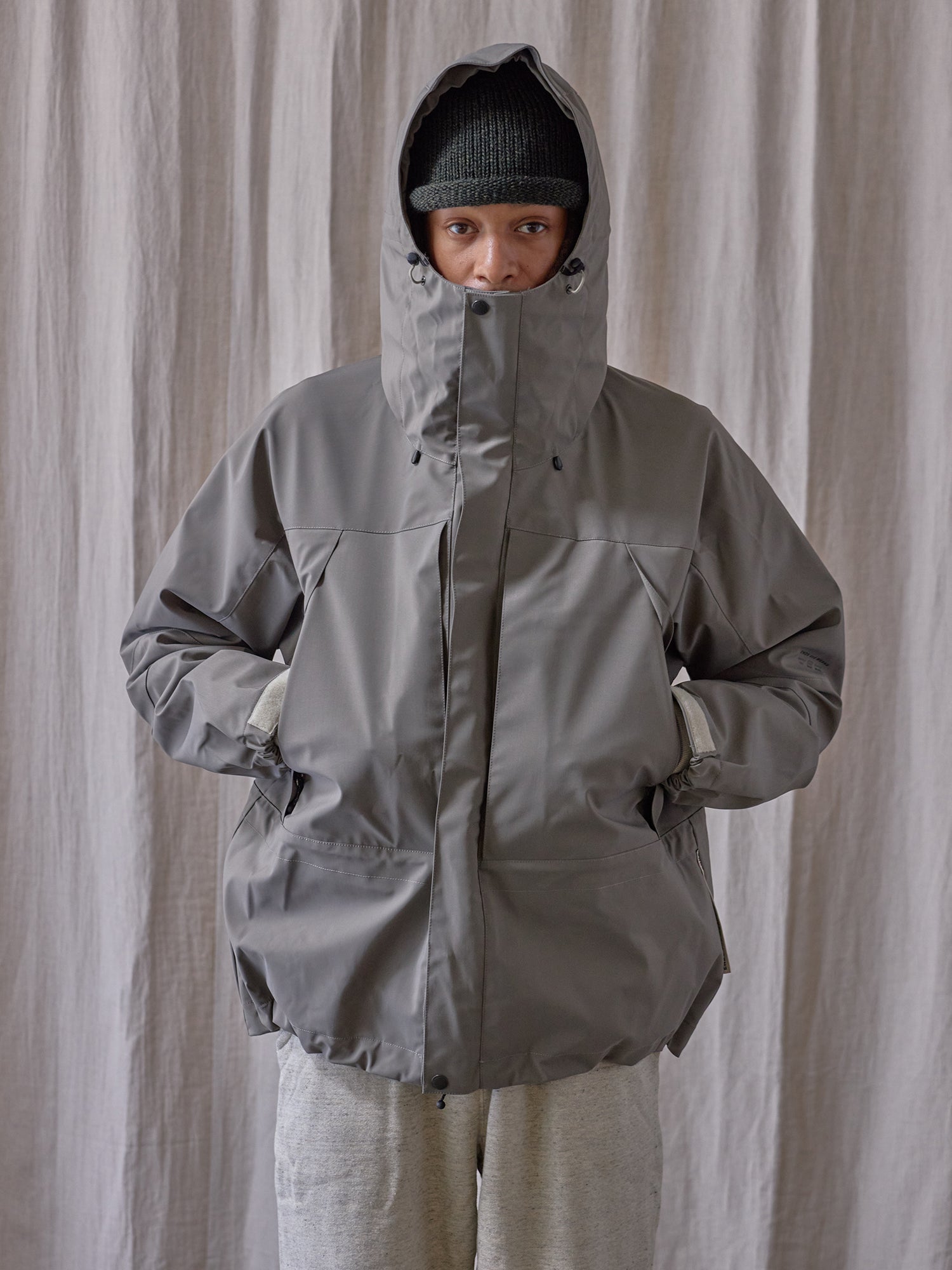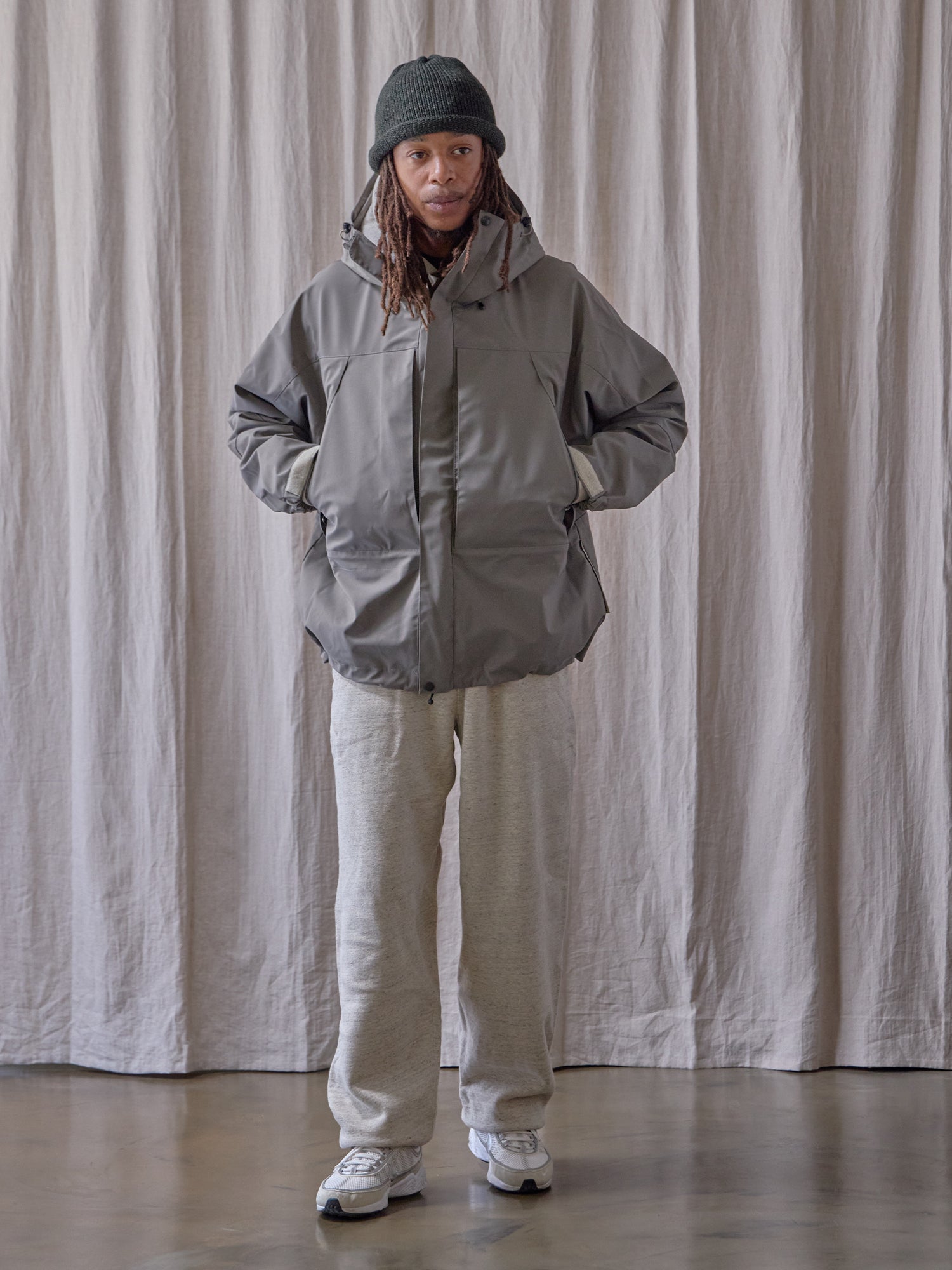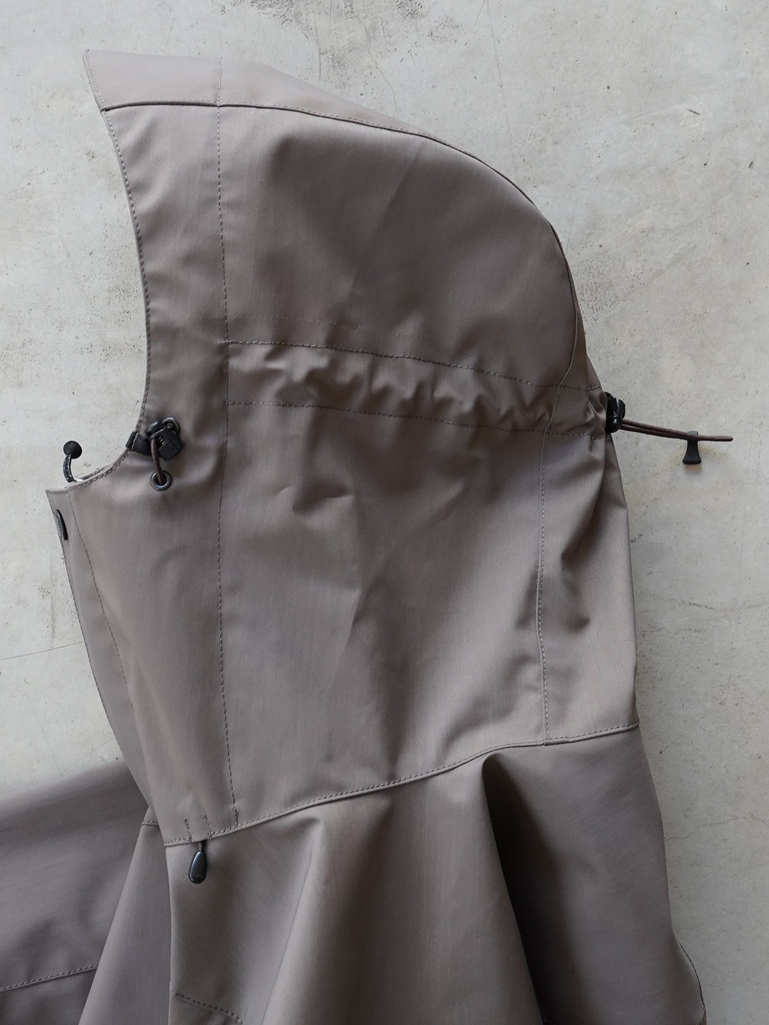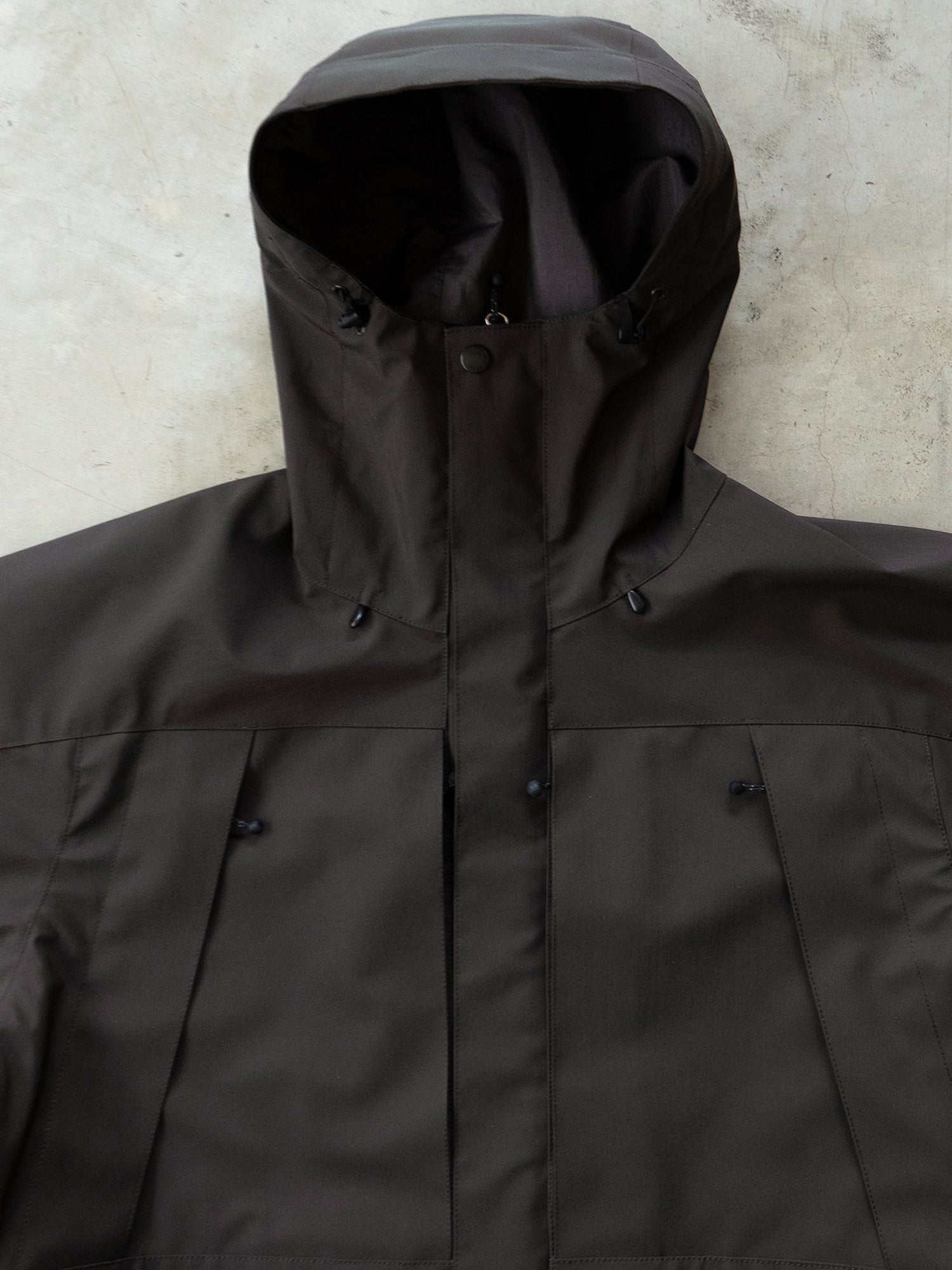 ウールxポリエステルの混紡生地を3レイヤー。ウールの艶感が独特な高級感を醸し出し、少しモードな雰囲気は見る角度によってタマムシのような色の変化を楽しめます。内側はリップストップとメッシュのポリエステル生地。脇はWジップによる開閉ベンチレーションを搭載。内外5つのポケット完備。機能的にも申し分ないディテールを搭載。フードの立ち、身幅、着丈のバランス感、着用時のシルエット、実用性などを数年研究し、影響を受けた90年代のアウトドアスタイルを細部に踏襲。EMの哲学を落とし込んだプロダクト。