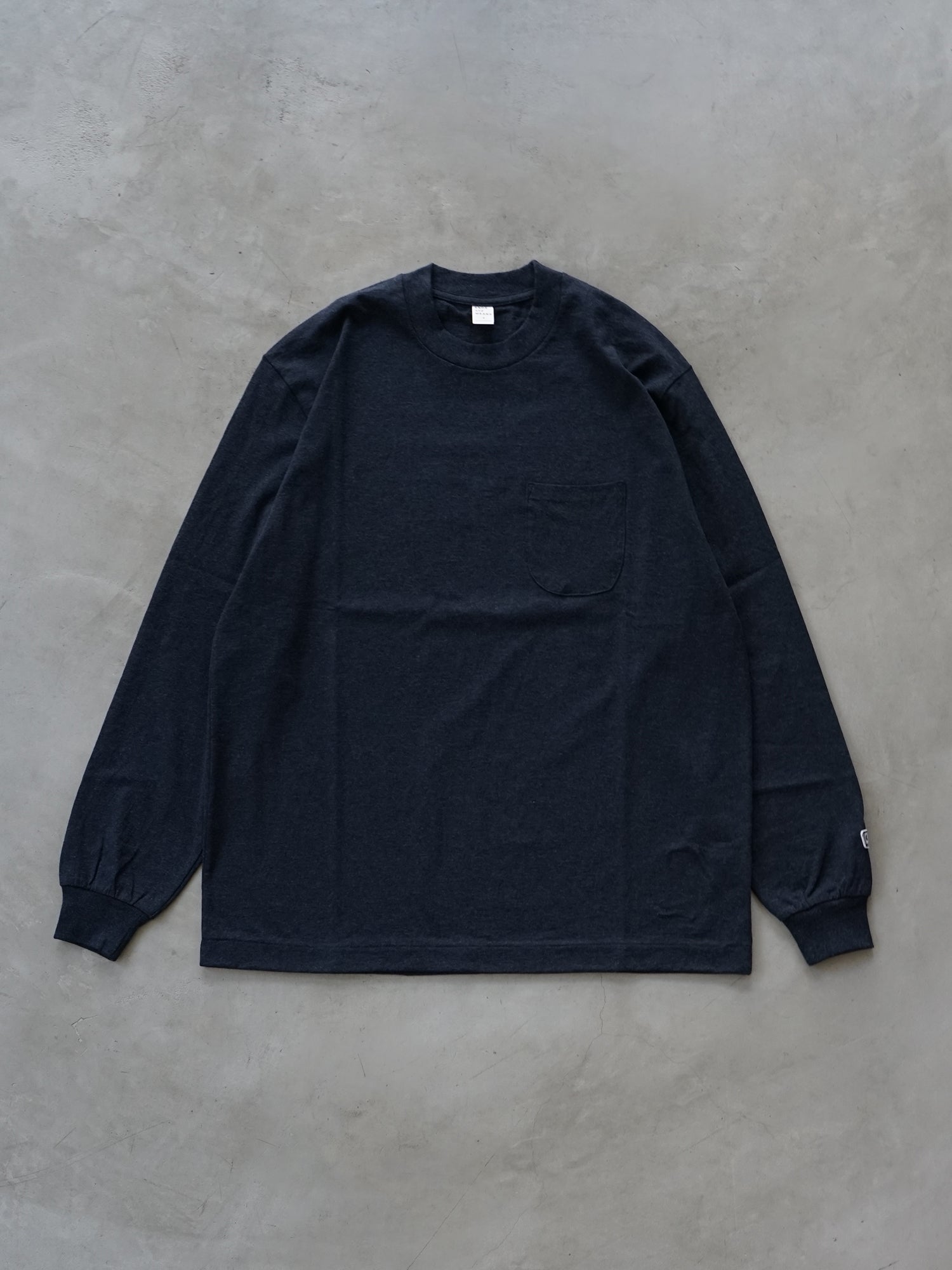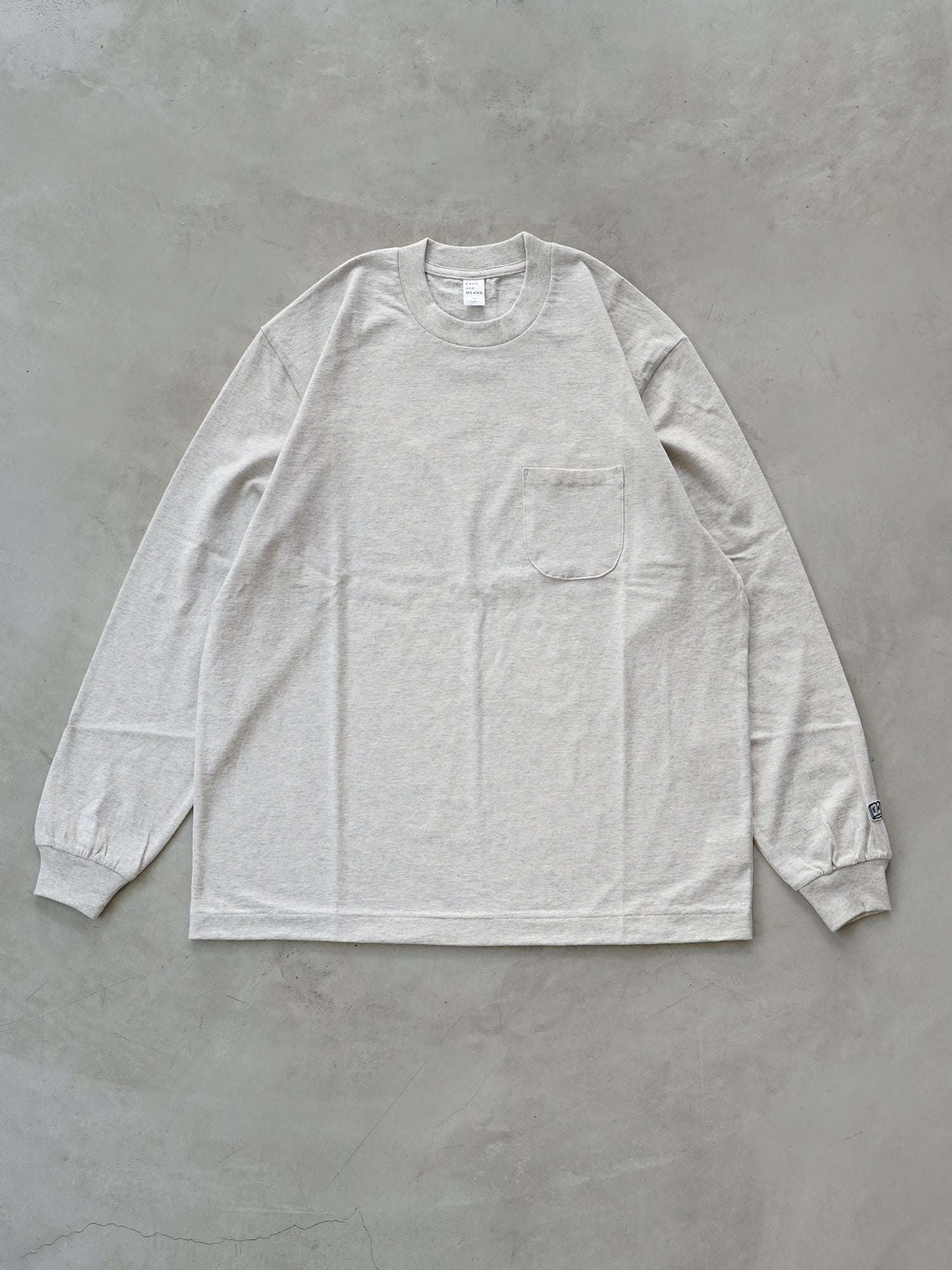 Standard pocket L/S tee, made of top yarn jersey of just the right thickness. The shape is stopped at a good point so that it will never go out of fashion. The neck is tight at first, but it is designed to fit in as you wear it. A convenient item that can be used all year round. One-washed.