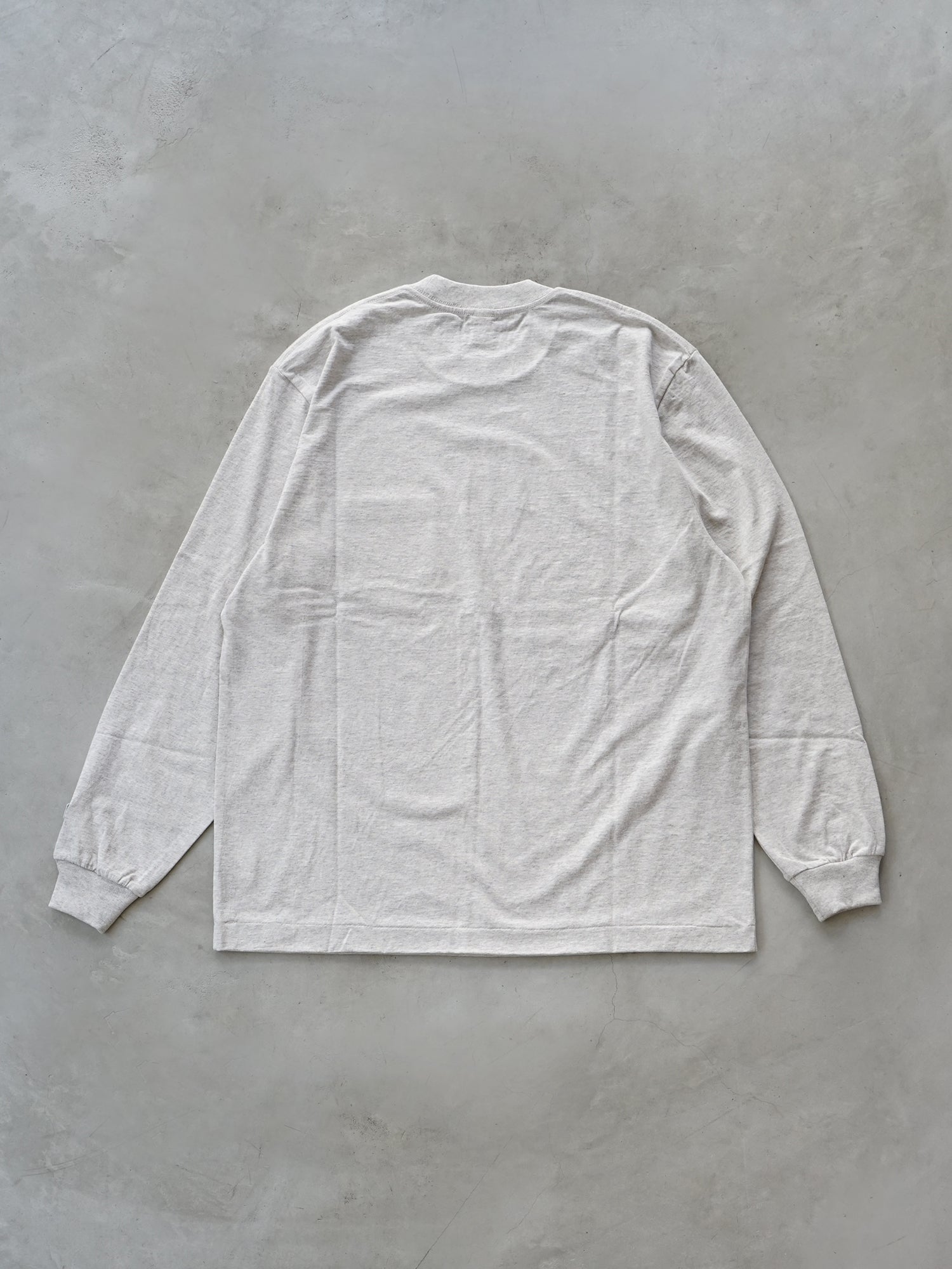定番のポケットL/S tee。Top糸を使った丁度良い厚みの天竺使用。形は流行り廃りのないよう丁度良いところで止めております。拘りのネック部分は初めはタイトですが、着て行くうちに馴染むよう設計されております。年中使える便利なアイテムです。ワンウォッシュ済。