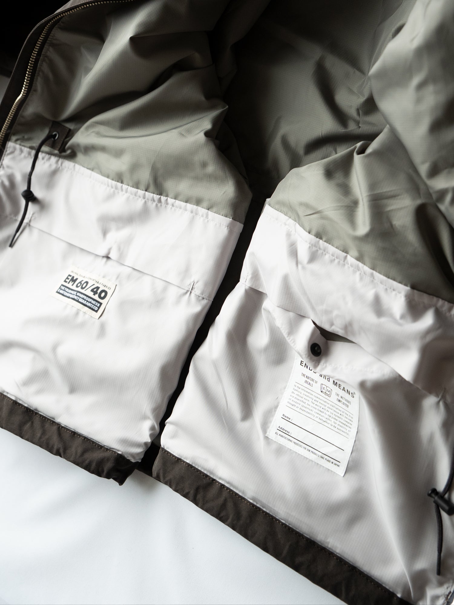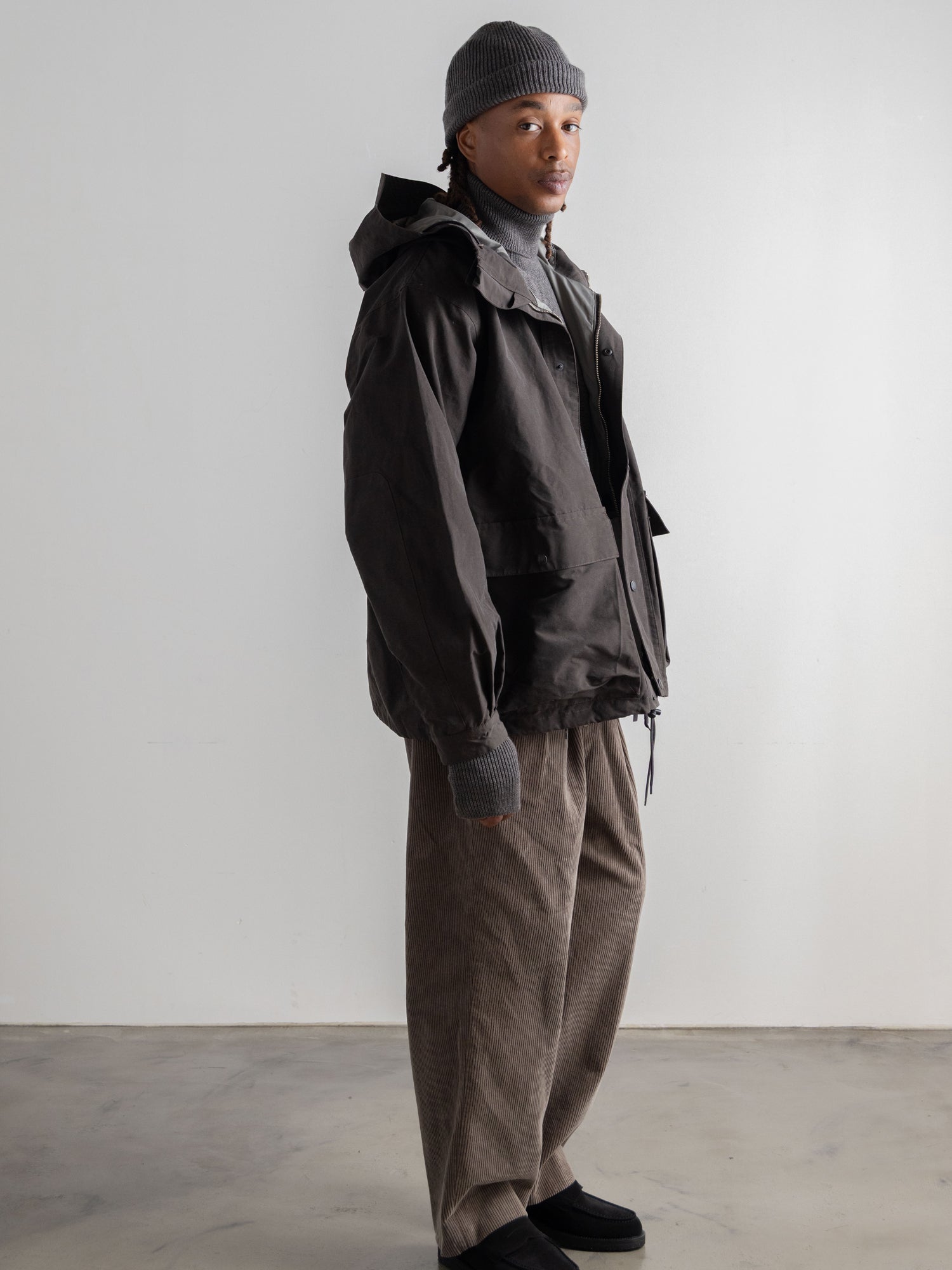 防寒性が高いので中に当社のQuilting vestや厚手のニットなどを着れば真冬でも快適に過ごせ、裾、腰などをスピンドルで絞れるので様々な着方が楽しめる1着。