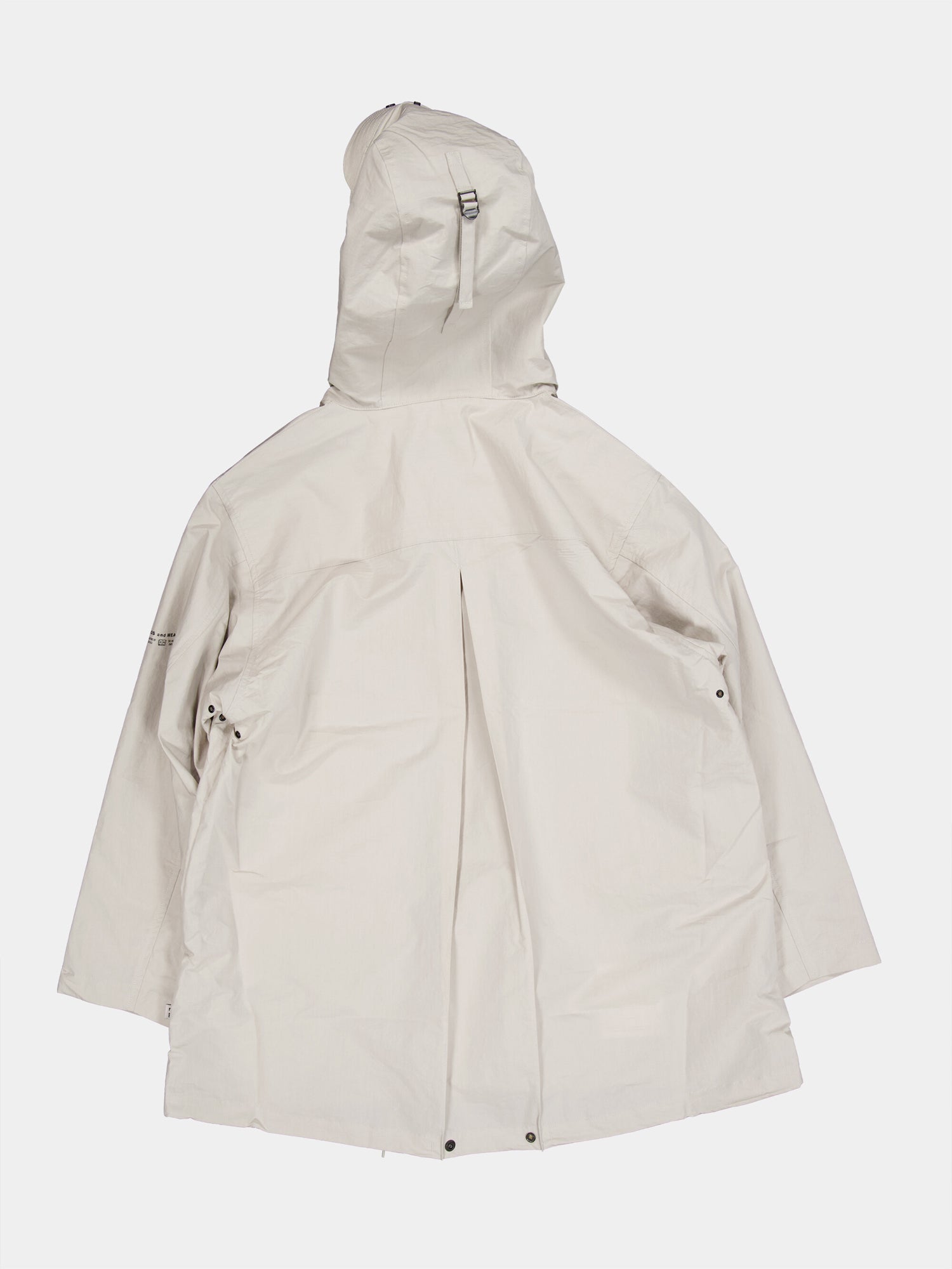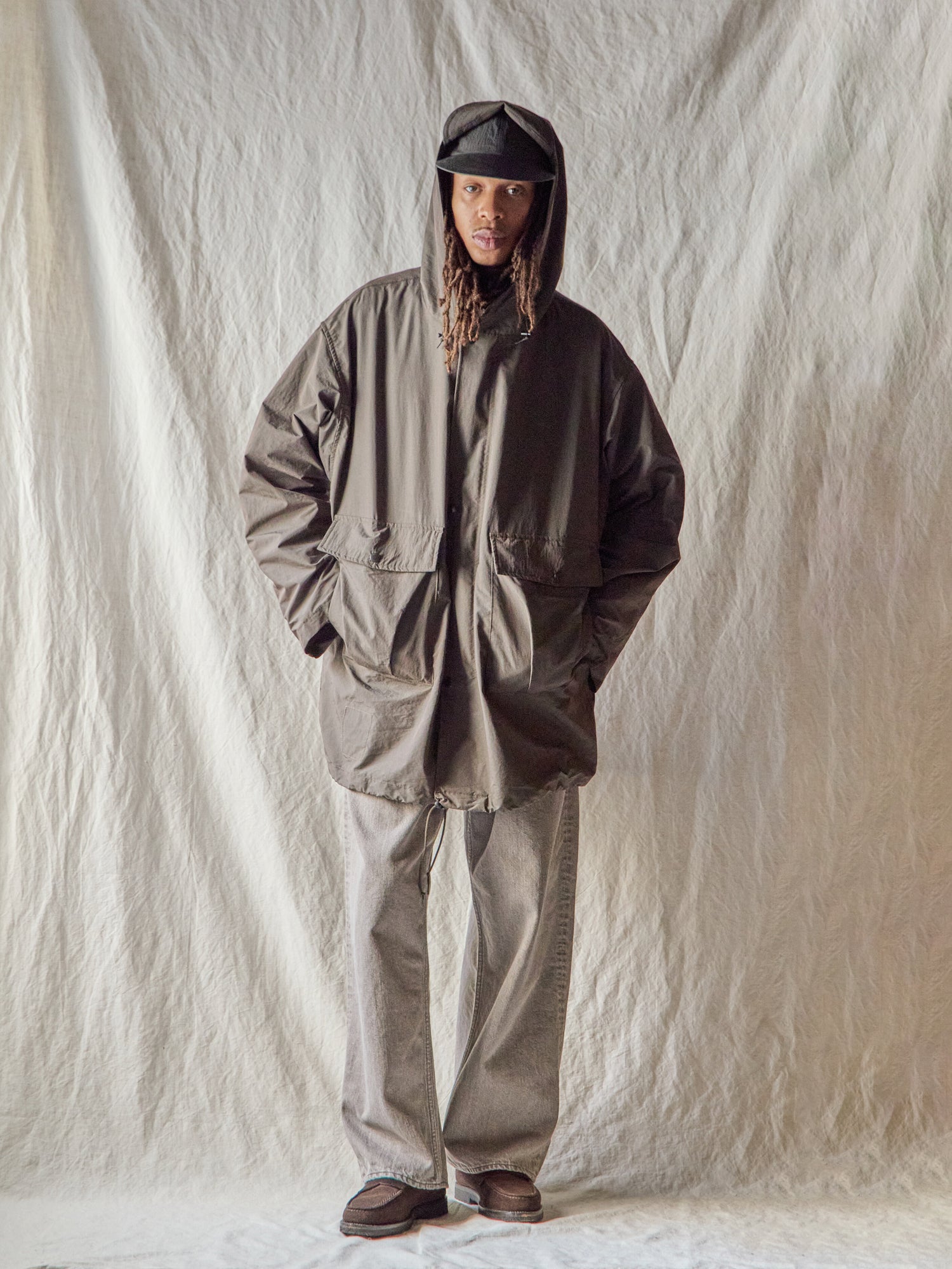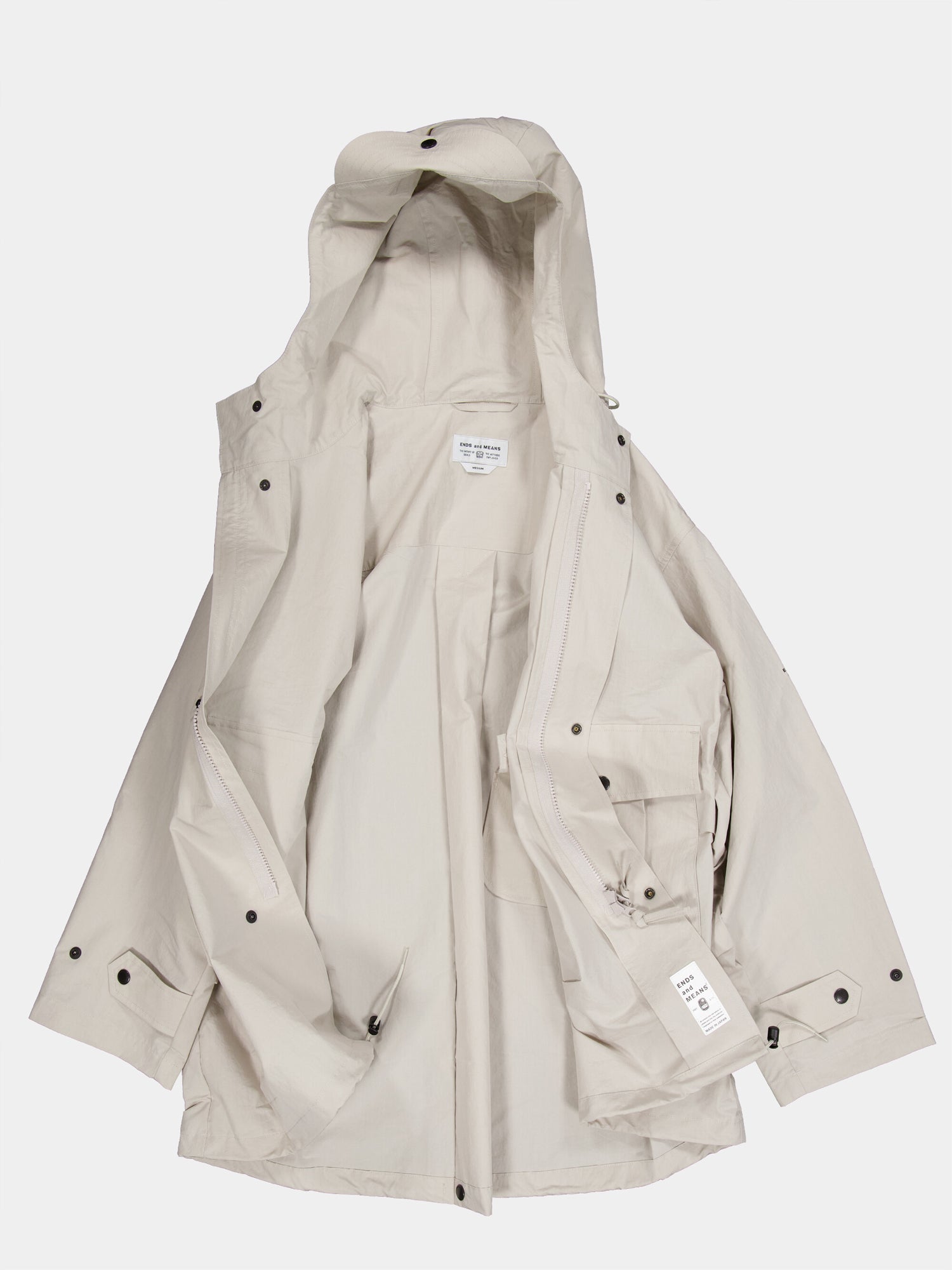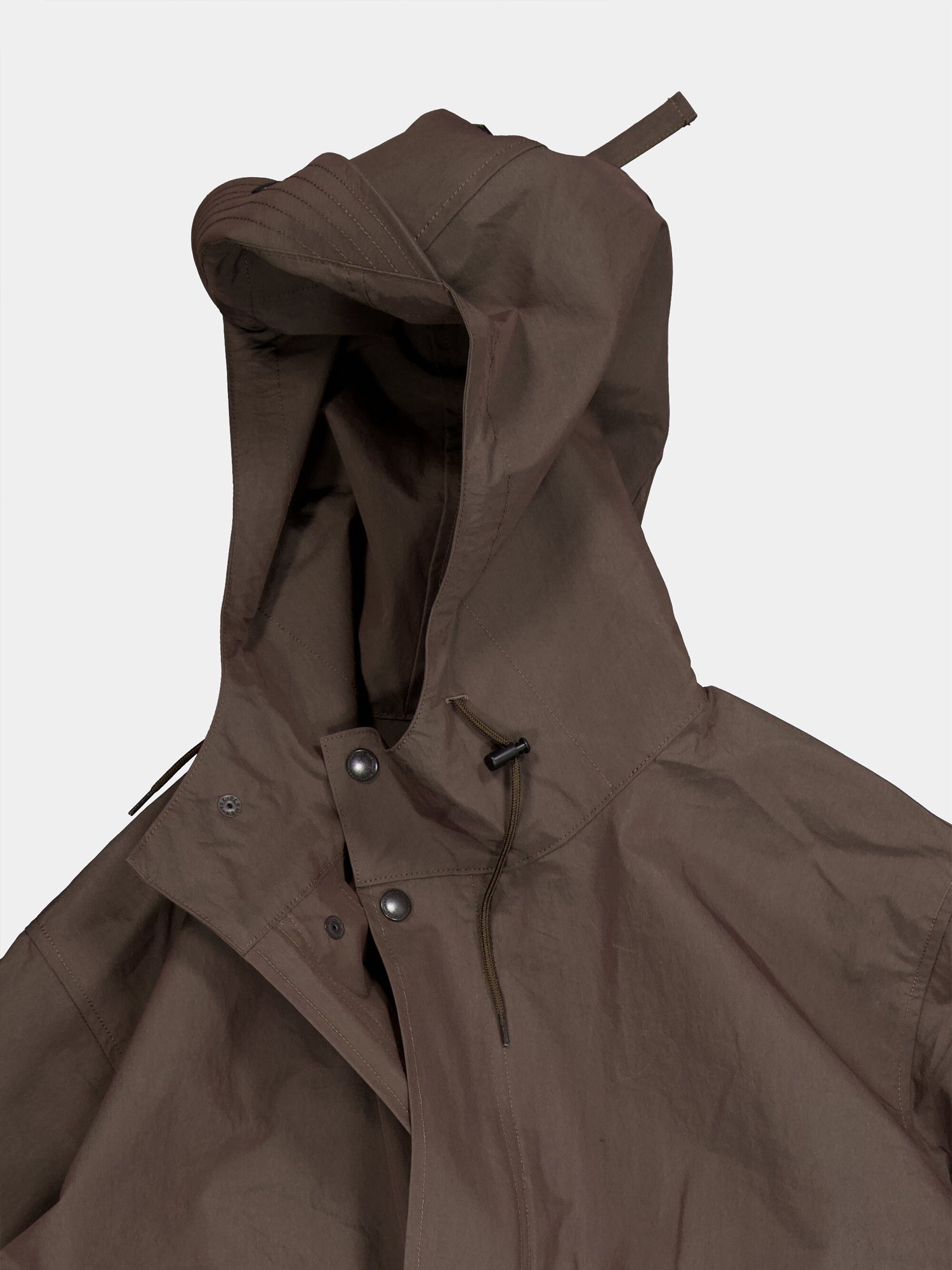 撥水加工したクリスピーな質感の高密度コットンナイロン60/40ウェザー生地を使用したハーフ丈パーカー。